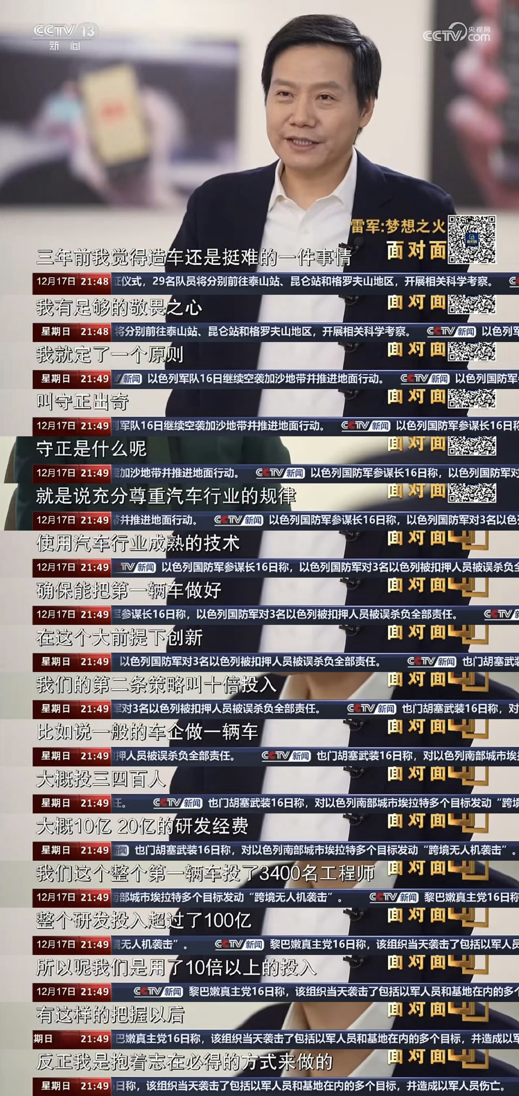 “我们决定不走捷径,不收购、不代工,从核心技术做起,10倍投入,认认真真造一辆好车。比如一般车企造一辆车,大概投三四百人,10亿、20亿的研发经费;我们第一辆车投了3400名工程师,研发投入超100亿,是十倍以上的投入。有这样的把握以后,反正我是抱着志在必得的方式来做的。”