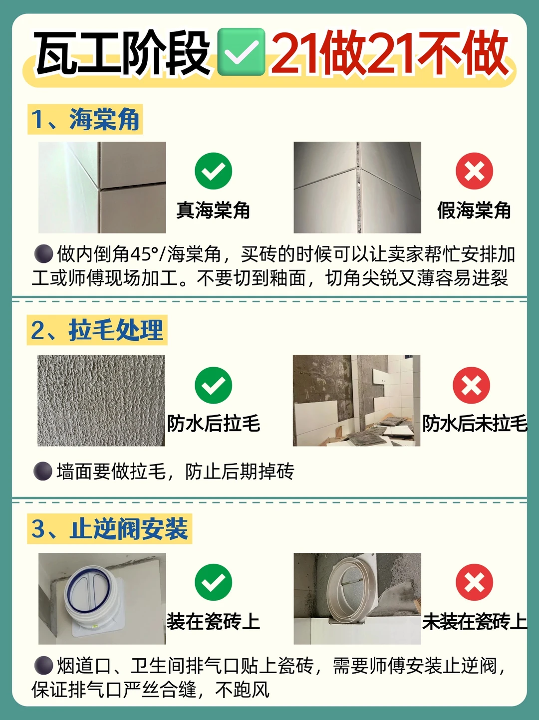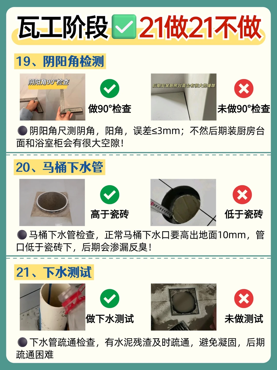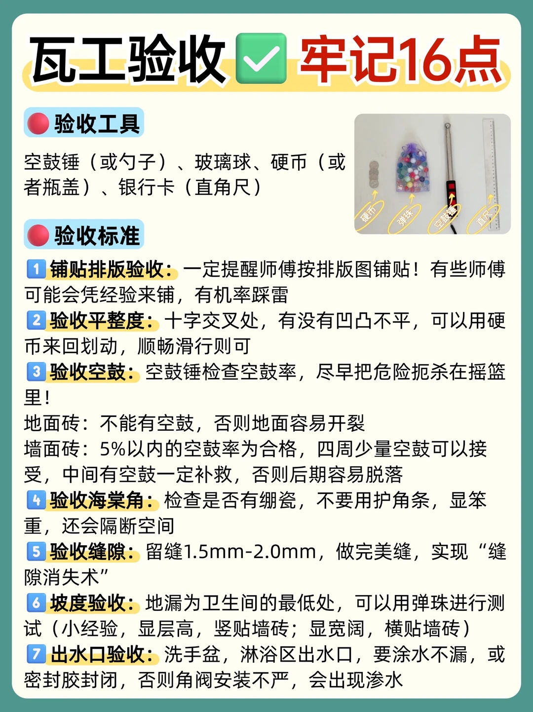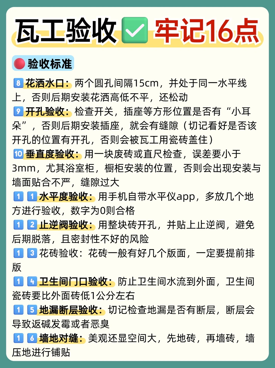 🙋‍♀️新手装修一定要提前看攻略,尤其是瓦工阶段,要和师傅沟通好这21件事!否则后悔都来不及! ✅16个验收标准 1️⃣铺贴排版验收:一定提醒师傅按排版图铺贴!有些师傅可能会凭经验来铺,有机率踩雷 2️⃣验收平整度:十字交叉处,有没有凹凸不平,可以用硬币来回划动,顺畅滑行则可 3️⃣验收空鼓:空鼓锤检查空鼓率,尽早把危险扼杀在摇篮里! 地面砖:不能有空鼓,否则地面容易开裂 墙面砖:5%以内的空鼓率为合格,四周少量空鼓可以接受,中间有空鼓一定补救,否则后期容易脱落 4️⃣验收海棠角:检查是否有绷瓷,不要用护角条,显笨重,还会隔断空间 5️⃣验收缝隙:留缝1.5mm-2.0mm,做完美缝,实现“缝隙消失术” 6️⃣坡度验收:地漏为卫生间的最低处,可以用弹珠进行测试(小经验,显层高,竖贴墙砖;显宽阔,横贴墙砖) 7️⃣出水口验收:洗手盆,淋浴区出水口,要涂水不漏,或密封胶封闭,否则角阀安装不严,会出现渗水 8️⃣花洒水口:两个圆孔间隔15cm,并处于同一水平线上,否则后期安装花洒高低不平,还松动 9️⃣开孔验收:检查开关,插座等方形位置是否有“小耳朵”,否则后期安装插座,就会有缝隙(切记看好是否该开孔的位置有开孔,否则会被瓦工用瓷砖盖住) 🔟垂直度验收:用一块废砖或直尺检查,误差要小于3mm,尤其浴室柜,橱柜安装的位置,否则会出现安装与墙面贴合不严,缝隙过大 1️⃣1️⃣水平度验收:用手机自带水平仪app,多放几个地方进行验收,数字为0则合格 1️⃣2️⃣止逆阀验收:用整块砖开孔,并贴上止逆阀,避免后期脱落,且密封性不好的风险 1️⃣3️⃣花砖验收:花砖一般有好几个版面,一定要提前排版 1️⃣4️⃣卫生间门口验收:防止卫生间水流到外面,卫生间瓷砖要比外面砖低1公分左右 1️⃣5️⃣地漏断层验收:切记检查地漏是否有断层,断层会导致返碱发霉或者恶臭 1️⃣6️⃣墙地对缝:美观还显空间大,先地砖,再墙砖,墙压地进行铺贴