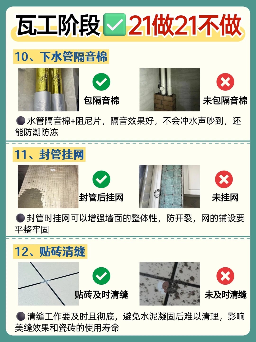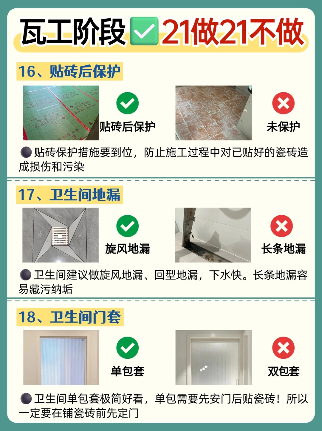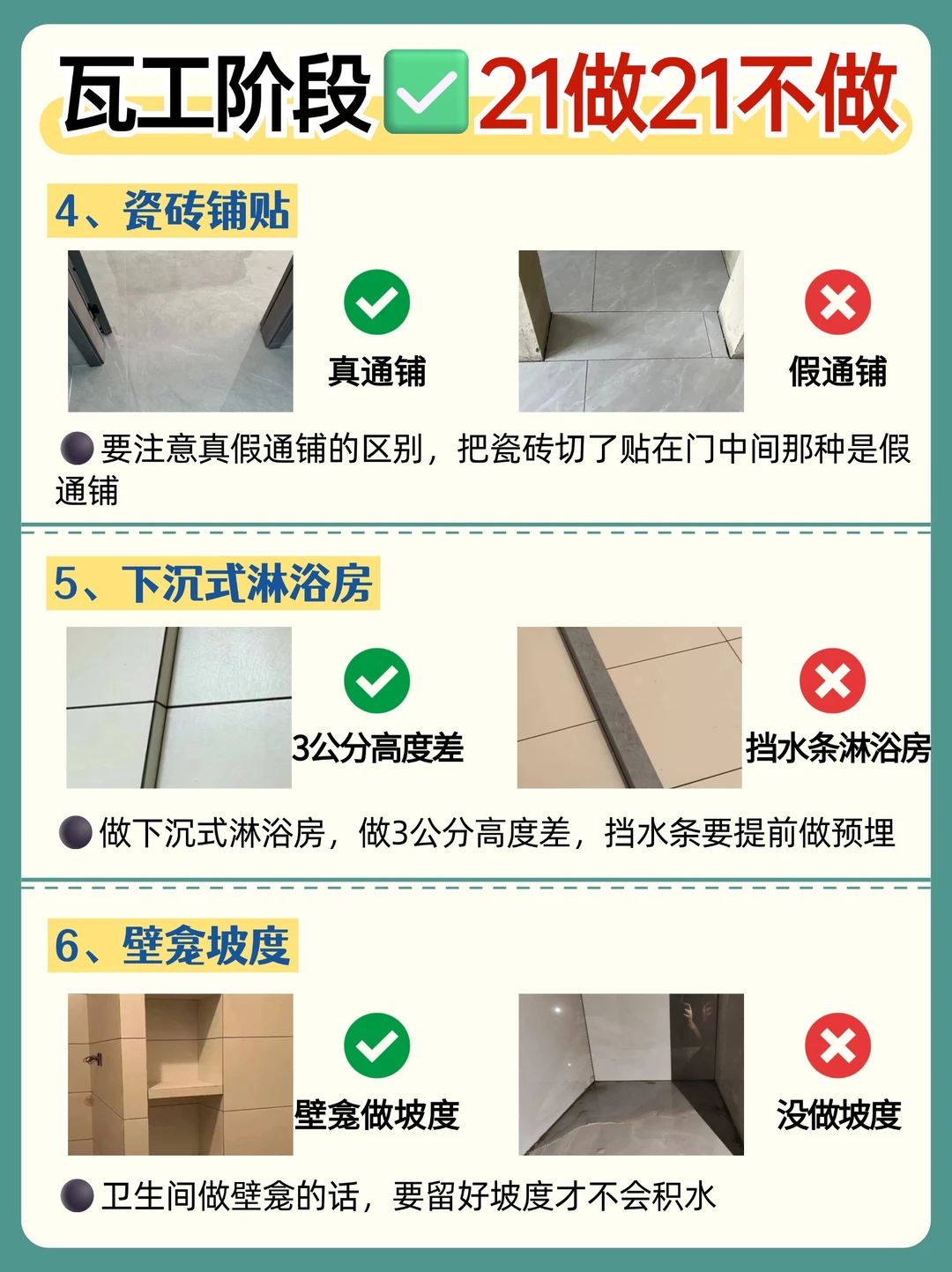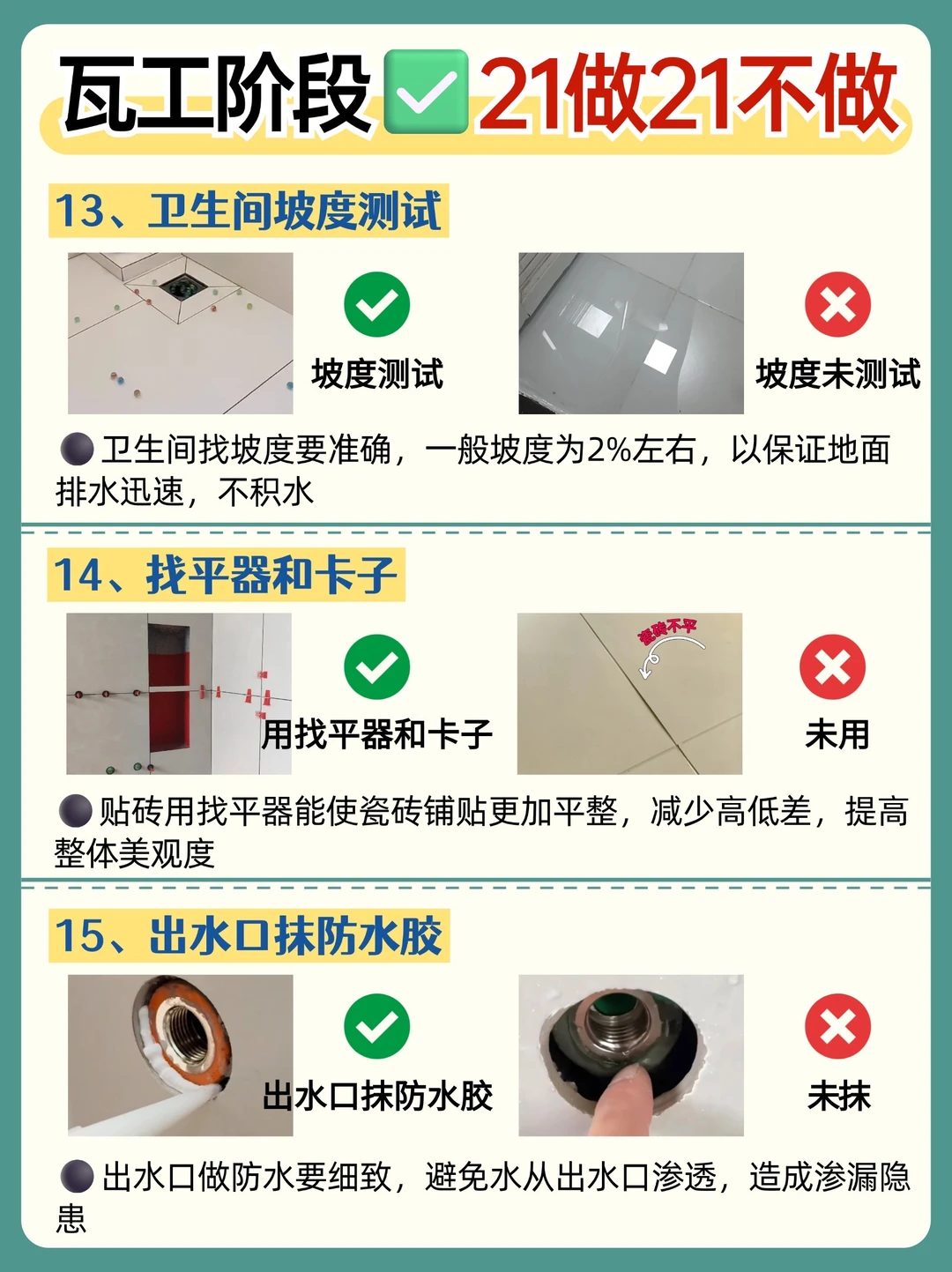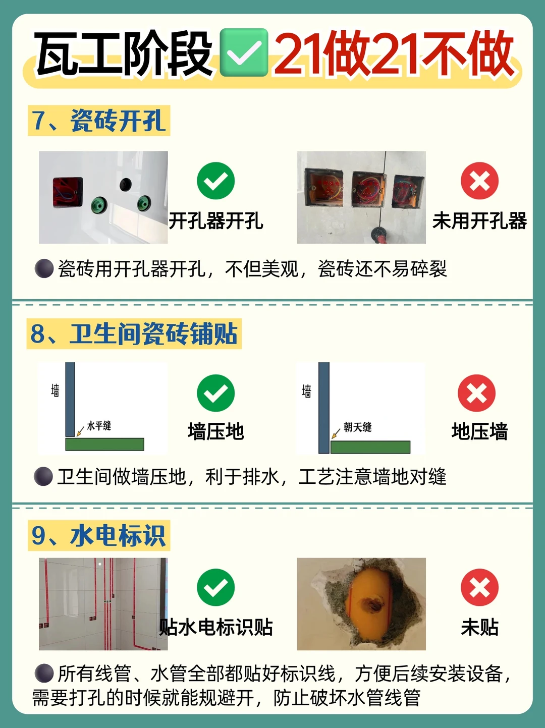 🙋‍♀️新手装修一定要提前看攻略,尤其是瓦工阶段,要和师傅沟通好这21件事!否则后悔都来不及! ✅16个验收标准 1️⃣铺贴排版验收:一定提醒师傅按排版图铺贴!有些师傅可能会凭经验来铺,有机率踩雷 2️⃣验收平整度:十字交叉处,有没有凹凸不平,可以用硬币来回划动,顺畅滑行则可 3️⃣验收空鼓:空鼓锤检查空鼓率,尽早把危险扼杀在摇篮里! 地面砖:不能有空鼓,否则地面容易开裂 墙面砖:5%以内的空鼓率为合格,四周少量空鼓可以接受,中间有空鼓一定补救,否则后期容易脱落 4️⃣验收海棠角:检查是否有绷瓷,不要用护角条,显笨重,还会隔断空间 5️⃣验收缝隙:留缝1.5mm-2.0mm,做完美缝,实现“缝隙消失术” 6️⃣坡度验收:地漏为卫生间的最低处,可以用弹珠进行测试(小经验,显层高,竖贴墙砖;显宽阔,横贴墙砖) 7️⃣出水口验收:洗手盆,淋浴区出水口,要涂水不漏,或密封胶封闭,否则角阀安装不严,会出现渗水 8️⃣花洒水口:两个圆孔间隔15cm,并处于同一水平线上,否则后期安装花洒高低不平,还松动 9️⃣开孔验收:检查开关,插座等方形位置是否有“小耳朵”,否则后期安装插座,就会有缝隙(切记看好是否该开孔的位置有开孔,否则会被瓦工用瓷砖盖住) 🔟垂直度验收:用一块废砖或直尺检查,误差要小于3mm,尤其浴室柜,橱柜安装的位置,否则会出现安装与墙面贴合不严,缝隙过大 1️⃣1️⃣水平度验收:用手机自带水平仪app,多放几个地方进行验收,数字为0则合格 1️⃣2️⃣止逆阀验收:用整块砖开孔,并贴上止逆阀,避免后期脱落,且密封性不好的风险 1️⃣3️⃣花砖验收:花砖一般有好几个版面,一定要提前排版 1️⃣4️⃣卫生间门口验收:防止卫生间水流到外面,卫生间瓷砖要比外面砖低1公分左右 1️⃣5️⃣地漏断层验收:切记检查地漏是否有断层,断层会导致返碱发霉或者恶臭 1️⃣6️⃣墙地对缝:美观还显空间大,先地砖,再墙砖,墙压地进行铺贴