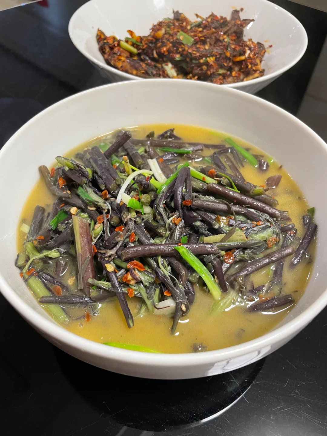 今日菜谱[庆祝R] 香煎泥鳅 清炒蕨菜(带汤版) 清炒淮山