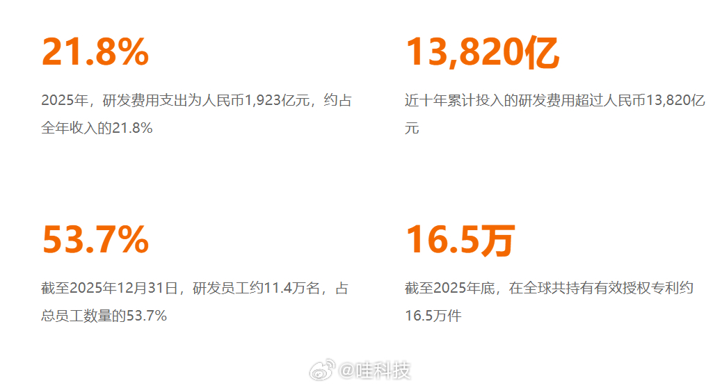 华为2025年全球销售收入达8809亿元人民币,净利润680亿元。更让人震撼的是,华为去年研发投入高达1923亿元人民币,占全年收入的21.8%,这份对技术的投入力度实属罕见。近十年,华为累计研发投入已超13820亿元,持续重仓昇腾、鲲鹏、鸿蒙、乾崑等底层核心技术,用真金白银夯实长期创新竞争力。正如孟晚舟所言:华为正坚定走向充满不确定的明天,保持战略定力,坚持战略聚焦,深耕开发者生态,走高质量发展之路。华为2025年净利润680亿华为2025年研发投入1923亿