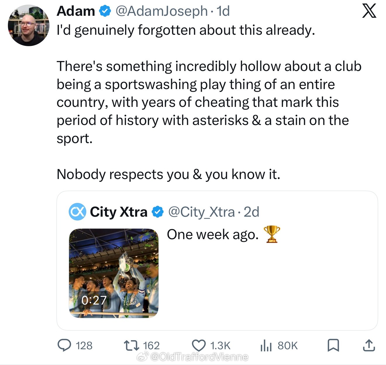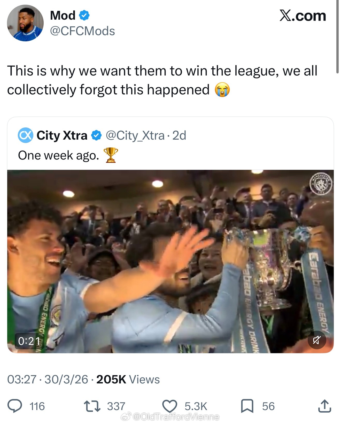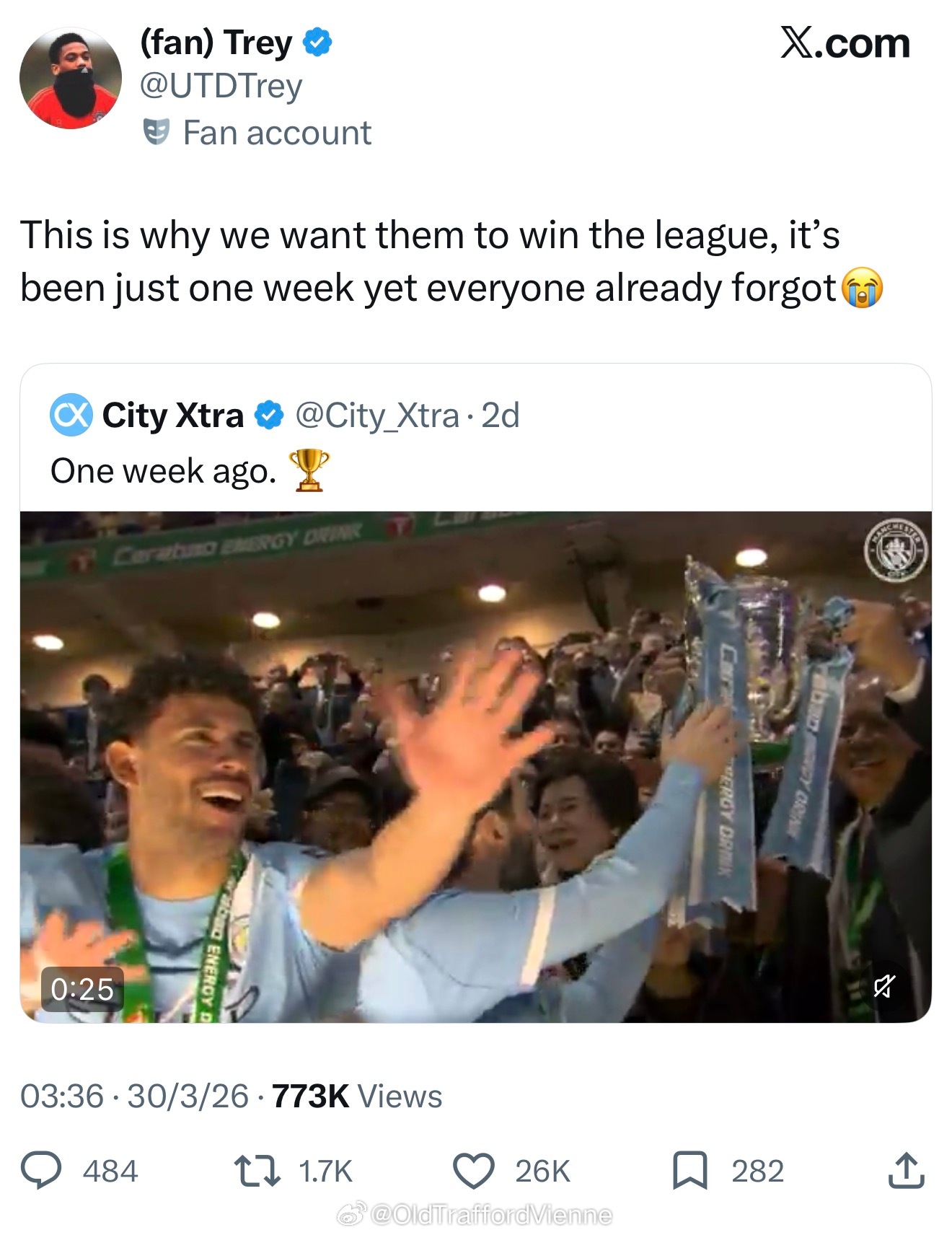 曼城大V发推:就在一周前我们举起联赛杯冠军其他球队球迷转发:这就是为什么我们希望曼城拿联赛冠军,完全不会有人记得他们拿了冠军。