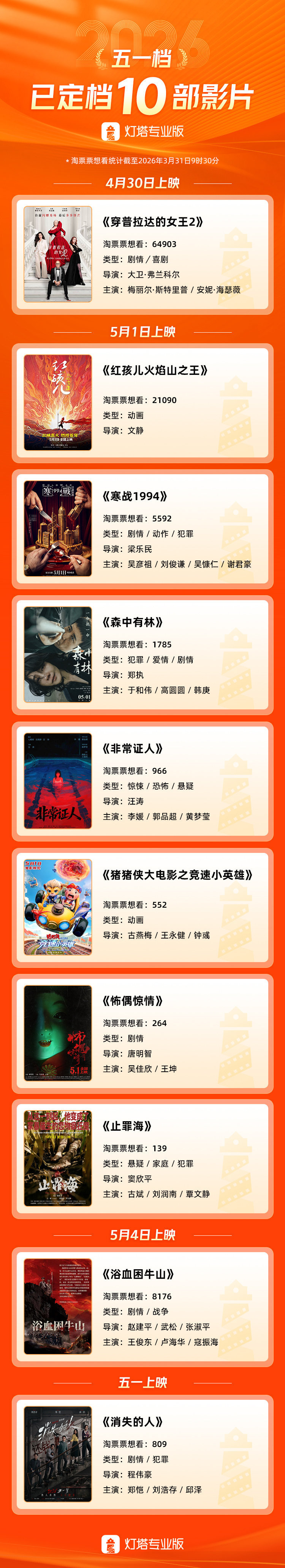 目前,已有10部影片定档五一档,包括《穿普拉达的女王2》、港片《寒战1994》、
