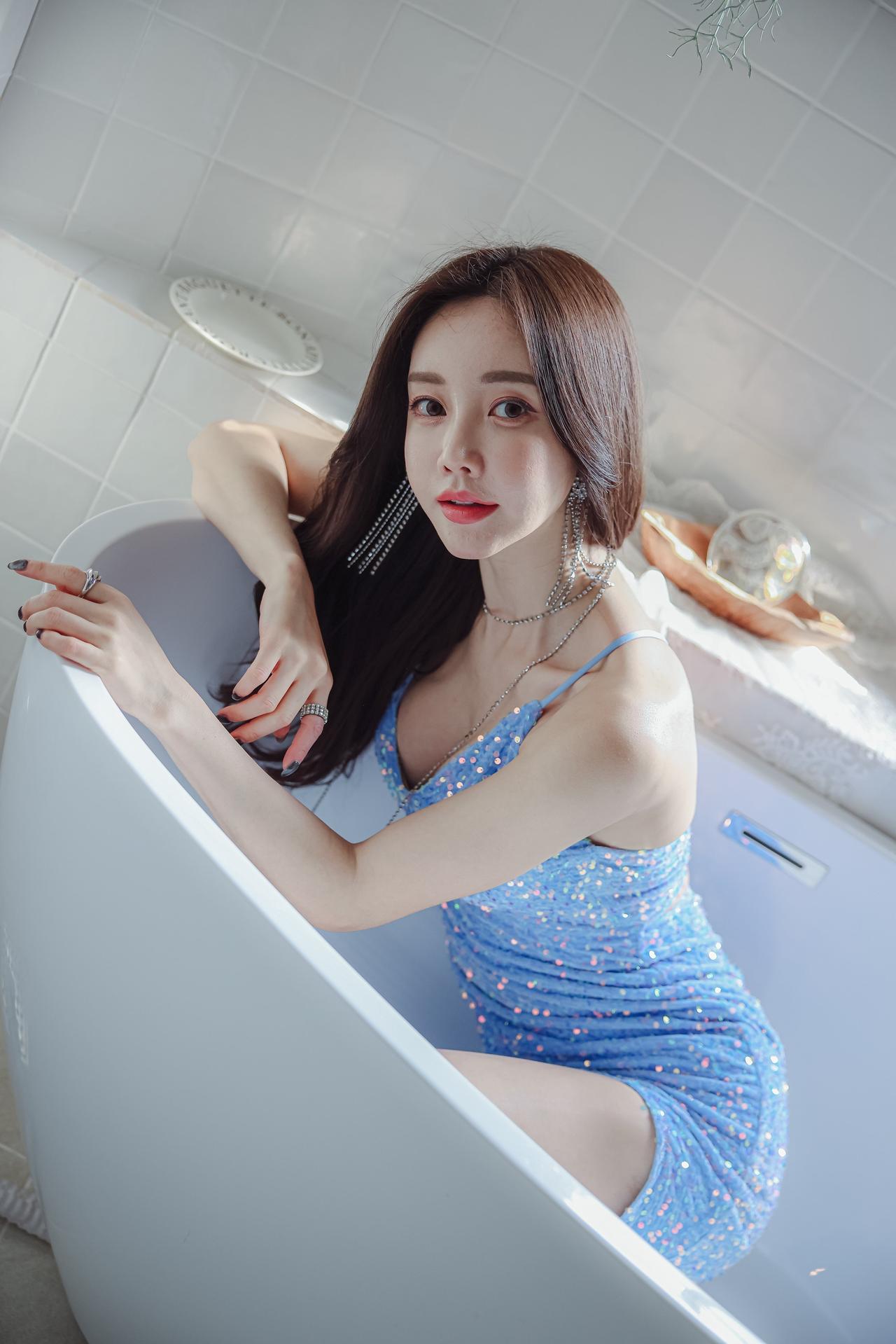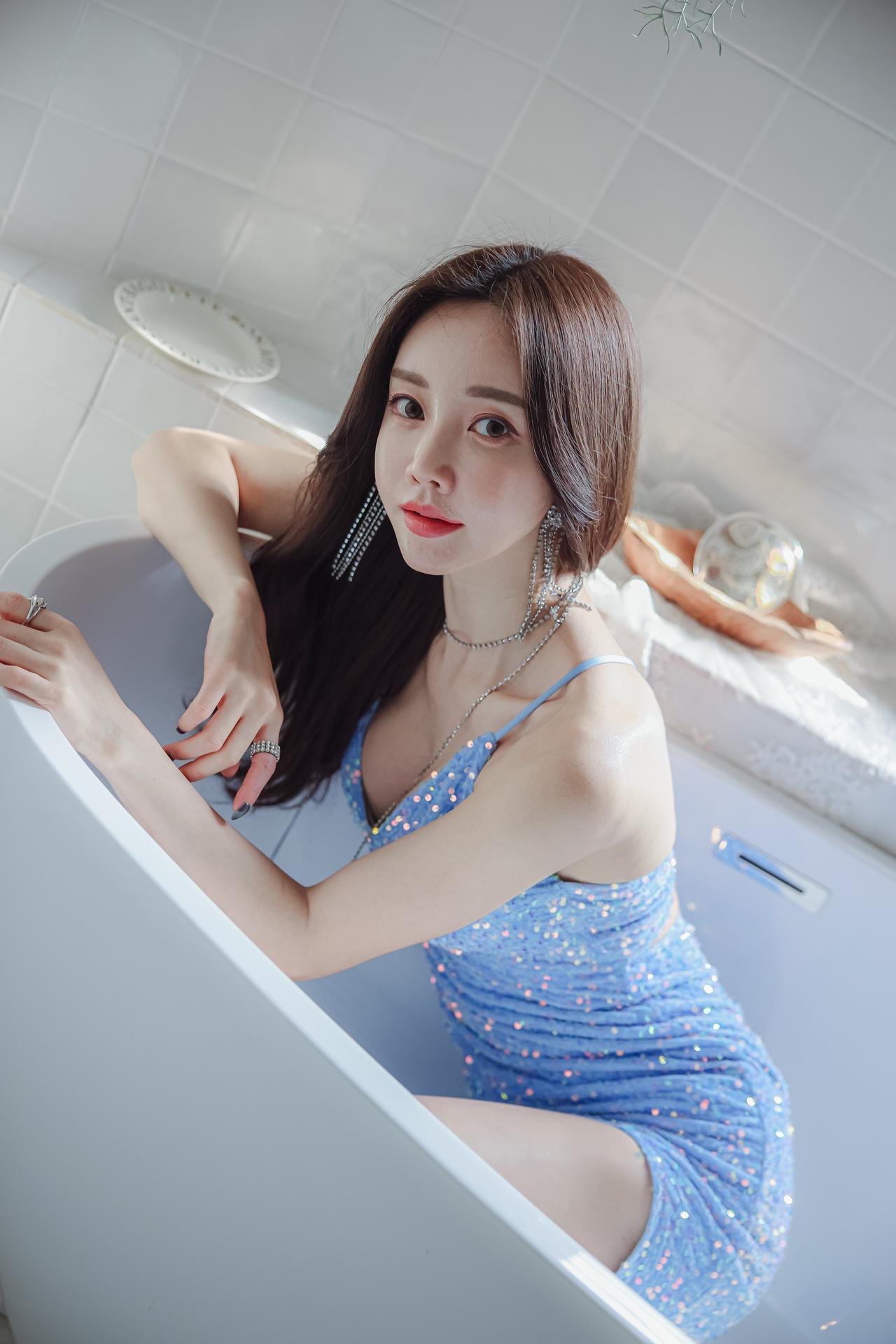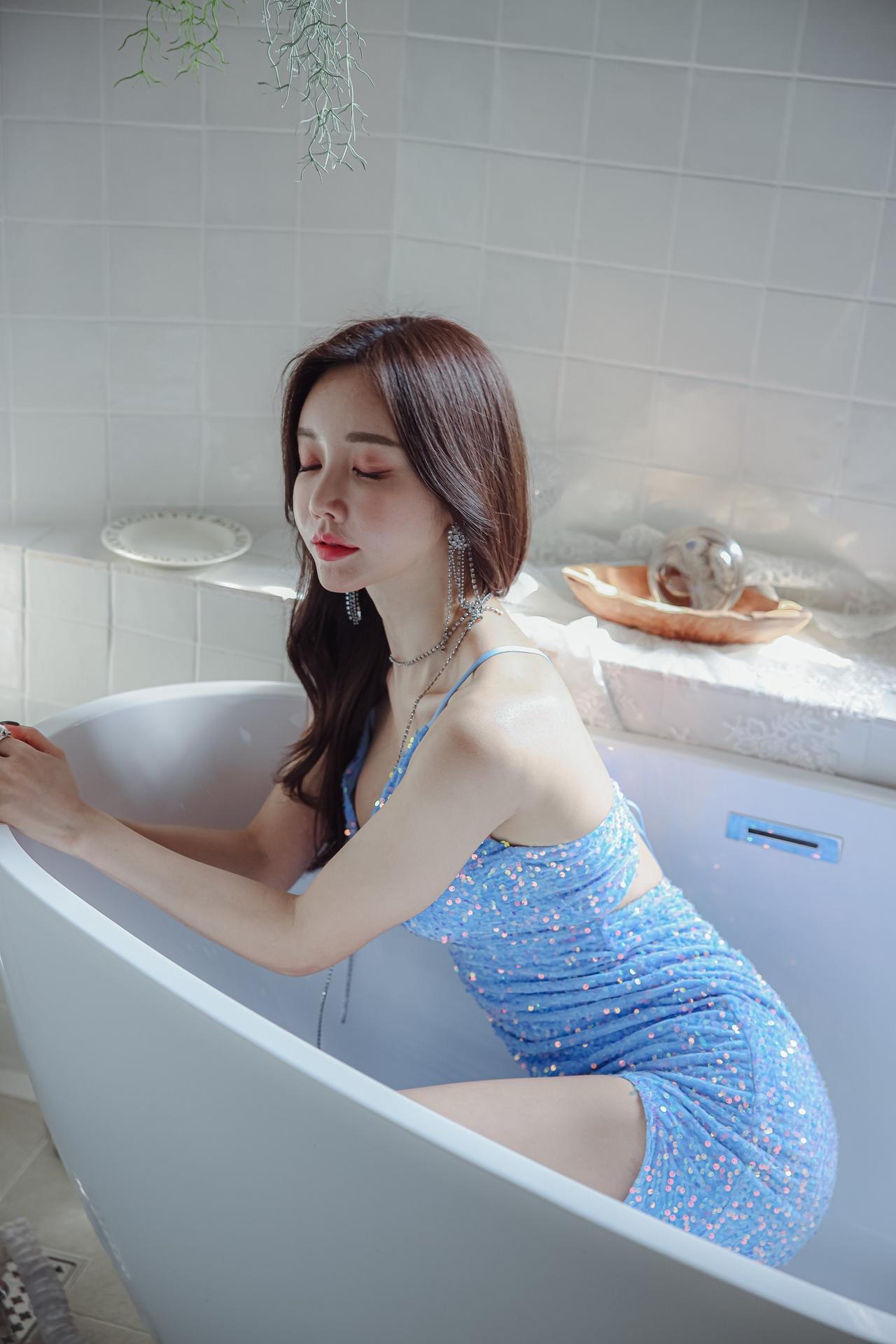 玉人浴中倚,银瓶映影斜。