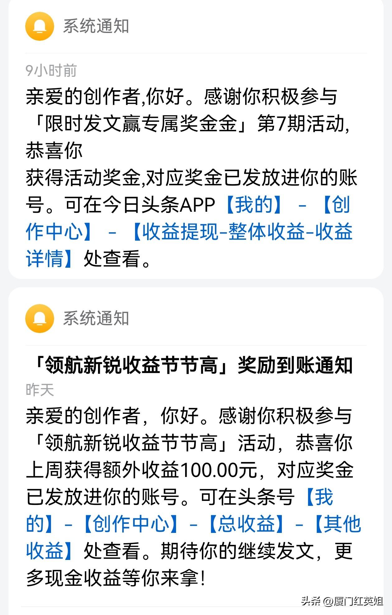 头条对新锐作者鼓励越来越好了,又被邀请参加20~26日的活动,我达到50万的阅读量,今天奖励500元到账了,而且与【领航新锐节节高】补贴活动奖励叠加,基本每周二都会获得100元的奖金。本周一共奖励600元。 越努力越幸运!喜欢这种厚积薄发的感觉!