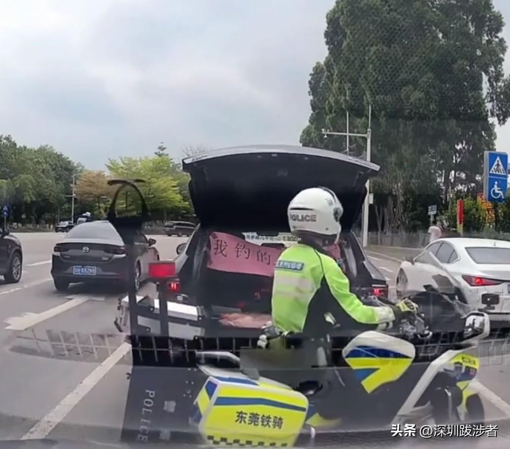 啪!东莞一条主干道的十字路口,在等红绿灯途中,前面一辆比亚迪的后备厢突然打开,一条硕大的白鲢跃入眼帘,还挂一6字条幅:我钓的,大不大。 这个钓鱼佬应该是太想与人分享他的喜悦了,按捺不住的想向路人炫耀一番自己的战绩,估计那横幅还不是事先准备的,而是钓到大鱼临时去附近广告门店制作的。 @深圳跋涉者 假如他这样一路显摆下去,轰动效应肯定有了,但是因为太吸引眼球,会不会制造交通事故就不得而知了。 幸好骑警果断出手,关闭了他的后备厢,留下““鱼香”袅袅。 其实,钓到大鱼,发发视频,还不是一样的刷刷存在感?还有鱼的来源,若是野生的,那称得上是深圳都市圈钓鱼界的传奇了;假如是花钱钓那池塘喂养的,再肥再大也没太多吸引力了。 钓鱼佬炫耀车里大鱼被路过骑警撤回晒出你的本地生活