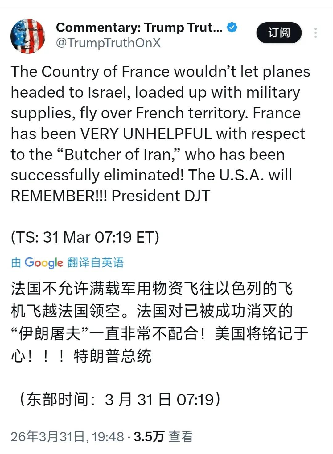 特朗普称:“法国不允许满载军用物资飞往以色列的飞机飞越法国领空。法国对已被成功消灭的“伊朗屠夫”一直非常不配合!美国将铭记于心!!” 超级大国美国被盟友拒绝使用领空,这是霸权了几十年的美国遇到了非常罕见的行为,怪不得特朗普暴躁如雷。然而,特朗普把伊朗称之为“伊朗屠夫”这有些言过其实,从美国对伊朗的军事行动看美国才更配得上这个“称呼”。 其实,在面对美国发动的伊朗战争,欧洲多数盟友几乎与美国决裂,不仅拒绝特朗普的要求在霍尔木兹海峡护航,而且还出现了意大利阻止美国轰炸机降落,西班牙对美军关闭领空,波兰拒绝爱国者导弹部署的请求等,显然昔日对美国唯唯诺诺的欧洲国家集体对美说不,特朗普也真真切切感受到了盟友的众叛亲离,你说他能不气急败坏、说话语无伦次吗?