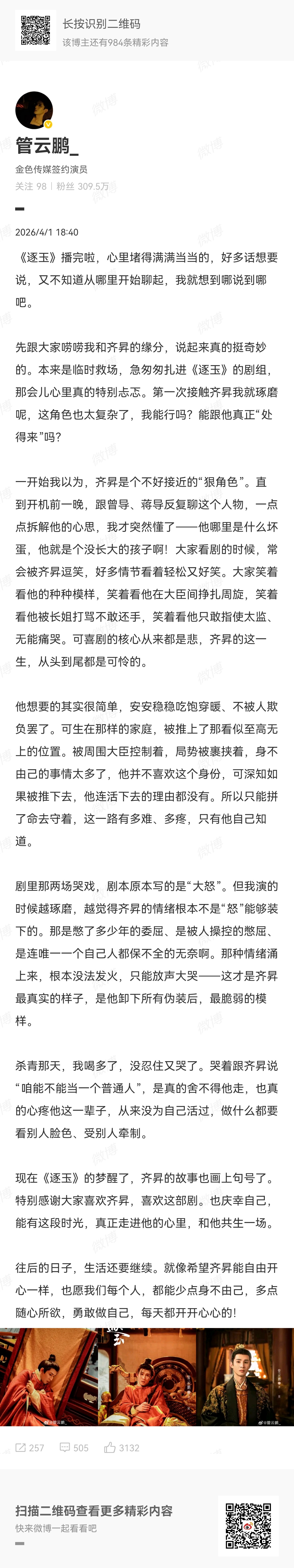 管云鹏发长文告别逐玉管云鹏临时救场出演齐昇却用极致细腻的演技赋予角色灵魂,从前期
