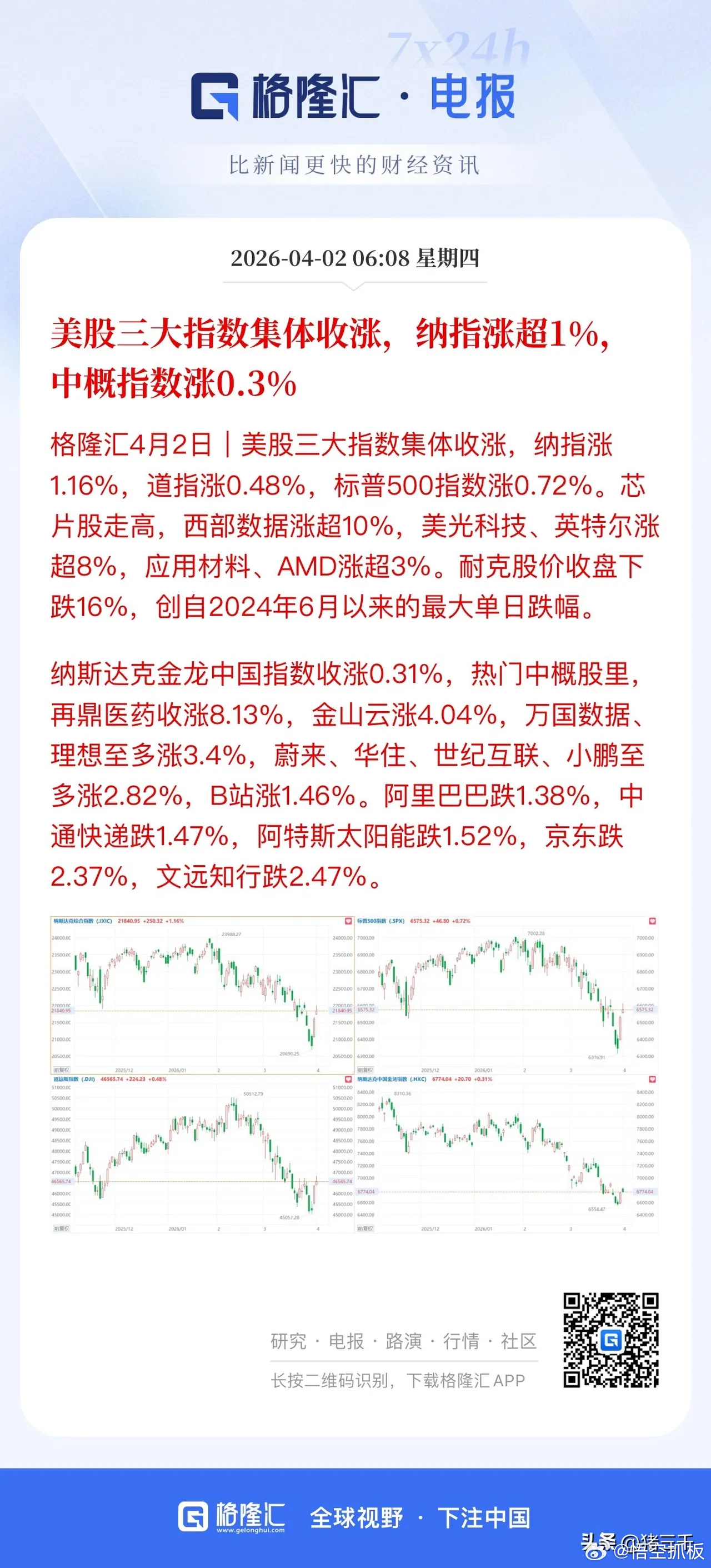 一觉醒来,原油重挫超3%,美股继续狂飙,现货黄金大涨超2%,白银小涨,热门中概股涨跌不一,纳指金龙指数涨0.31%,阿里跌逾1%,京东跌逾2%,百度微涨,哔哩涨逾1%,拼多多跌0.39%,阿特斯太阳能跌逾1%,小鹏涨逾2%,蔚来大涨近3%,富时A50持平,恒生主连微涨,这样看今天我们市场有望继续往上攻,而港股应该会小幅高开。昨晚美股三大指数全线上涨,道指涨0.48%,纳指涨1.16%,大型科技股普涨,费城半导体大涨超2%,英伟达涨0.77%,甲骨文跌逾1%,特斯拉大涨超2%,阿斯麦大涨近3%,谷歌涨超3%,英特尔大涨近9%,台积电涨逾1%,美光科技、闪迪大涨9%,西部数据大涨10%,这样看今天我们存储芯片有望起飞。昨天市场迎来了久违的普涨反弹,沪指成功回补了上周一向下的跳空缺口,短期看仍有继续向上攻的动力,压力位在4000点附近,而创业板指反弹到了5日均线附近,不过昨天两市仅放量200多亿,目前总成交维持在2万亿左右,说明资金做多信心仍不足,所以接下来能否补量很关键,不然容易冲高回落,板块上昨天Al硬件、创新药延续强势,半导体表现活跃,游戏、机器人同样表现亮眼,而另一边的电力、化工煤炭迎来了集体调整,目前看市场风格偏向于前期超跌的科技股,不过在没有量的背景下,整体还是以修复性反弹对待,尽量别追涨。点赞就是对悟空最大支持!