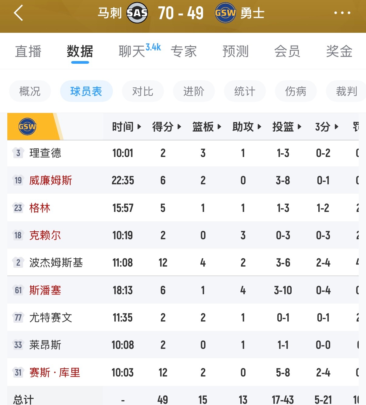 勇士半场落后21分,文班亚马半场27分13篮板NBA