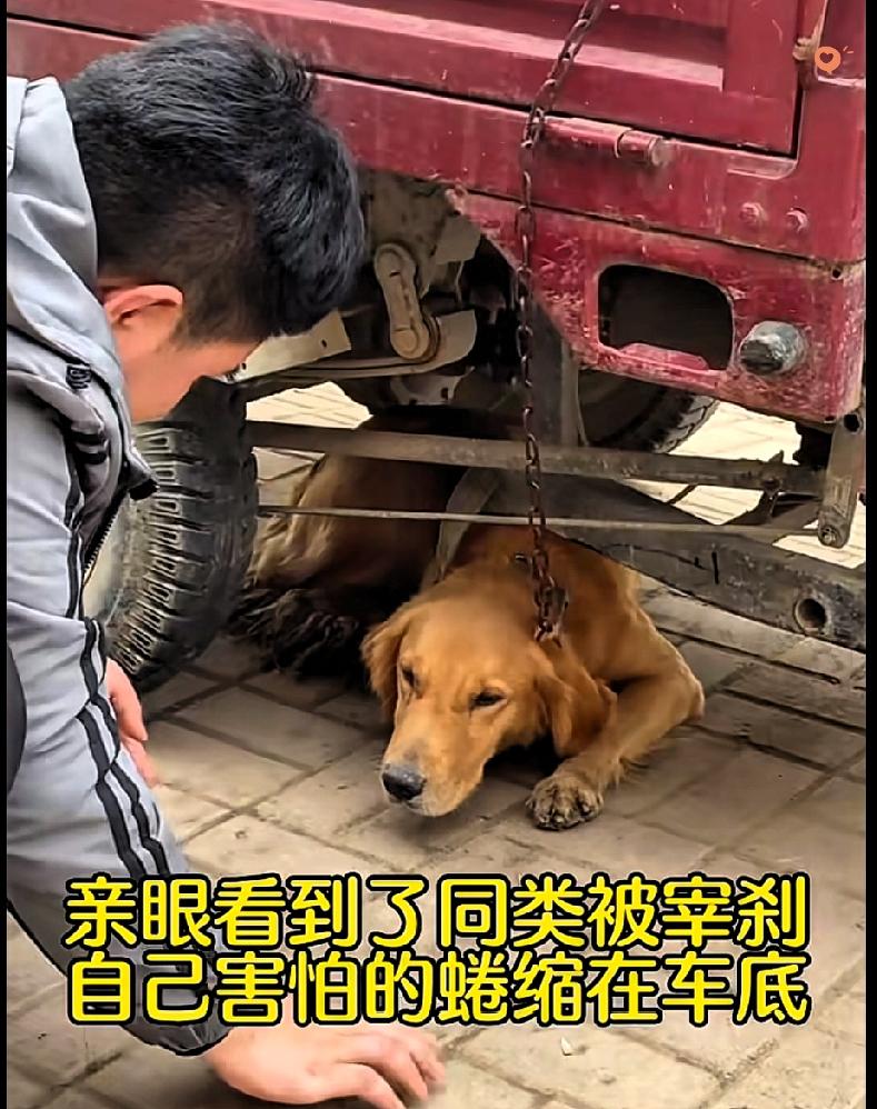 亲眼看着同类被宰割,这只金毛吓得魂都没了,慌慌张张钻到车底瑟瑟发抖。