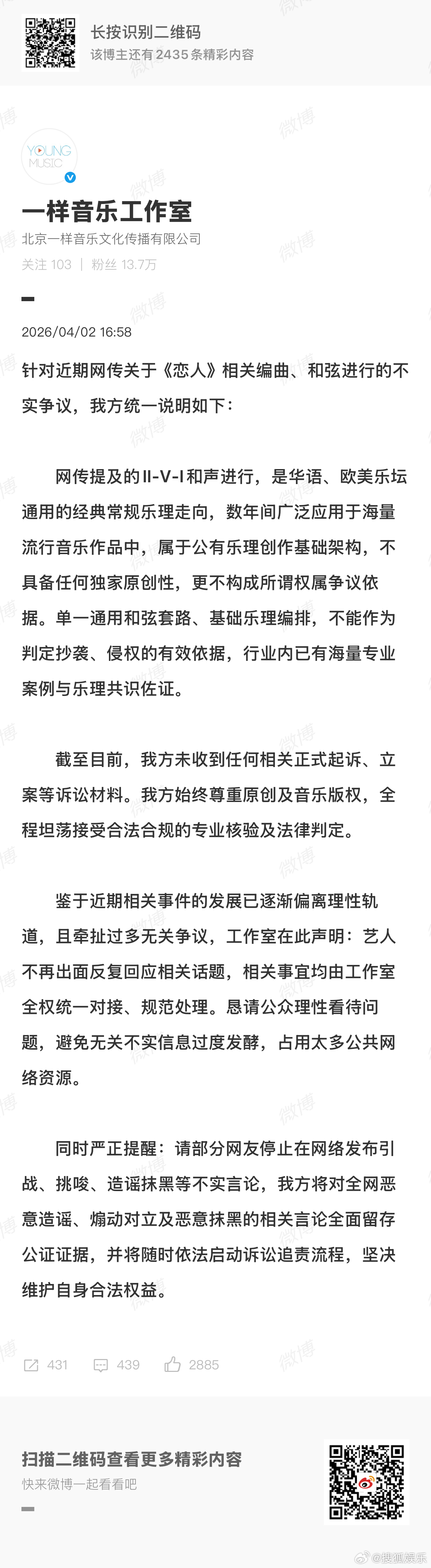 李荣浩方称,歌曲《恋人》的和声进行,是华语、欧美乐坛通用的经典常规乐理走向,不具备任何独家原创性,更不构成所谓权属争议依据。请部分网友停止在网络发布引战、挑唆、造谣抹黑等不实言论。 网友质疑李荣浩撒谎