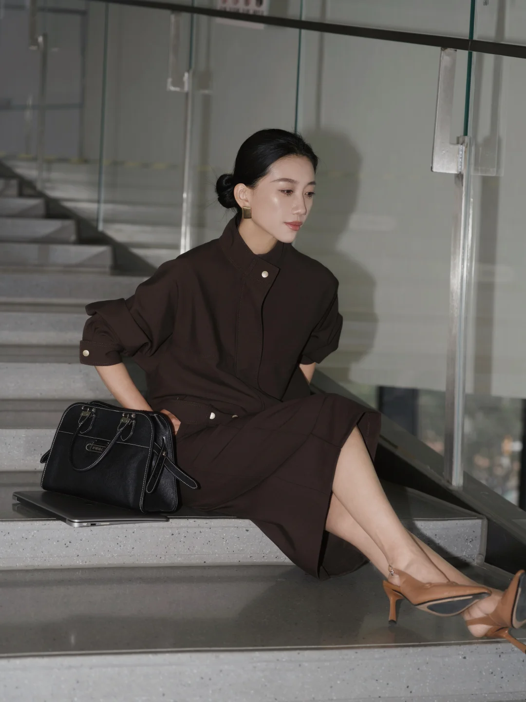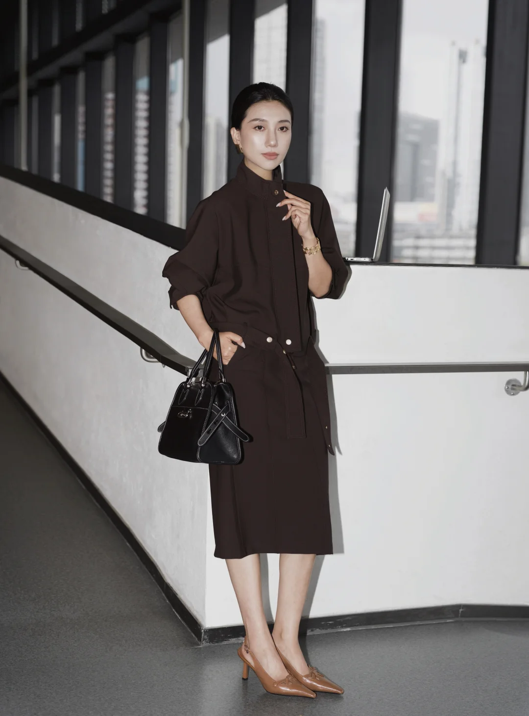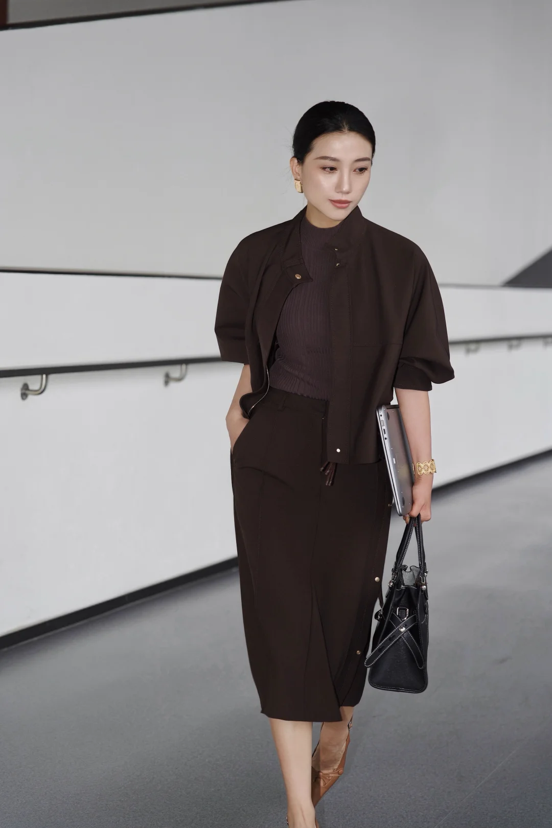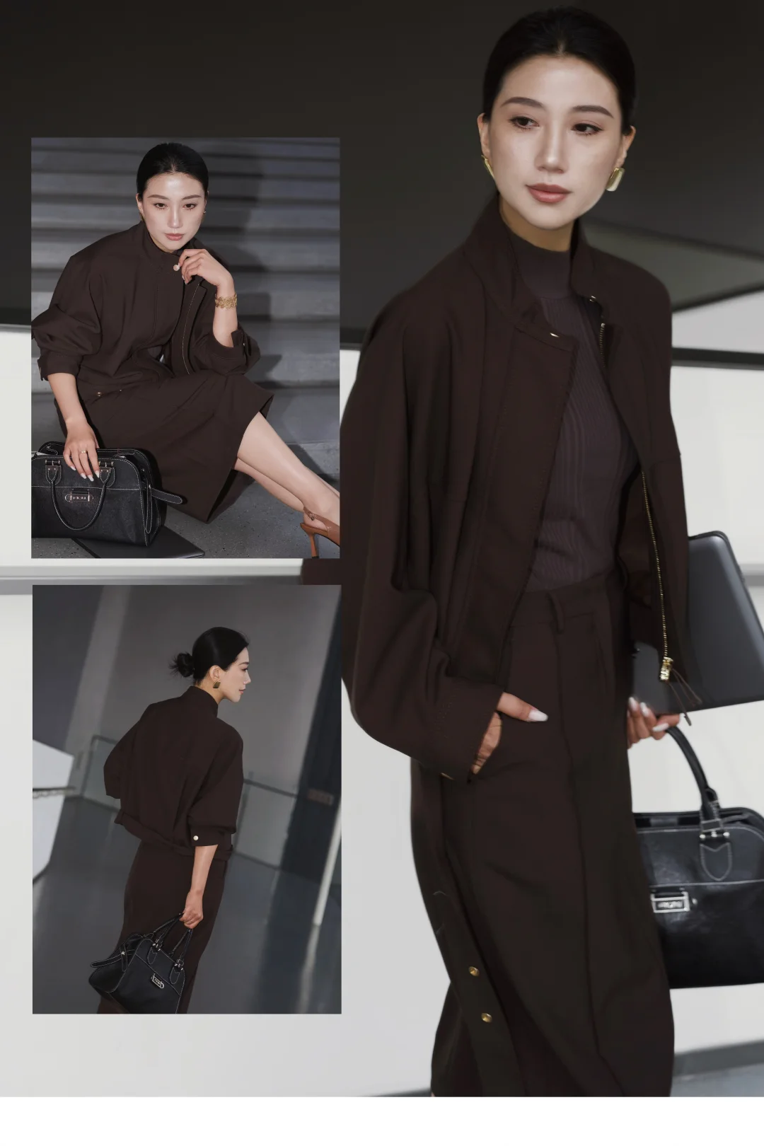 一直以来,我都乐于尝试不同风格,即便是特定的环境,我想也不一定都要穿成复制粘贴的模样。 在职场很多年,在保持干练专业的形象时,套装一直是我的首选,但又希望尝试一些不同于普通西服套装的风格和设计。遇到这一身低饱和咖色,让我一眼心动。是毫不费力的体面,利落外套的金属扣、垂顺半裙的走线,藏着对质感的挑剔。公文包与电脑是日常搭档,脚下的尖头鞋踩稳每一步节奏。 不刻意凹气场,却自带松弛的笃定。台阶上的片刻放空、走廊里的步履不停,大概都是属于都市智性的,温柔又清醒的日常。