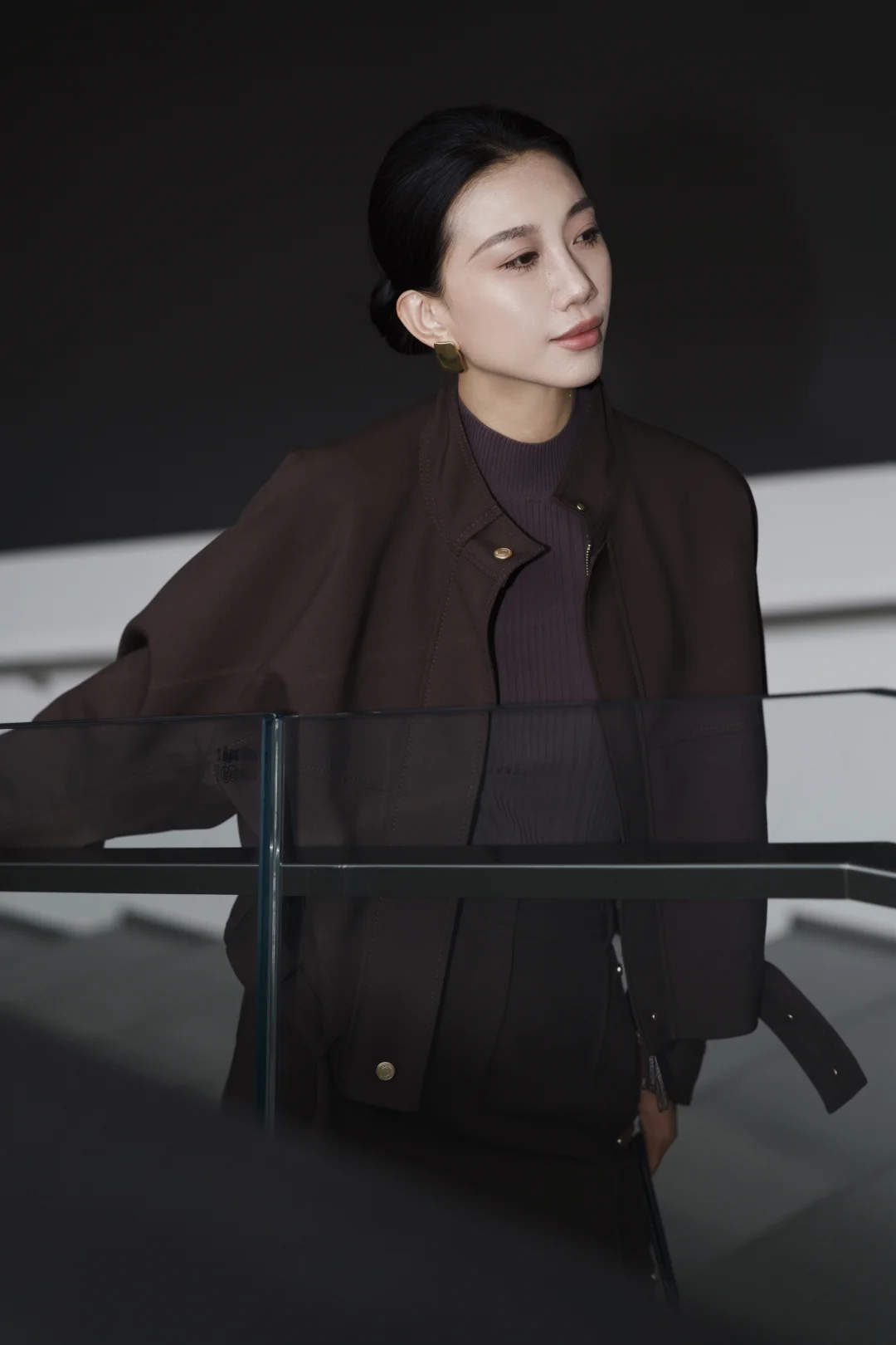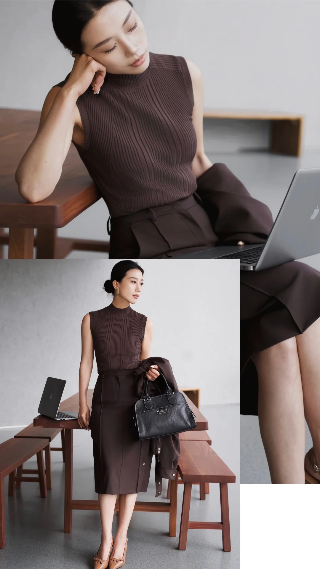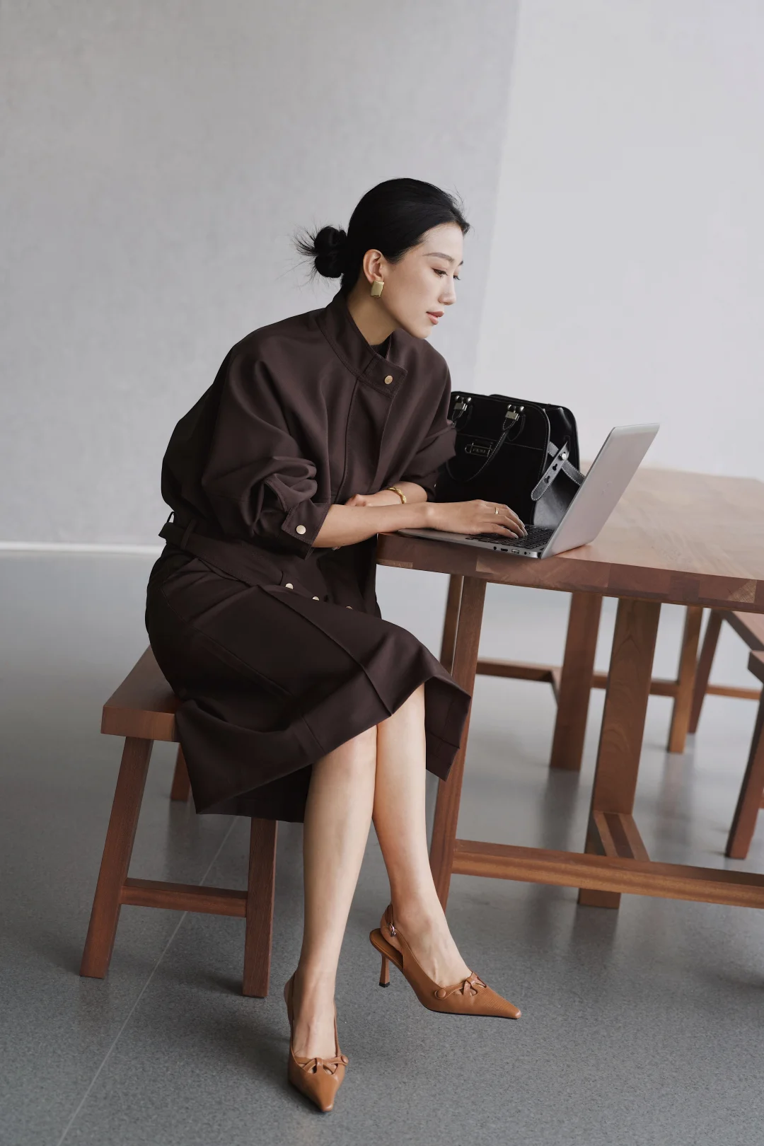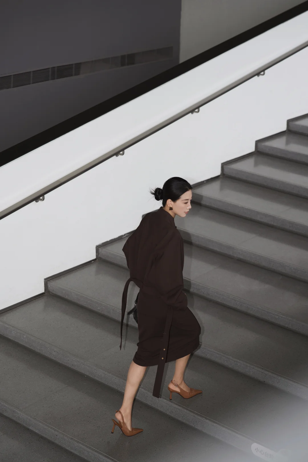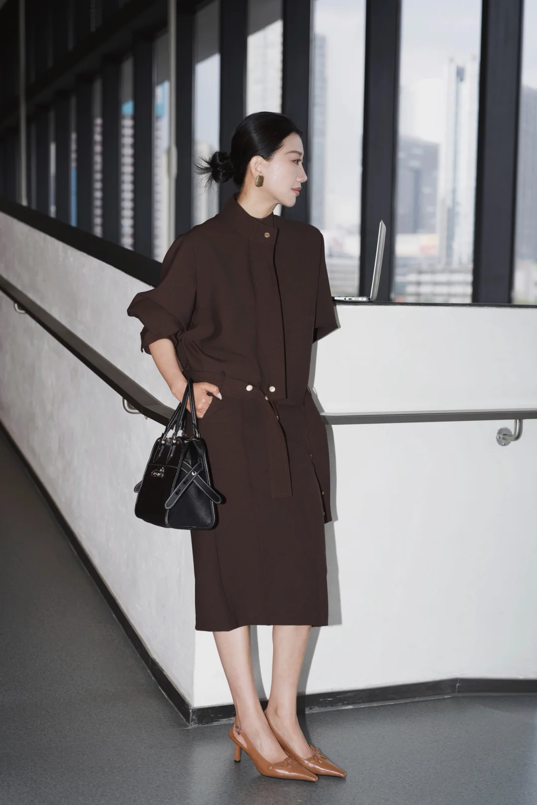 一直以来,我都乐于尝试不同风格,即便是特定的环境,我想也不一定都要穿成复制粘贴的模样。 在职场很多年,在保持干练专业的形象时,套装一直是我的首选,但又希望尝试一些不同于普通西服套装的风格和设计。遇到这一身低饱和咖色,让我一眼心动。是毫不费力的体面,利落外套的金属扣、垂顺半裙的走线,藏着对质感的挑剔。公文包与电脑是日常搭档,脚下的尖头鞋踩稳每一步节奏。 不刻意凹气场,却自带松弛的笃定。台阶上的片刻放空、走廊里的步履不停,大概都是属于都市智性的,温柔又清醒的日常。