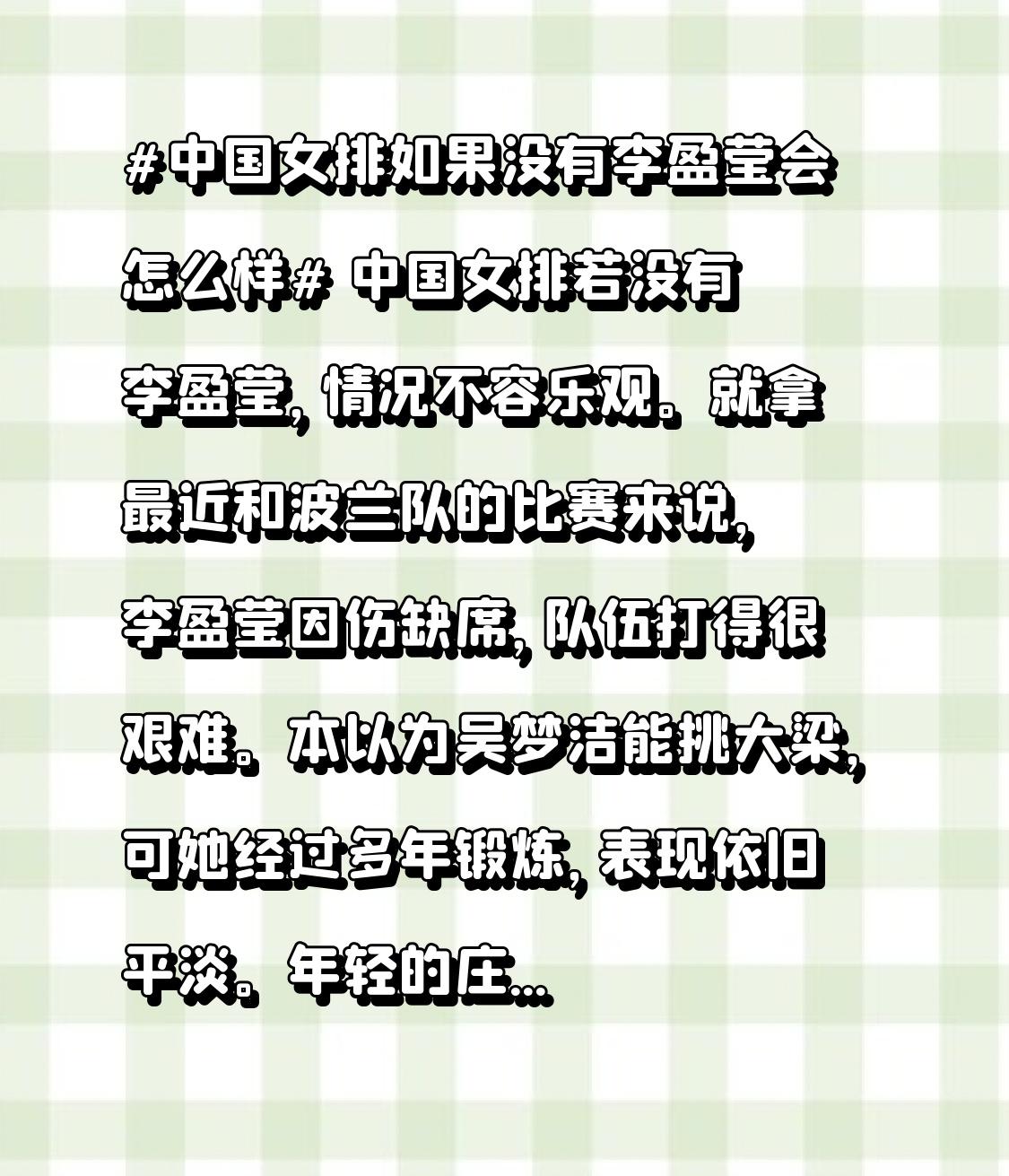 中国女排若没有李盈莹,情况不容乐观。就拿最近和波兰队的比赛来说,李盈莹因伤缺席,队伍打得很艰难。本以为吴梦洁能挑大梁,可她经过多年锻炼,表现依旧平淡。年轻的庄宇珊虽有球商,但身高短板明显,在对手针对下很被动。 这支平均年龄22岁的队伍,接发球漏洞多,心态也脆弱。吴梦洁虽在分站赛得分不错,庄宇珊一传稳定,但整体实力还是受影响。没有李盈莹,中国女排冲击奥运奖牌的路更难走,想要力挽狂澜,还得队员们继续成长啊。