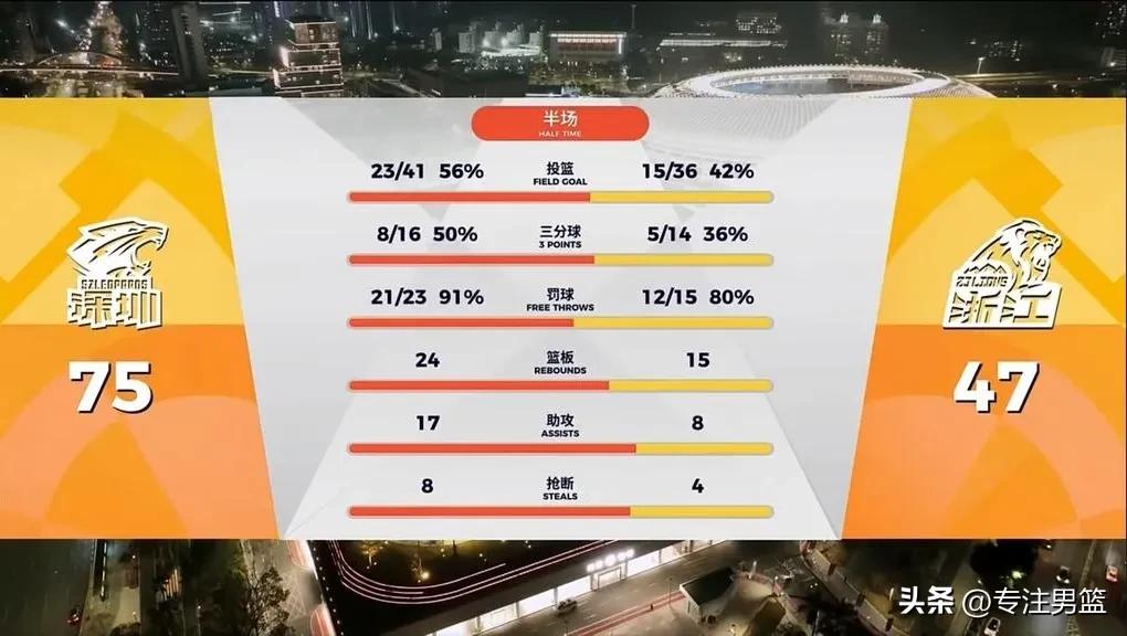 半场比赛,深圳男篮已经领先卫冕冠军广厦男篮28分!(75-47)。 深圳队半场拿