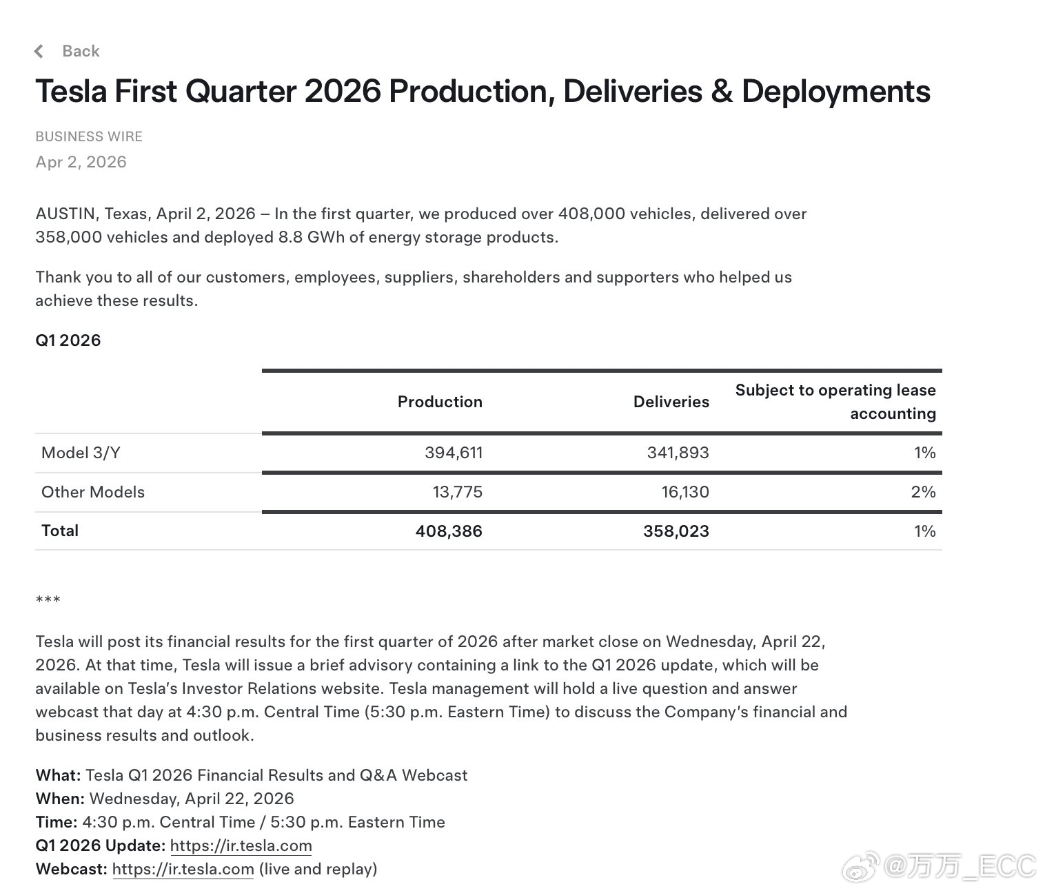 特斯拉第一季度交付358,023辆汽车,同比增长6%,环比下降 -14.4%,再度低于市场预期。其中,中国市场占比达到 60%。