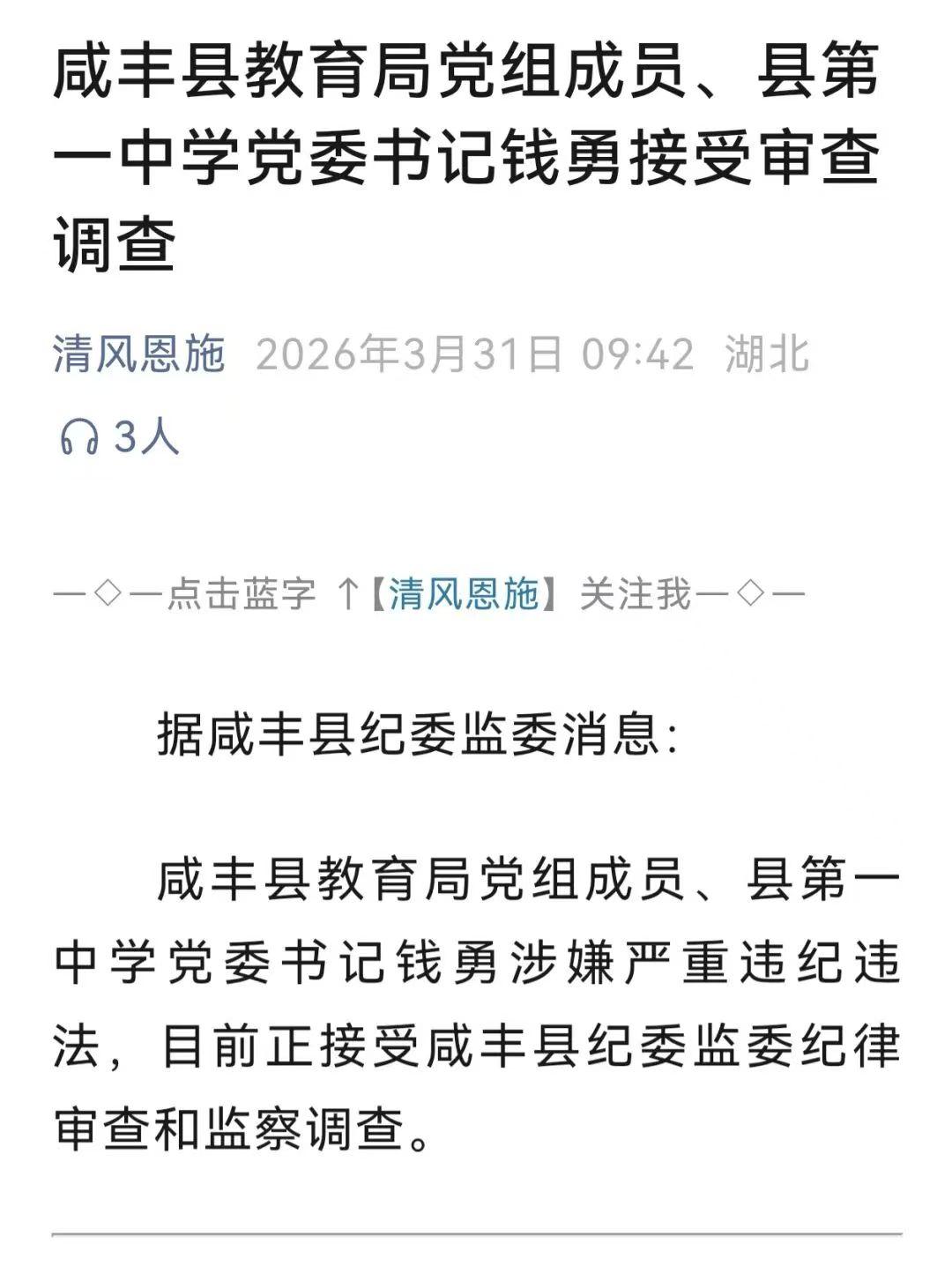 咸丰县的钱勇,今天是彻底栽了! 这个钱勇也不简单,他1972年8月出生于湖北咸丰,中共党员,拥有大学本科学历,从1994年8月开始参加工作。 早年期间在湖北省咸丰县甲马池中学任教,教了三年书之后,又调往了湖北省咸丰县第一中学任教,在这所学校里面工作了20年时间,历任团委书记,办公室副主任,主任,校长助理,副校长。 于2017年3月,担任湖北省咸丰县委理论信息中心副主任,在这一核心岗位上仅工作一年时间。 于2018年7月,又调往湖北省咸丰县教育局工作,担任教育局党组成员,同时还担任着咸丰县一中党委书记、校长。可谓是身兼多职,权力不小。 于2021年12月,晋升为咸丰县教育局党组书记、局长。同时还担任着县人民政府教育督导室主任职务。 最后的落脚点是担任咸丰县教育局党组成员,县第一中学党委书记。 他作为土生土长的湖北咸丰人,这几十年的工作生涯几乎没有离开过家乡咸丰县,作为教育部门的核心骨干,他们应该在履职期间恪尽职守、廉洁奉公,以身作则,没想到如今却在履职期间做出了涉嫌严重违纪违法的事情,真的是令人寒心,不仅愧对家长们的信任,更是愧对组织的培养。 教育是国之大计、党之大计。教育系统的腐败问题,不仅损害了教育公平,也影响了人才培养质量,更关系到国家的未来和民族的希望。钱勇案件的发生,为我们敲响了警钟,也为我们推进教育系统廉政建设提供了深刻的警示。 我们必须以零容忍的态度惩治教育腐败,以改革创新的精神完善监督制约机制,以久久为功的韧劲加强廉洁教育,才能让教育系统成为一片净土,让每一个孩子都能在公平公正的环境中茁壮成长,让教育真正成为实现社会公平的基石。
