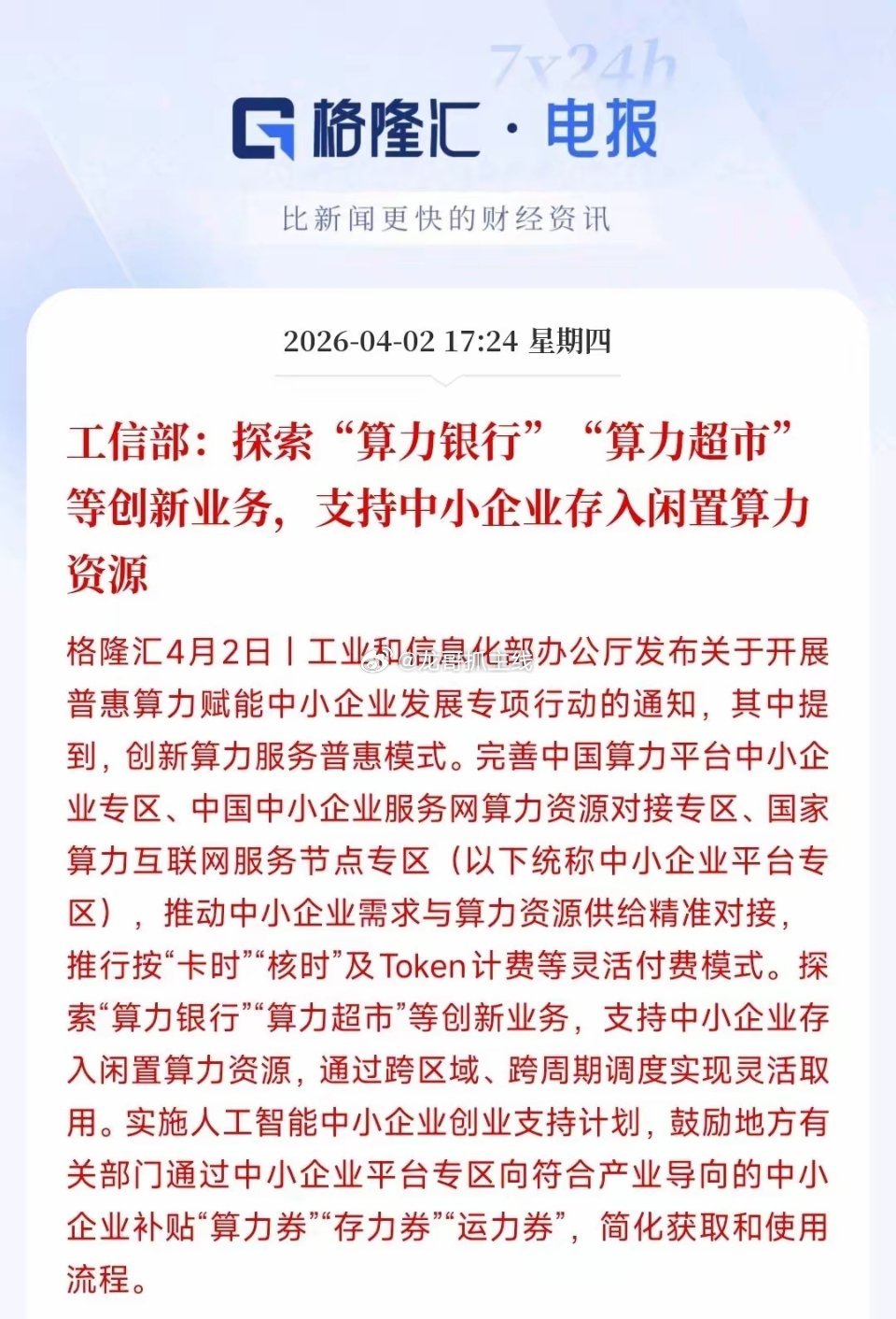 晚上,算力板块迎来利好消息,明天有望迎来反弹简单的说:就是村里用算力更省钱,更方便,村里还有补贴,就是为了算力使用的扩大化。算力超市:就像逛超市一样,直接买算力服务。算力银行:中小企业有闲置电脑、服务器算力,可以“存”进去,需要的时候再取出来用,跨地区、跨时间调度。而村里给发算力券等补贴,最终的目的就是让中小企业能用得起算力,用的好算力。别看是中小企业,其实国内中小企业才是最多的,这次的推广就是为算力站台,能够把算力推广到所有企业,这对于算力板块来说是一个重大利好消息。财经