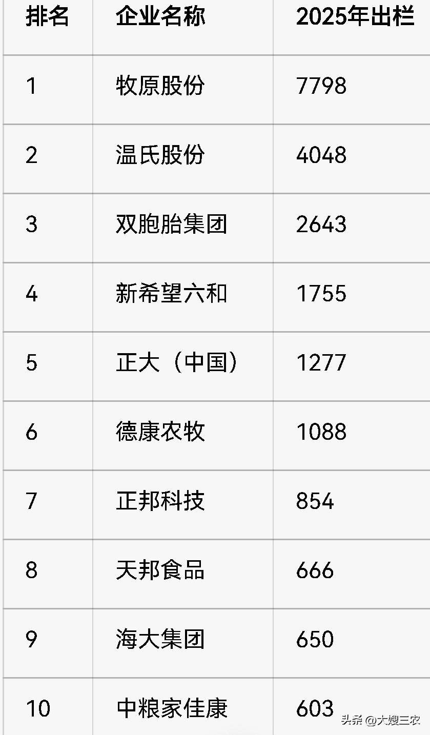 很多人说,国企养猪规模越来越大,那么今天我们就来看一下,养猪“国家队”的出栏量规模处于什么水平? 2025年“养猪”国家队TOP10生猪出栏量合计2647.56万头,其中中粮家佳康、新五丰、广西农垦三家超500万头,再往后出栏量并不多,天康300万头级别,之后就是100万头级别。 再看一下几大养猪民企,2025年出栏千万头级别的就有六家。分别是牧原、温氏、双胞胎、新希望六和、正大、德康农牧。其中牧原7798万头、温氏4048万头,一家出栏量就大幅超过国家队前十总出栏量。 从整体看,出栏量前十的猪企中,只有中粮家佳康一家是国家队,而且排在第十位。国企养猪规模虽然在持续扩大,但从2025年生猪出栏数据看,规模还比较小。区域分布也比较集中,养猪国企前十中,广东就占了四个。 所以说,养猪企业中,民营占了绝大多数。养猪“国家队”整体规模仍偏小,市场化民营猪企才是绝对主力。单从这一点上看,养猪业市场化竞争还是挺充分的。