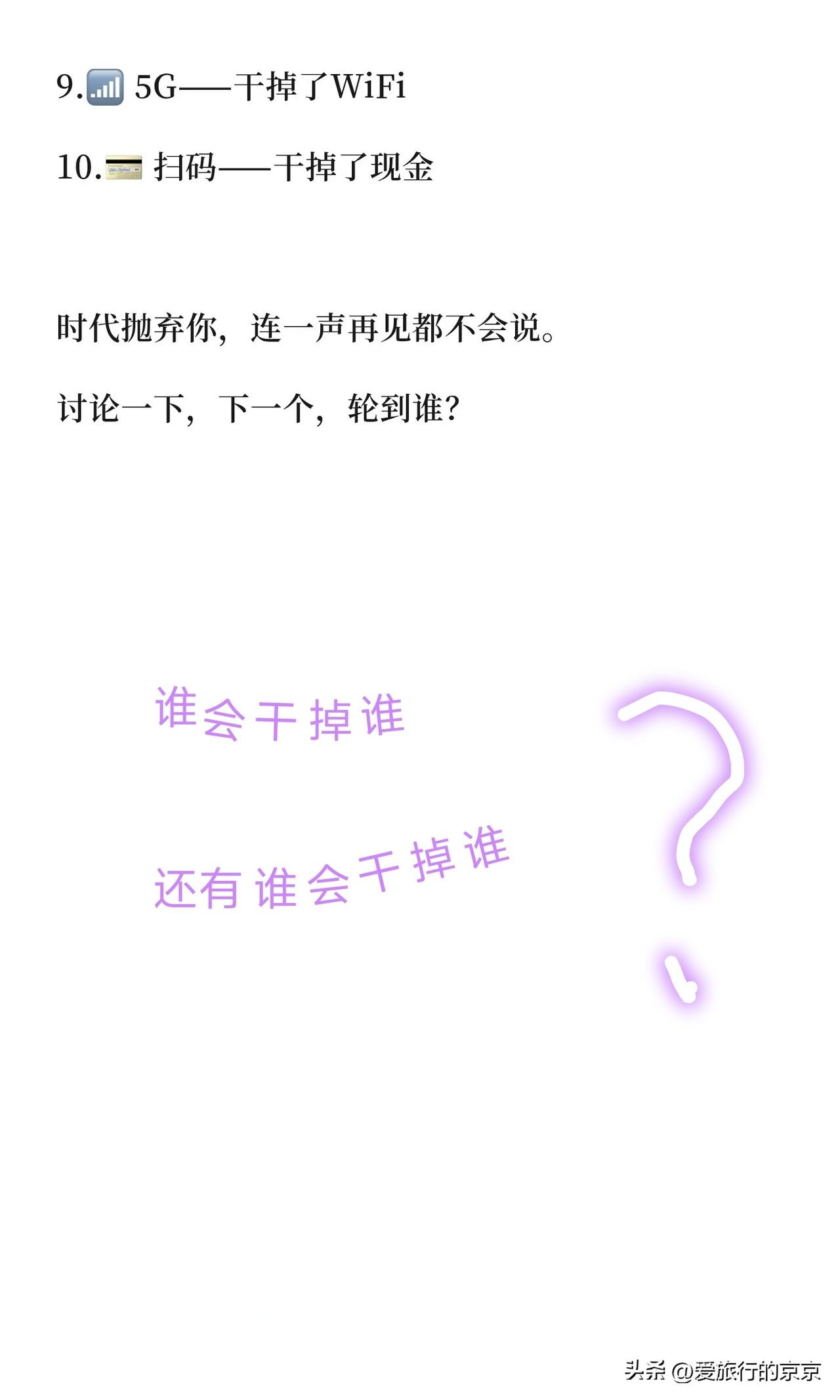 下一个被“干掉”会是什么? 📱手机的出现~ 干掉了闹钟,干掉了相机,干掉了手电筒,干掉了录音机,干掉了报纸,干掉了导航,干掉了计算器,干掉了... 网络支付扫码~ 干掉了现金,干掉了钱包👛 微信~干掉了电话☎️ 电商~干掉了商场🏬 网约车的出现~干掉了黑车🚗 ...... 还有谁取代了谁? 猜一猜,下一个会是谁干掉谁?