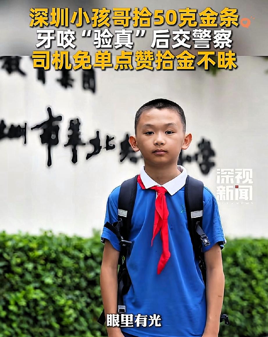 11岁男孩上学路上捡到50g金条,居然还知道用牙咬一下验真假,这操作也太机灵了!这波操作直接把格局拉满。 3月27日早上,罗湖区的李麒瑞在田贝四路捡到个小布袋,打开竟是块50克的投资足金,同学估算值四五万。 换别人可能慌神,他直接用电话手表报警,10分钟民警就赶到。 事后他说爸妈老师总教他“不是自己的不能拿”,这话听着简单,真做到太难得! 30日打车去派出所处理后续,司机师傅听说这事当场免单,这双向的善意也太暖了! 别总说孩子小不懂事,李麒瑞的坦荡和清醒,狠狠打脸那些贪小便宜的成年人。 很多人说现在的孩子早熟又物质,可这个男孩用行动告诉我们,善良和诚实从来不分年龄。 比起金条的价值,他身上那份不贪不占的坦荡,才是最珍贵的“宝藏”,司机师傅的仗义更是给这份美好加了份温暖buff。 刻在骨子里的教养,才是孩子最值钱的“黄金”!这才是少年该有的样子。 要是你捡到这么贵重的东西,会第一时间报警吗?评论区唠唠!
