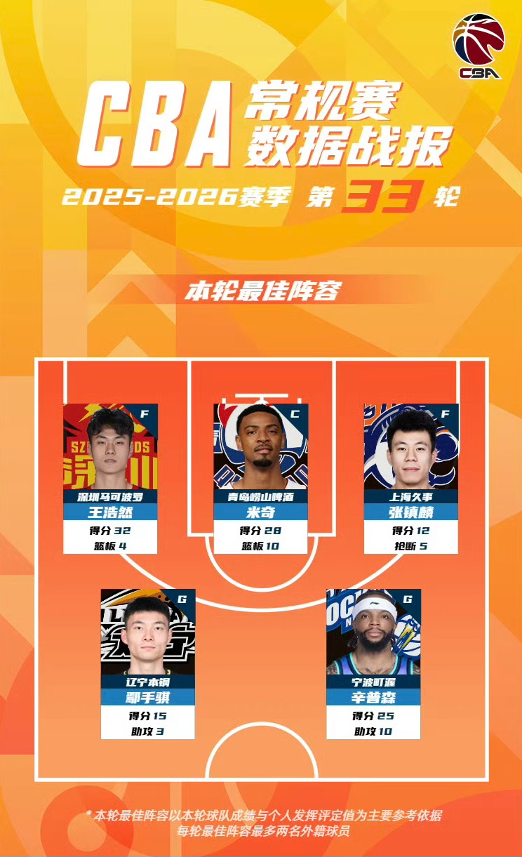 鄢手骐入选25-26赛季CBA联赛第33轮最佳阵容!和金金一起!