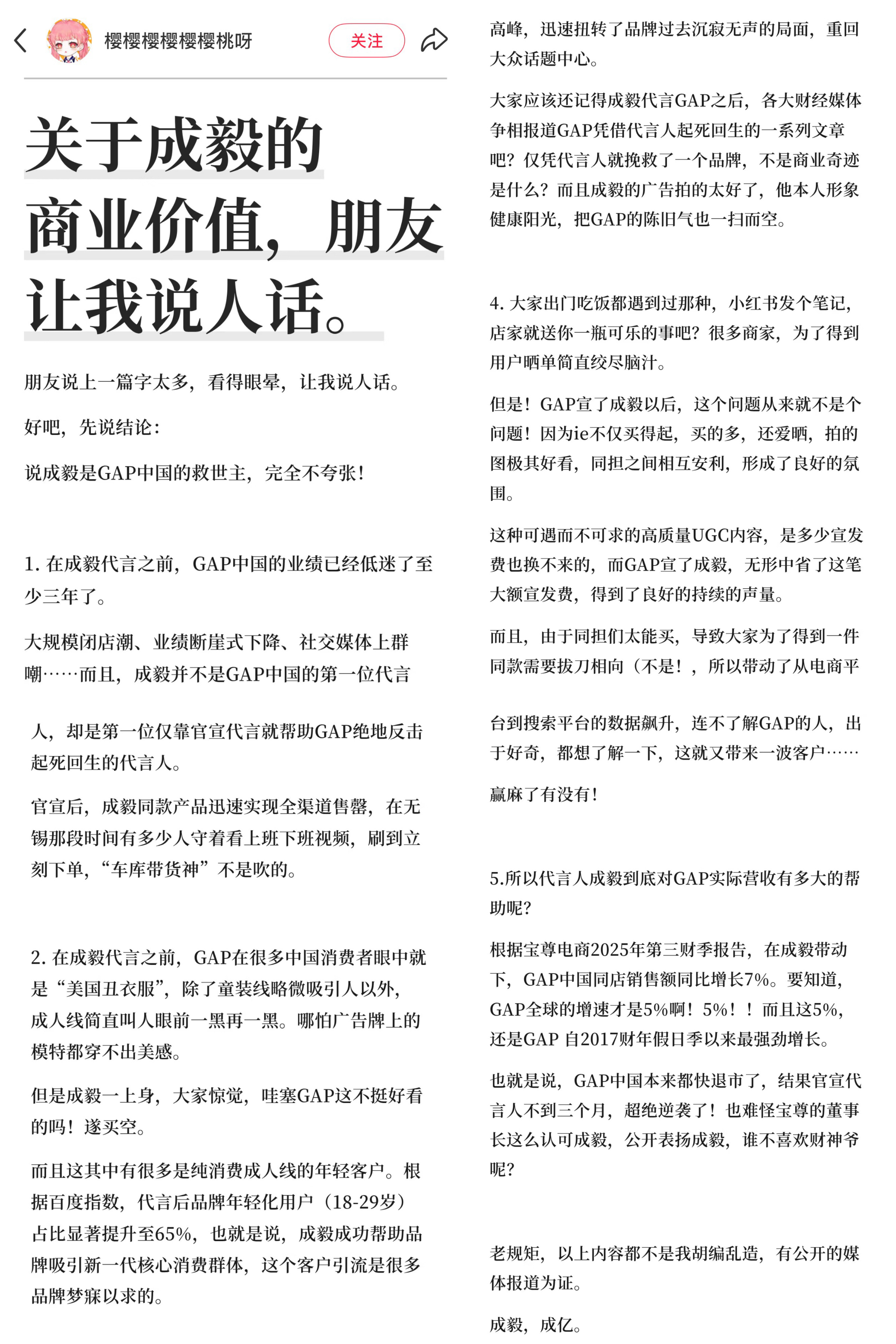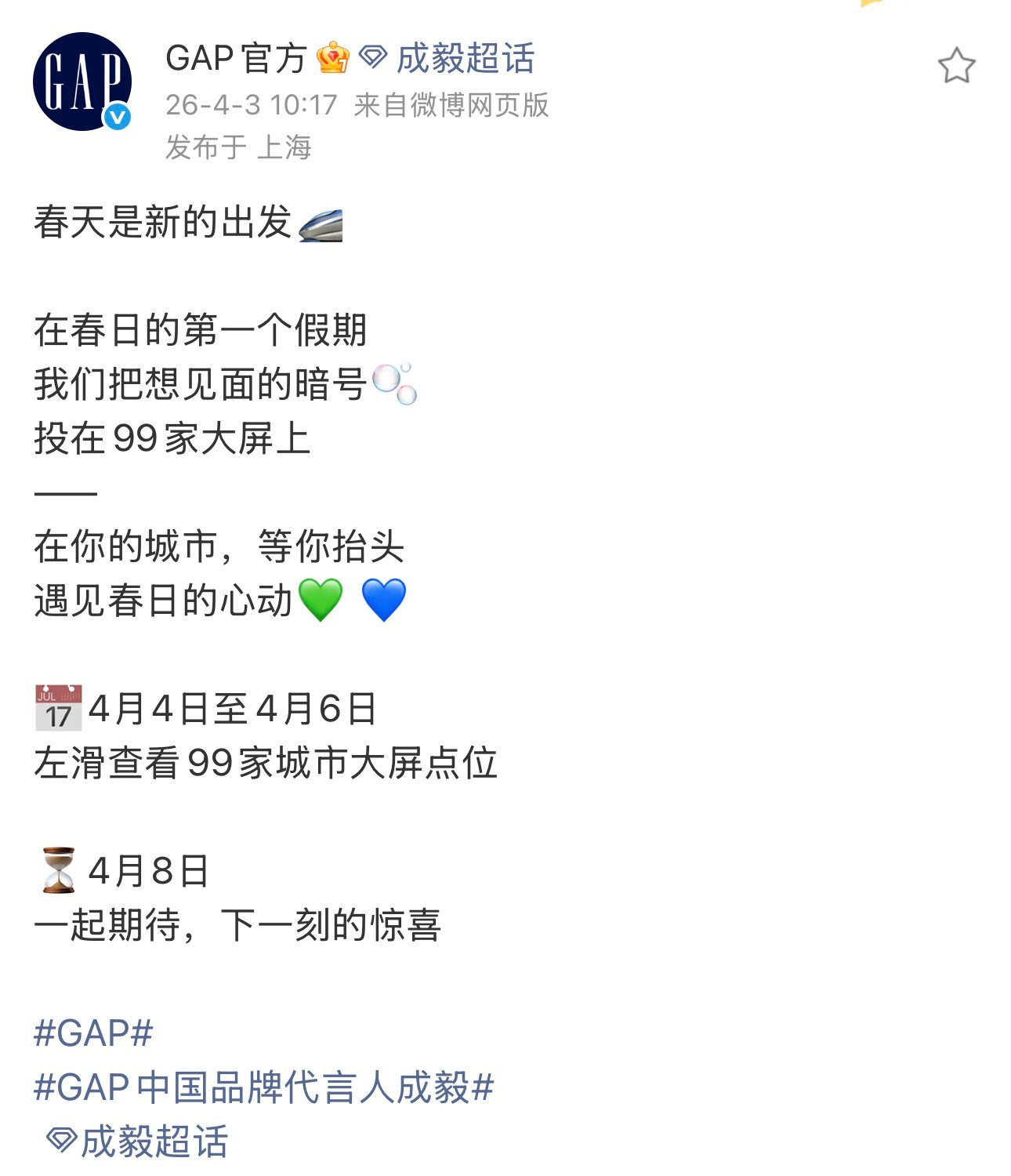 从官宣代言起,成毅就用超绝号召力,给GAP带来了肉眼可见的商业爆发:官宣即爆,“地库带货王”成毅同款全线产品秒空,不仅直接带动品牌销售额同比增长超20%,长期以来更是用实打实的销量证明了他的国民度与带货力!而GAP对代言人的宠爱,更是肉眼可见的顶级排面,从北上广深一线,到新一线、二三线甚至下沉市场全覆盖,每一座城市的核心商圈、流量入口,触达人群量级直接断层领先,真正的双向赋能