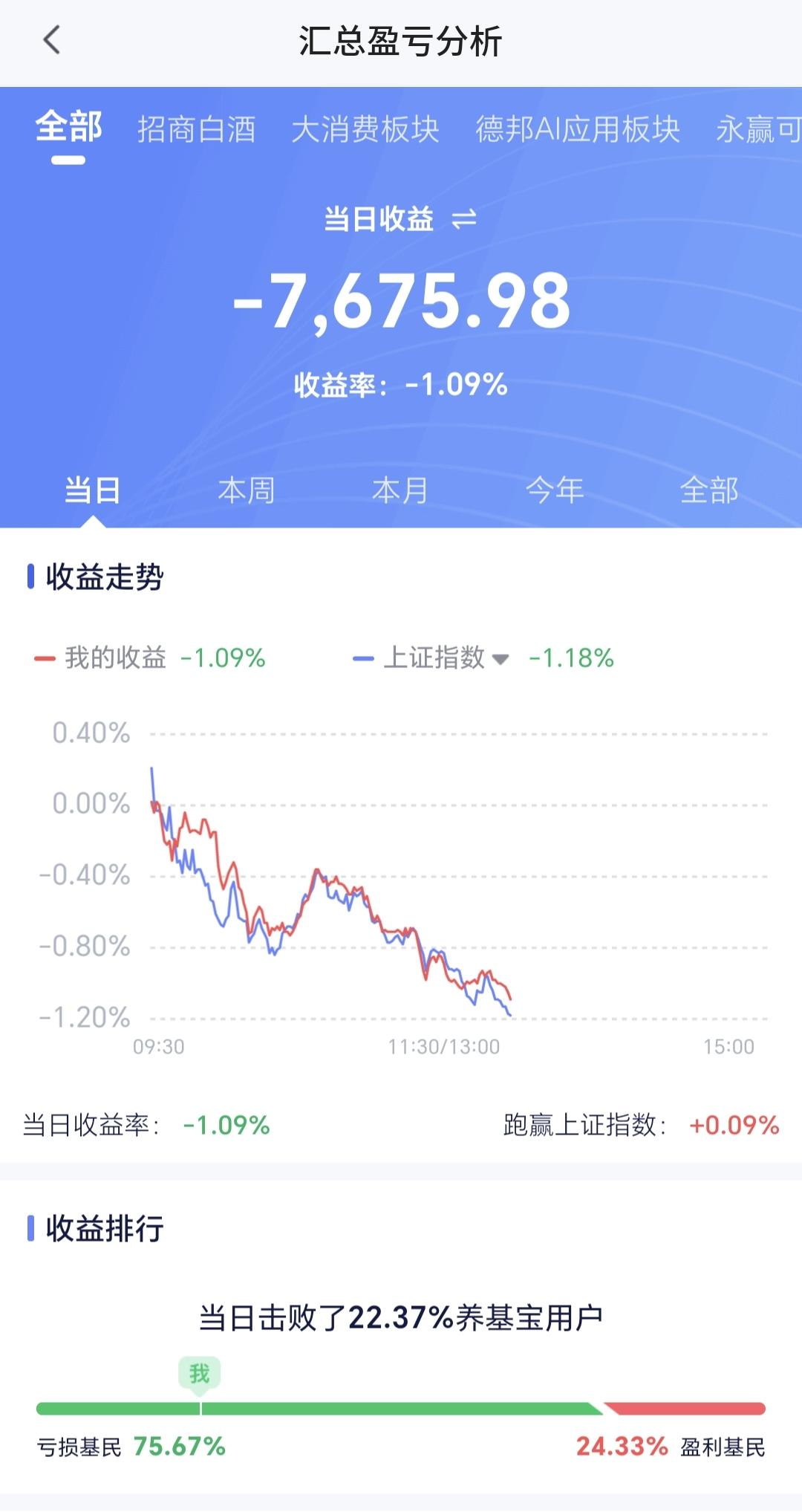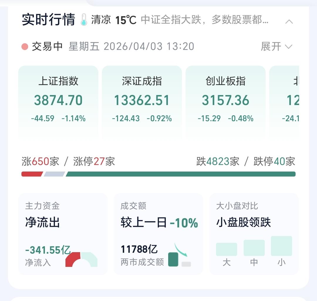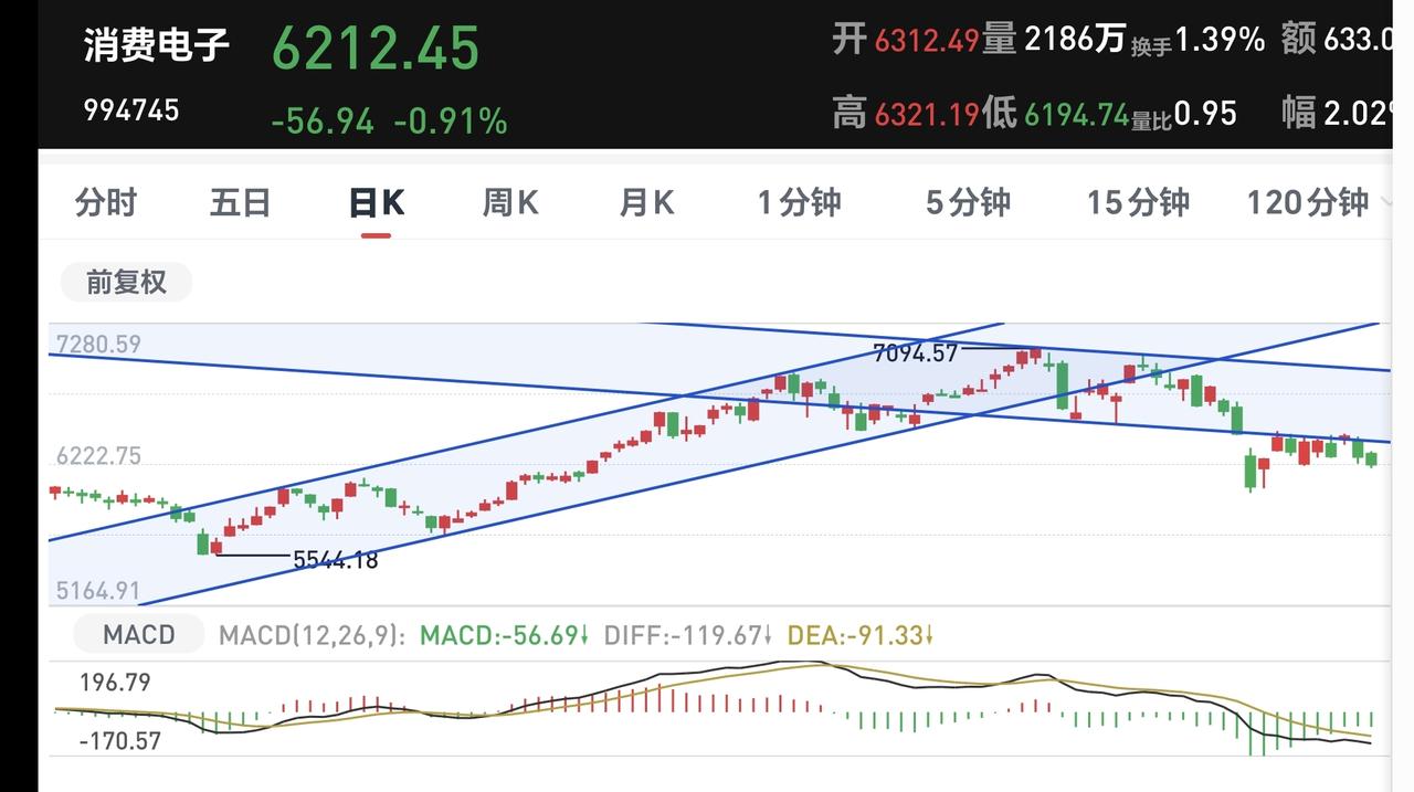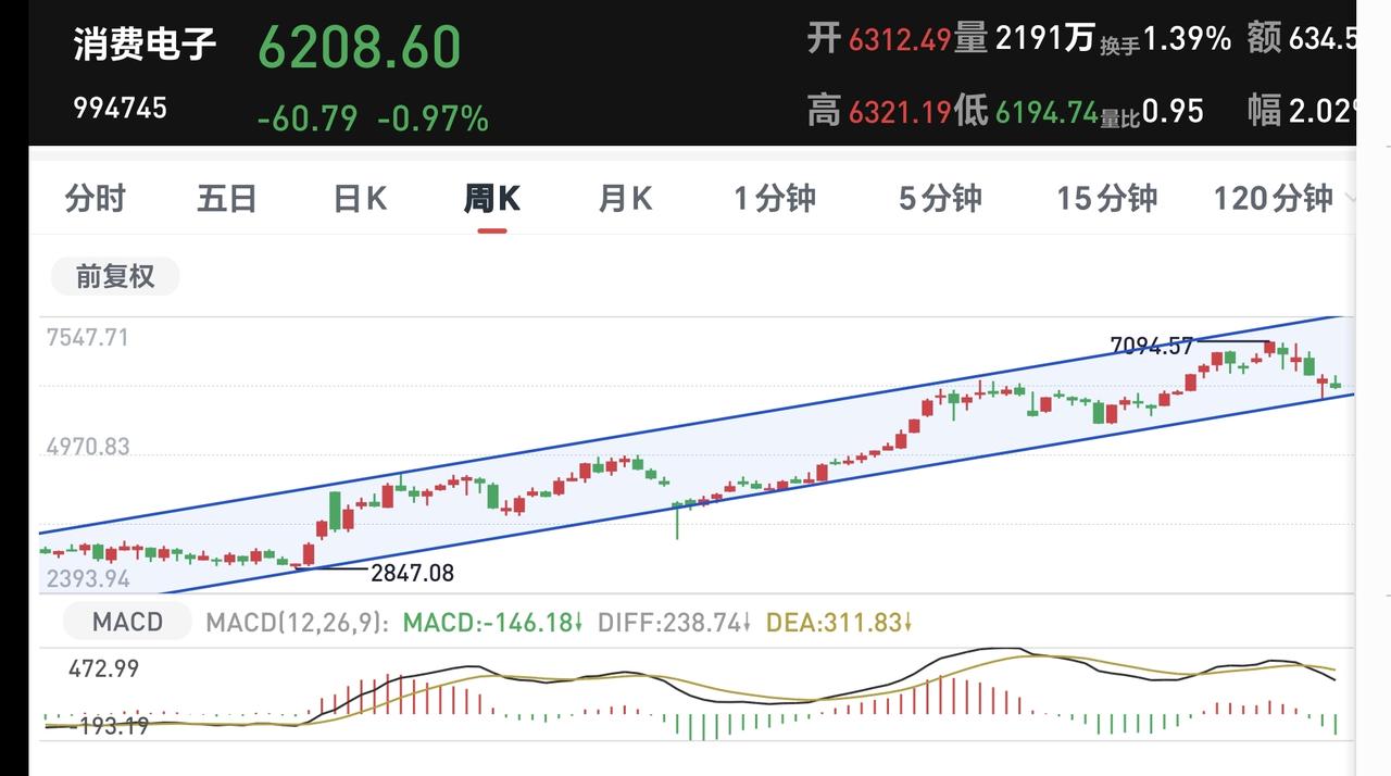 基金:不管是上涨还是下跌,都是无效的波动 市场下午开盘以后小幅度震荡向下,创业板指下跌了0.52%,盘中点位3156点,上证指数下跌了1.14%,盘中点位3874点。 整个股票市场,上涨650家,下跌4823家,涨停27家,跌停40家,上涨家数少于下跌家数。 持有的基金中,盘中估值盈利金额最大的三个板块是:5G板块,军工板块,沪港深消费板块,估值亏损金额最大的三个板块是:创新药板块,白酒板块,证券板块,估值整体亏损了7675元。 整个基金市场,上涨7133家,下跌12360家,没有上涨幅度超过5%的基金,也没有下跌幅度超过5%的基金。 图9是今天板块的上涨排行榜,上涨幅度最大的三个板块是:CPO板块,通信板块,黄金板块,图10是今天板块的下跌排行榜,下跌幅度最大的三个板块是:煤炭板块,光伏板块,农林牧渔板块,图11是今天基金的加仓和减仓人数,加仓3207074人,减仓2052635人,加仓人数超过了减仓人数。 整个市场主力资金净流入最多的三个板块是:5G板块,通信板块,通信设备板块,主力资金净流出最多的三个板块是:国企板块,光伏板块,蓝筹策略板块。 1:现在还是黄色线在蓝色线下方,两条线之间的长河还是比较大,这样的情况之下,翻红的难度加大。 2:两市累计成交11788亿,相比于昨天同期缩量了10%,主力资金净流出341亿,这样的成交量也不支持市场上涨。 3:现在五天线位置是3911点,盘中点位3874点,是在五天线之下的震荡,只有站上并站稳五天线,市场才有转强的可能性。 4:消费电子板块日线级别下跌跌破上涨通道的下轨线以后,形成了一个新的短期下跌通道,前段时间又下跌跌破了这个短期下跌通道的下轨线,短线持有的人需要注意风险。 消费电子板块周线级别处于上涨通道中,距离上涨通道的下轨线比较近,近期观察会不会有效破位这个上涨通道的下轨线,如果有效破位了这条下轨线,长线持有的人也需要注意风险。 5:化工板块前段时间下跌跌破了日线级别上涨通道下轨线以后,形成了一个新的短期下跌通道,现在是在这个下跌通道当中震荡,短线持有的人需要注意风险,这个板块第一次注意风险的时间,就是跌破上涨通道下轨线的时候。 化工板块周线级别处于上涨通道中,距离上涨通道的下轨线比较近,近期观察会不会有效破位这条下轨线,如果有效破位了周线级别上涨通道的下轨线,长线持有的人也需要注意风险。 6:商业航天板块日线级别处于下跌趋势中,前段时间下跌跌破了日线级别下跌通道的下轨线,进入加速下跌走势,短线持有的人需要注意风险。 商业航天板块周线级别处于上涨通道中,距离上涨通道的下轨线很近,在有效破位上涨通道下轨线之前,长线持有的人都可以继续持有,周线级别上涨通道的下轨线是长线持有者的持有条件。 有些上涨是无效的上涨,有些下跌是无效的下跌,只有改变现有趋势的涨跌,才是有效的涨跌,今天只要收盘点位在3852点至3955点之间,不管上涨还是下跌,都是无效的波动。 今天究竟应该怎么办?我会在评论区留言。 大家帮忙评论,点赞,转发和分享,谢谢大家的支持。
