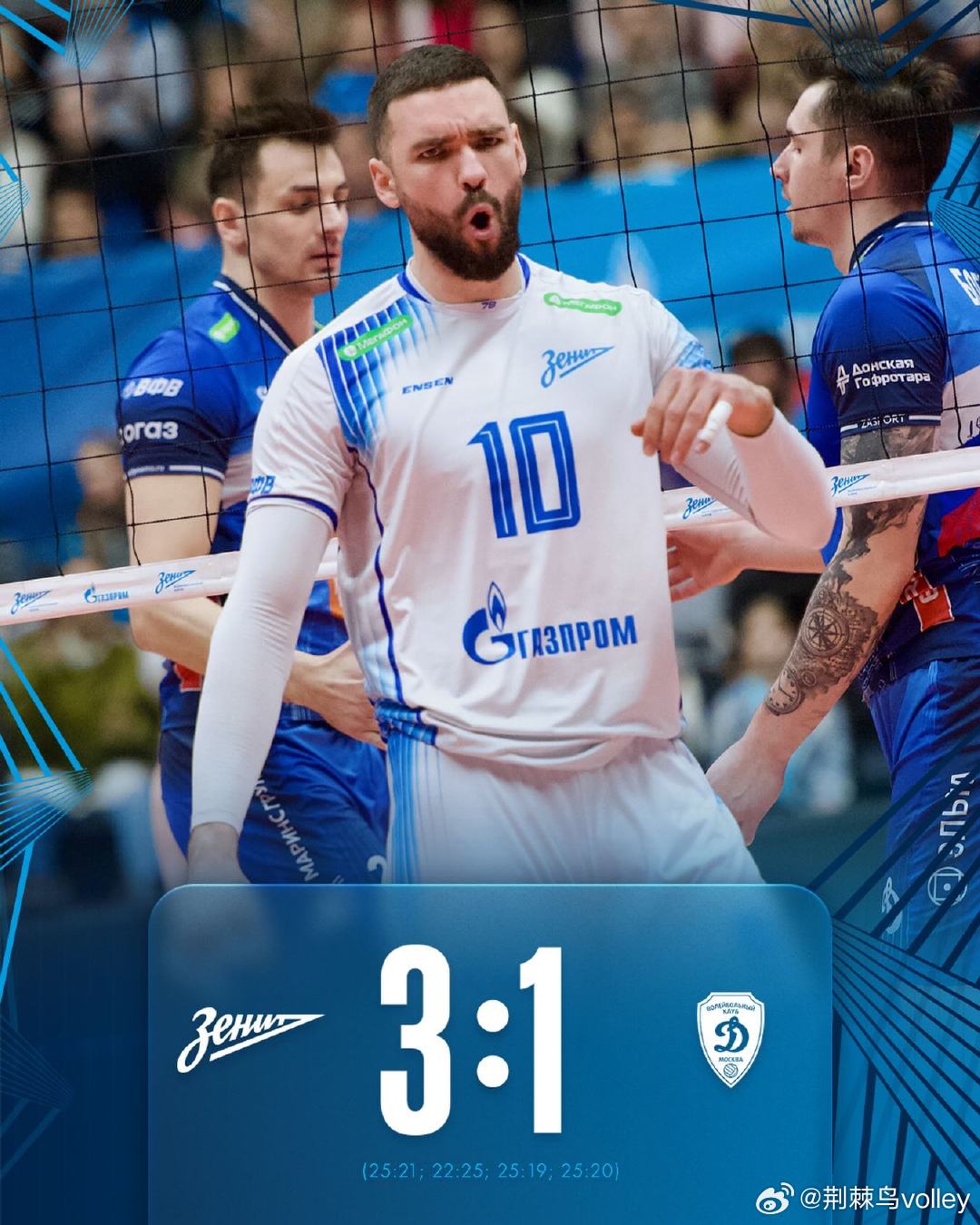 【俄超男排】半决赛第二回合,圣彼得堡主场3-1力克莫斯科迪纳摩扳平场分(25-21 22-25 25-19 25-20)。巴布科维奇24分(36扣20中2失3被拦,1拦3发),扬特13分(23扣12中2失2被拦,1拦),迪内金7分,迪卡列夫7分,切雷斯基5分,科布扎尔3分;博格丹19分(29扣15中1失2被拦,2拦2发),萨波日科夫17分(30扣14中6失4被拦,1拦2发),塞米舍夫11分(17扣9中3失,2发),弗拉索夫7分(8扣6中1失1被拦,1拦),朱克5分。|