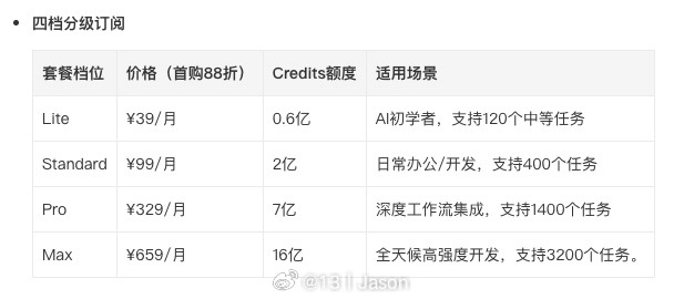 💡 四档订阅方案全面覆盖,首购全部享88折优惠!🔹 Lite(入门尝鲜):39元/月 ➡️ 首购特惠 34.32元/月🔹 Standard(进阶用户):99元/月 ➡️ 首购特惠 87.12元/月🔹 Pro(专业开发者):329元/月 ➡️ 首购特惠 289.52元/月🔹 Max(开发发烧友):659元/月 ➡️ 首购特惠 579.92元/月