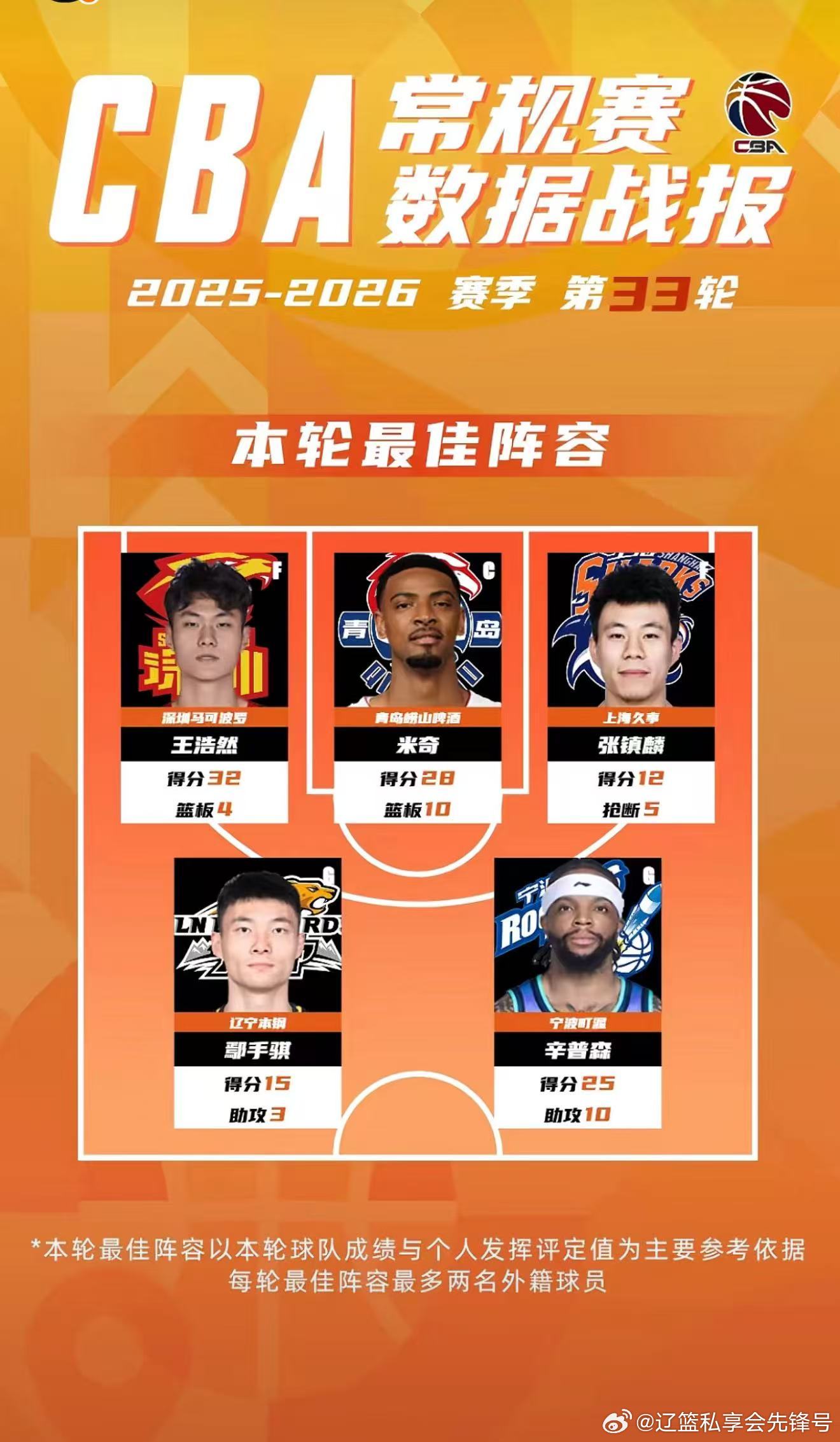 CBA 官方公布2025-26赛季常规赛第33轮最佳阵容,辽宁男篮后卫鄢手骐强势入选,迎来职业生涯首次单轮最佳阵容荣誉。