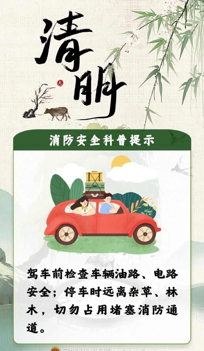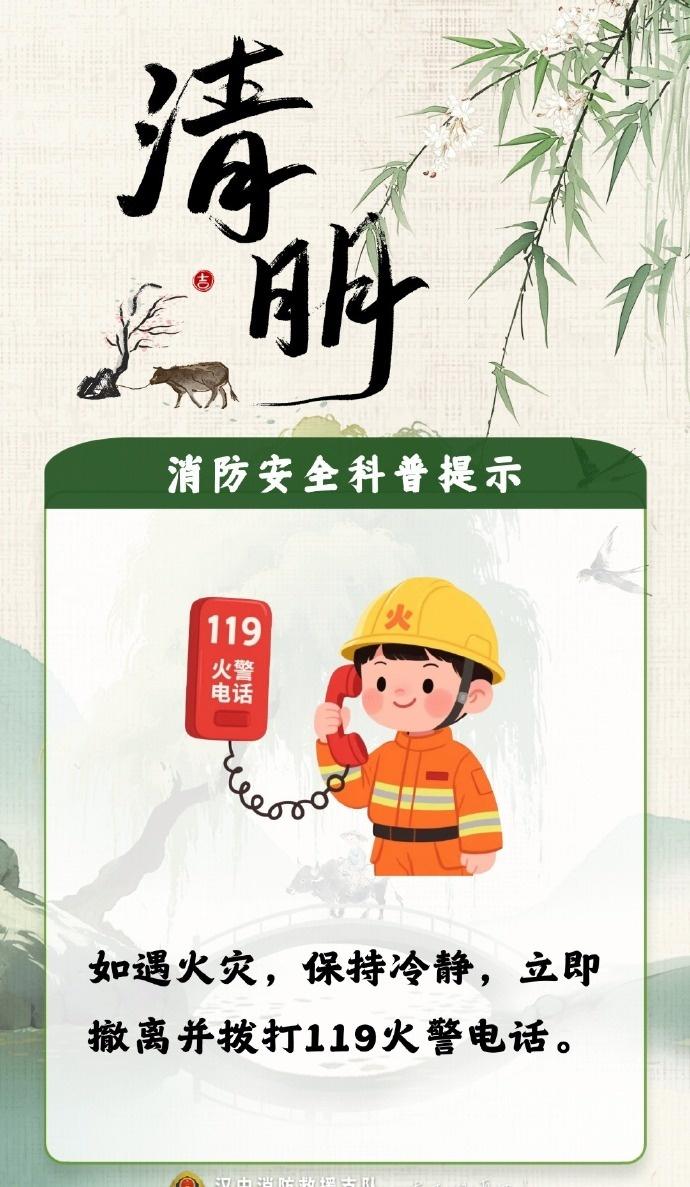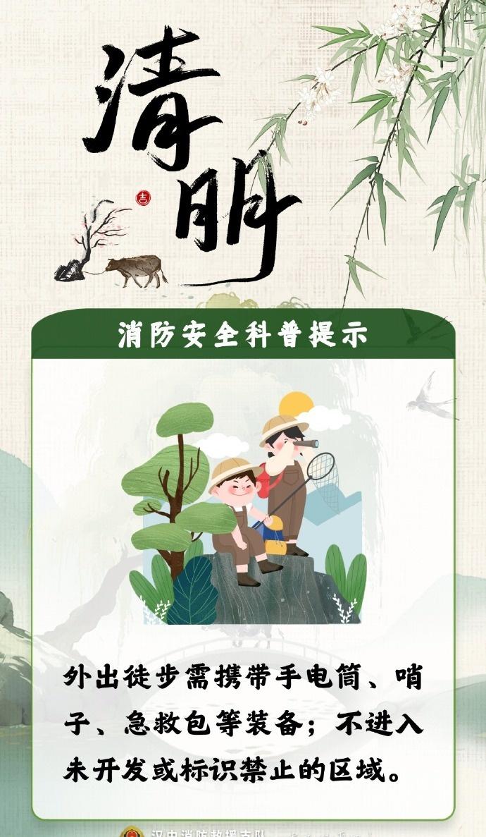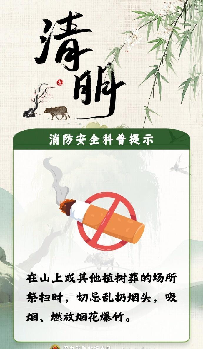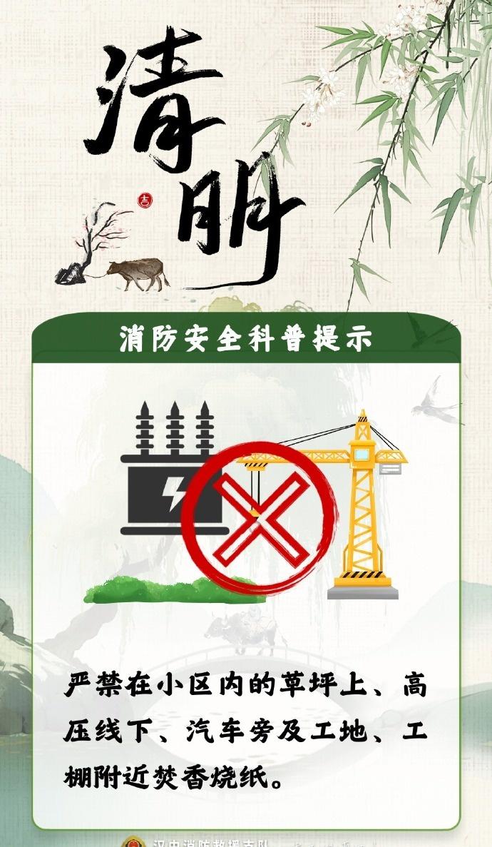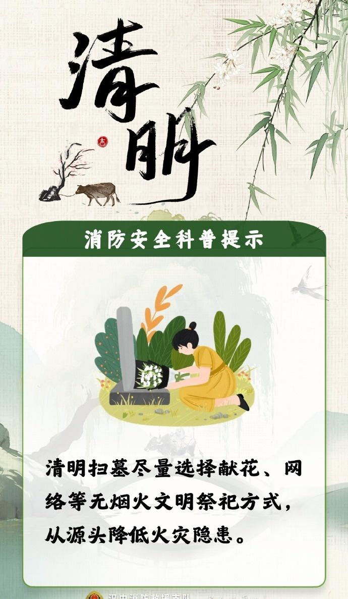 【清明将至,防火第一!这份祭扫安全提醒请收好】清明假期安全提示清明拼假4天休9天 缅怀先人,更要守护生者。这些安全底线请大家务必牢记: 🚫 挑好位置: 祭扫时绝对远离林区杂草等易燃物品; 🚫 改变习惯: 尽量不随意焚烧纸钱、燃放鞭炮,倡导鲜花祭扫; 人走火灭: 若有明火,离开前务必反复确认火源已彻底熄灭! 星星之火,可毁万亩林。严防山林火灾,一起守护我们的绿色家园! 编辑:孙玥 审核:王钢 发布:姚峰)