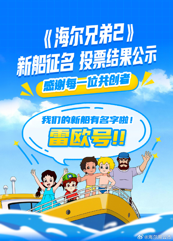 #周云杰公布海尔兄弟新船名#:大家好,最近发起的为海尔兄弟新船名投票,得到了大家的热情参与。在12个候选名字里,“雷欧号”以23.42%的得票率稳居第一。的新船,以后有了响亮的名字:“雷欧号”!