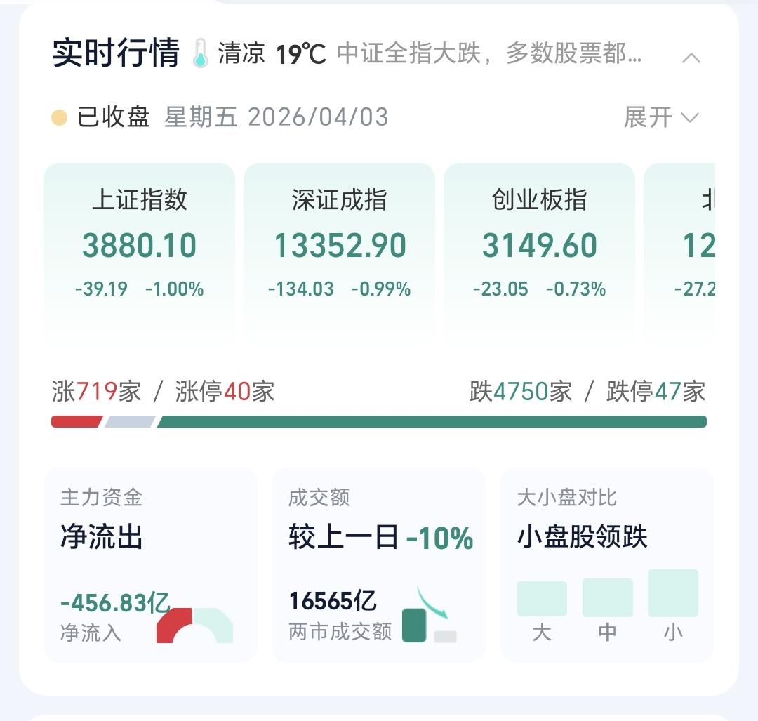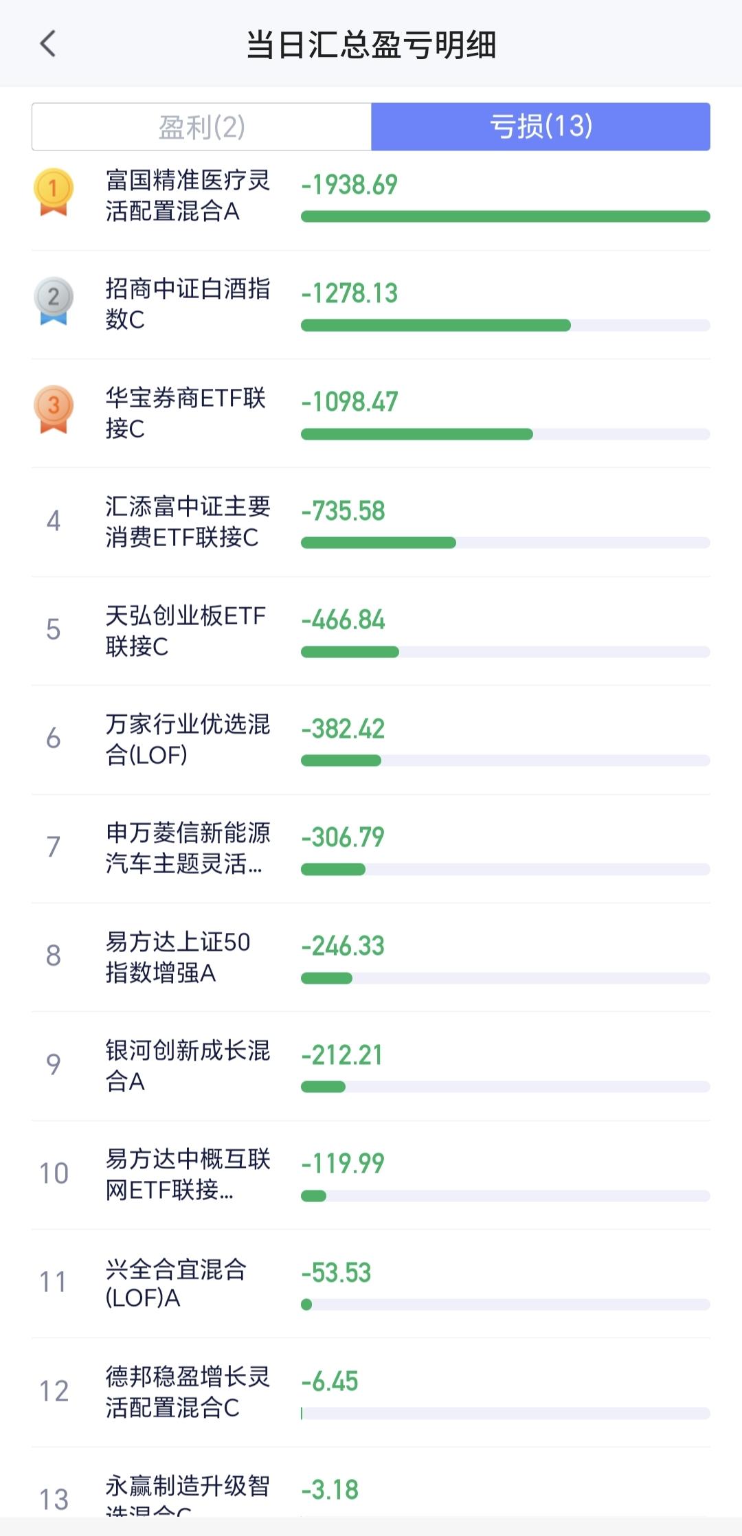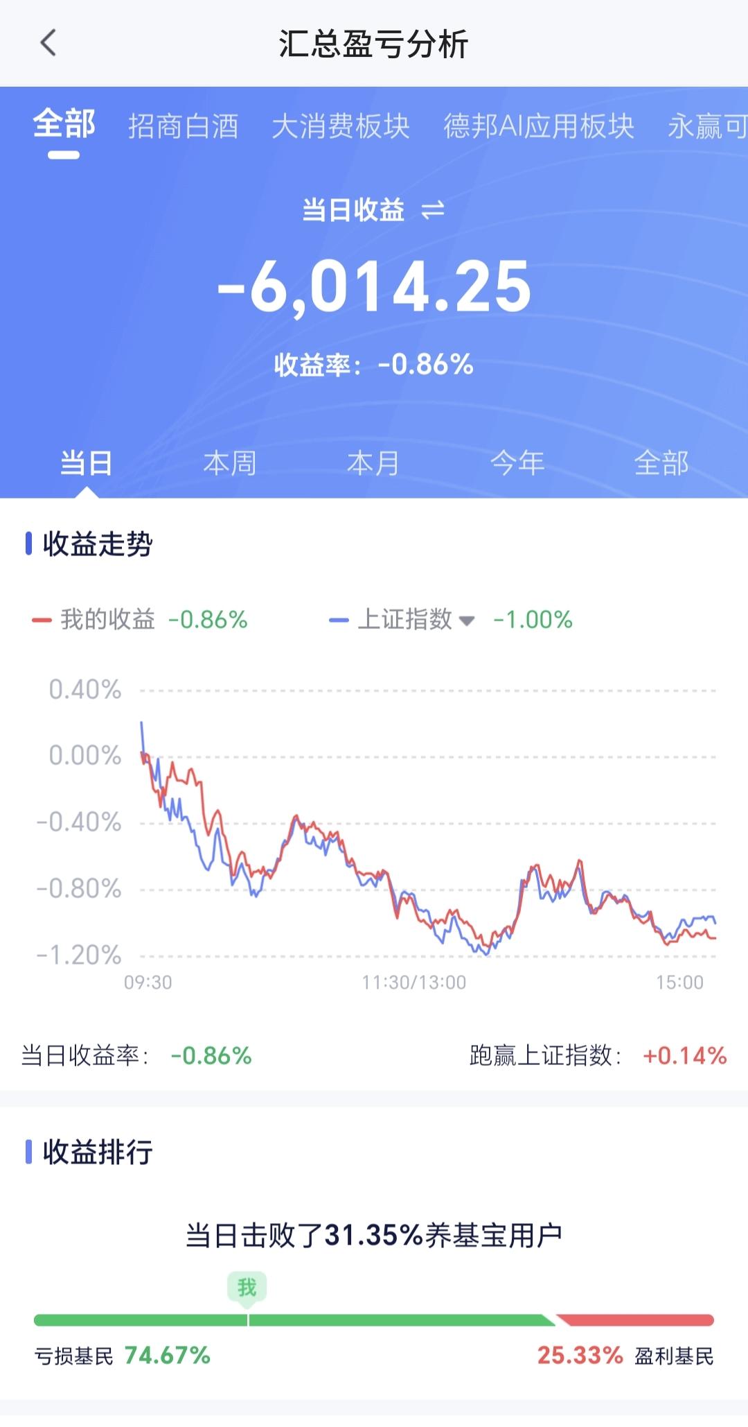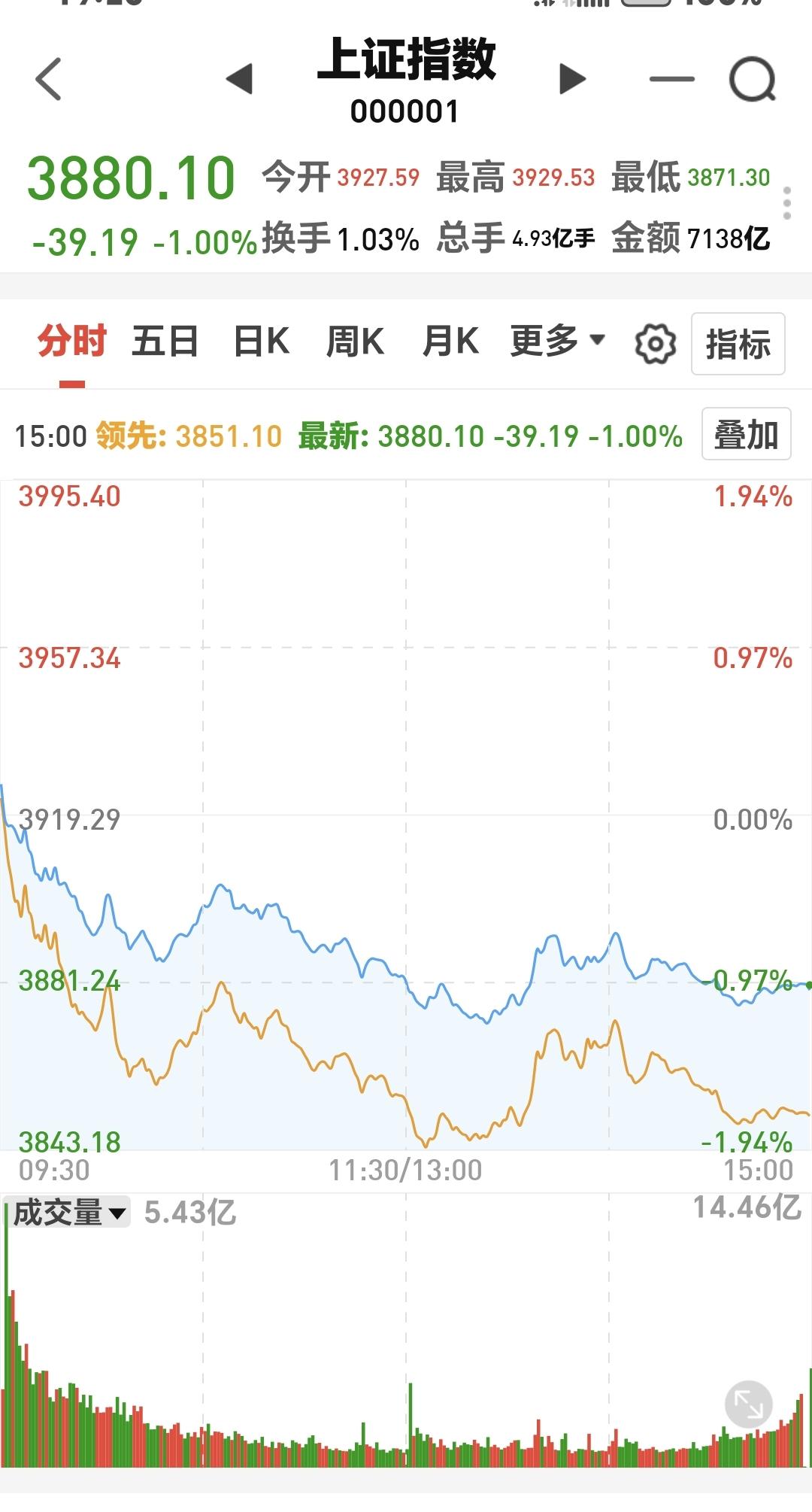 基金:市场这轮调整的几种可能走势 今天市场高开低走,收盘的时候三大指数都是下跌,创业板指下跌了0.73%,收于3149点,上证指数下跌了1%,收于3880点,下跌的幅度都不大。 整个股票市场,上涨719家,下跌4750家,涨40停家,跌停47家,上涨家数大幅度少于下跌家数。 持有的基金中,下午收盘的时候,估值盈利的只有5G板块和军工板块,估值亏损金额最大的三个板块是:创新药板块,白酒板块,证券板块,估值整体亏损了6014元。 整个基金市场,上涨7568家,下跌12021家,上涨幅度超过5%的2家,没有下跌幅度超过5%的基金。 图9是今天板块的上涨排行榜,上涨幅度最大的三个板块是:CPO板块,通信板块,人工智能板块,图10是今天板块的下跌排行榜,下跌幅度最大的三个板块是:光伏板块,煤炭板块,电力板块,图11是今天基金的加仓和减仓人数,加仓25611742人,减仓17762693人,加仓人数超过了减仓人数。 整个市场主力资金净流入最多的三个板块是:通信板块,5G板块,通信设备板块,主力资金净流出最多的三个板块是:国企板块,蓝筹板块,光伏板块。 连续两个交易日的下跌,指数来到了3900点的下方,让许多人很难受,现在难受的人,都是在高位区域没有风险意识的人,都是在4000点上方,不相信指数会跌破4000点的人,都是认为牛市当中,不会有下跌的人,他根本不知道自古牛市多急跌。 从去年的3040点,上涨到了今年的4197点,总共上涨了4197-3040=1157点,这个过程当中没有一个像样的调整,但市场不可能像这样一直上涨上去,没有过像样的调整,不代表后面就不会有像样的调整。 1:如果市场进行浅调整,调整的幅度为:1157×0.382=442点,调整到达的位置为:4197-442=3755点 2:如果市场进行中调整,调整的幅度为:1157×0.50=579点,调整到达的位置为:4197-579=3618点 3:如果市场进行深调整,调整的幅度为:1157×0.618=715点,调整到达的位置为:4197-715=3482点 上周一调整的低点为3794点,连浅调整的位置都没有能够到达,更不要说中等调整和深调整的位置了。 我们对市场要有足够的敬畏,在4200点左右的时候,你就要有市场会进行深度调整的思想认识,如果你有了这样的思想准备,现在的调整对你来说就是小菜一碟,而且,你还会为没有进行深度调整感到庆幸,就是认知上的差别,很多的烦恼是自寻烦恼,很多的烦恼是因为认知缺失的烦恼,但有些人会把这些烦恼的怒火抛向市场,吐槽市场的各种坏,从来没有从自身找原因。 我最近一直都不敢把这三个调整的点位告诉大家,通知大家背上更重的心理负担,我这样讲,并不是我愿意市场下跌到那么低的位置,当然,我的愿意与否,也影响不了市场会下跌到哪里,我只是会从最坏处着想,做好最坏的思想准备,基金投资上是这样,现实生活中的很多事情也是这样的思维方式。 再看一下下面的截图13,这是我画的上证指数走势预演图,到今天收盘的时候为止,还没有确定现在是处于五浪下跌过程中,如果节后市场立即上涨,并且上涨突破3955点,那么5浪下跌的可能性就不大了,但有可能会演变为:4197点至3794点为a浪,3794点至3955点上方的那个点为b浪,B浪反弹结束以后,真正的杀跌浪c浪才到来,C浪下跌比前面的4197点至3794点的下跌会更加的快速和猛烈,会不会发生这样的情况,到现在为止都不能排除,具体是哪一种情况,需要节后继续观察。 即使现在处于五浪下跌中,后市跌破3794点,也不能保证这个五浪低点,就是这轮调整的最低点,如果节后开盘后的下跌速度非常快,比4141点至3794点那段的下跌速度还要快,不排除后面还会有六浪反弹,六浪反弹之后,还会有七浪下跌,如果这个五浪下跌的速度,慢于4141点至3794点的下跌速度,五浪低点大概率就是这轮调整的最低点。 这些内容我在平时开盘的时候都不敢给大家讲,讲了也有许多人看不懂,上面的内容看懂了的人在下面的评论区讲一下,你认为哪种情况的可能性最大?我认为现在是处于五浪下跌过程当中的可能性最大。 我写文章请大家过来欣赏,许多人看了以后,什么痕迹都没有留下,走的时候也是一声不吭,连一个点赞,连一句评论都不会留下,走的是那样的无声无息,这样的人是不地道的,没有做人最起码的准则,我不愿意与这样的人交朋友。