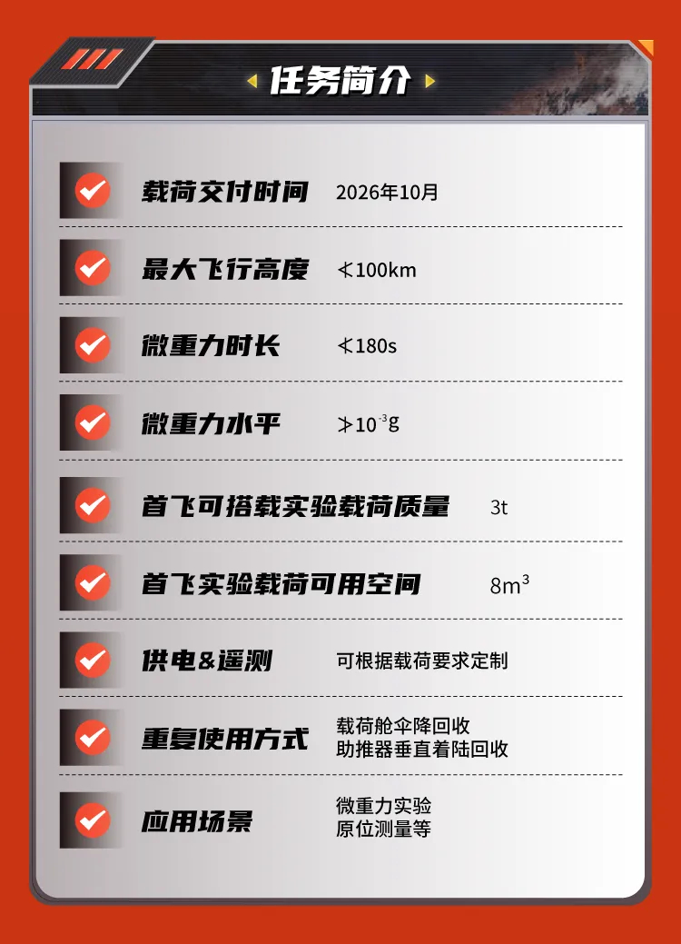 【力鸿二号可重复使用运载器载荷征集】力鸿二号是一款完全重复使用运载器,计划于今年执行首飞任务。主要用于开展微重力实验和近太空原位探测。依托载荷舱伞降回收技术和火箭重复使用技术,力鸿二号能够大幅降低空间科学实验成本实现科研设备与科学样本的安全回收与重复使用,为空间科学研究提供稳定、高效、可持续的实验平台。