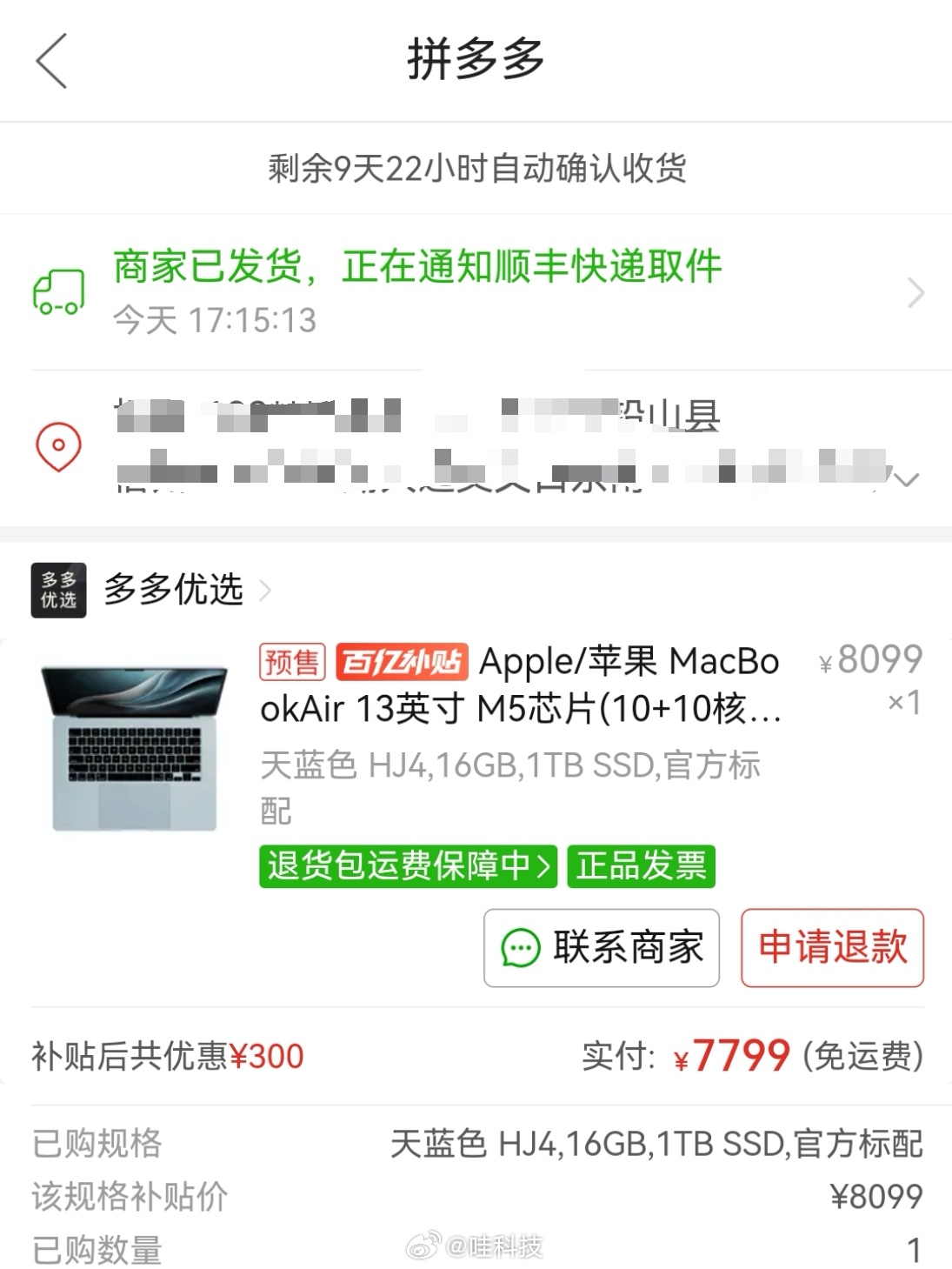这到底算不算消费降级,之前MacBook Pro 13英寸M1 2020,内屏不是一直闪,我终于忍不了了,所以昨天去拼多多百亿补贴买了台MacBook Air 13英寸 M5,16G+1T版本,天蓝色,7799入,今天发货了!