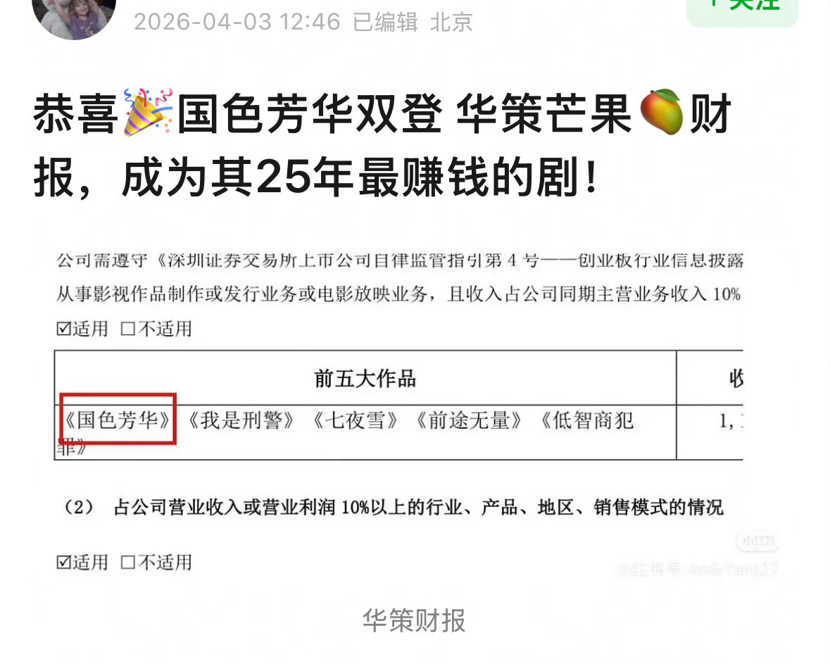 杨紫国色芳华登上华策芒果财报,杨紫和华策合作五次四登财报!
