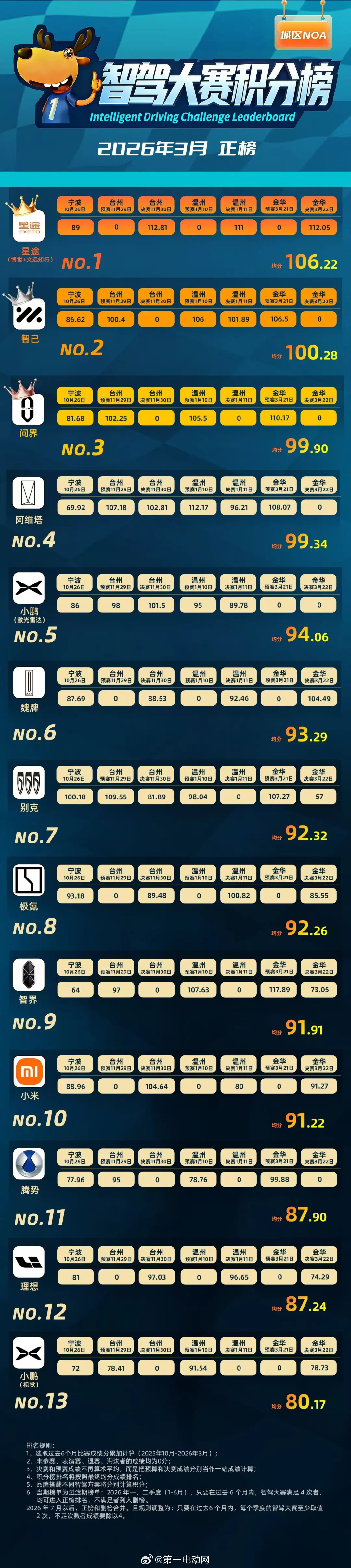 🏆 2026年3月积分总榜核心看点榜首易主:星途(博世+文远知行方案)以均分106.22分跃升第一,智己(100.28分)紧随其后,问界(99.90分)跻身三甲。最大黑马:星途(地平线HSD方案)虽因参赛仅2站列副榜,但金华站决赛110.43分逆袭亚军,单站实力惊人。剧烈滑落:理想、小鹏(激光雷达)、腾势排名大幅下降,园区内部路成“四大天王”集体滑铁卢。
