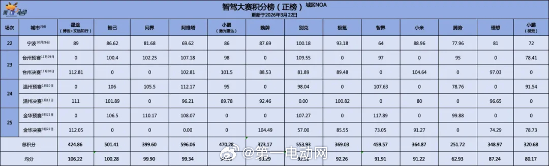 岚图(华为ADS)|2站均分110.41分(温州预赛107.81、金华预赛113)享界(华为ADS)|1站107.78分(金华预赛)深蓝(华为ADS)|1站102.53分(台州预赛)星途(地平线HSD方案)|2站均分99.86分(温州决赛89.28、金华决赛110.43,逆袭亚军)仰望(Momenta)|3站均分97.43分(宁波97.91、台州预赛93、金华预赛101.38)蔚来(蔚来世界模型)|3站均分91.46分(宁波78、台州决赛99.38、金华决赛97,缺席温州站)特斯拉(FSD)|2站均分82.35分(宁波83.86、台州决赛80.83,缺席温州、金华)尊界(华为ADS)|1站75.12分(宁波)