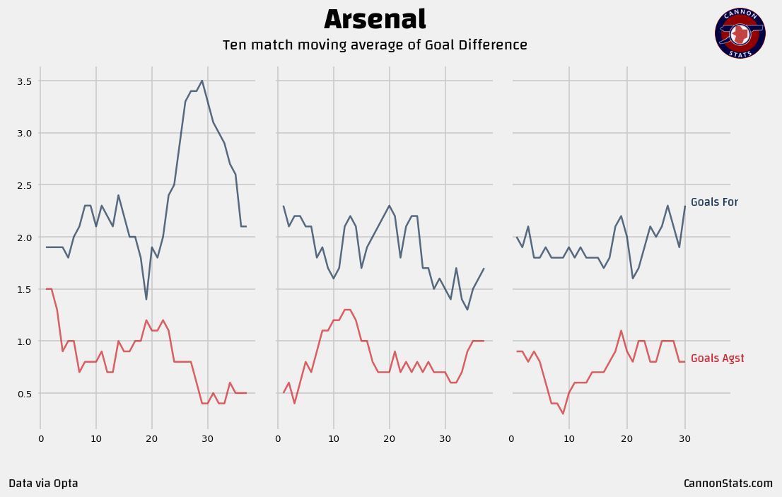 阿森纳本赛季近10场比赛的进球数和预期进球数移动平均值。阿森纳本赛季表现极其稳定