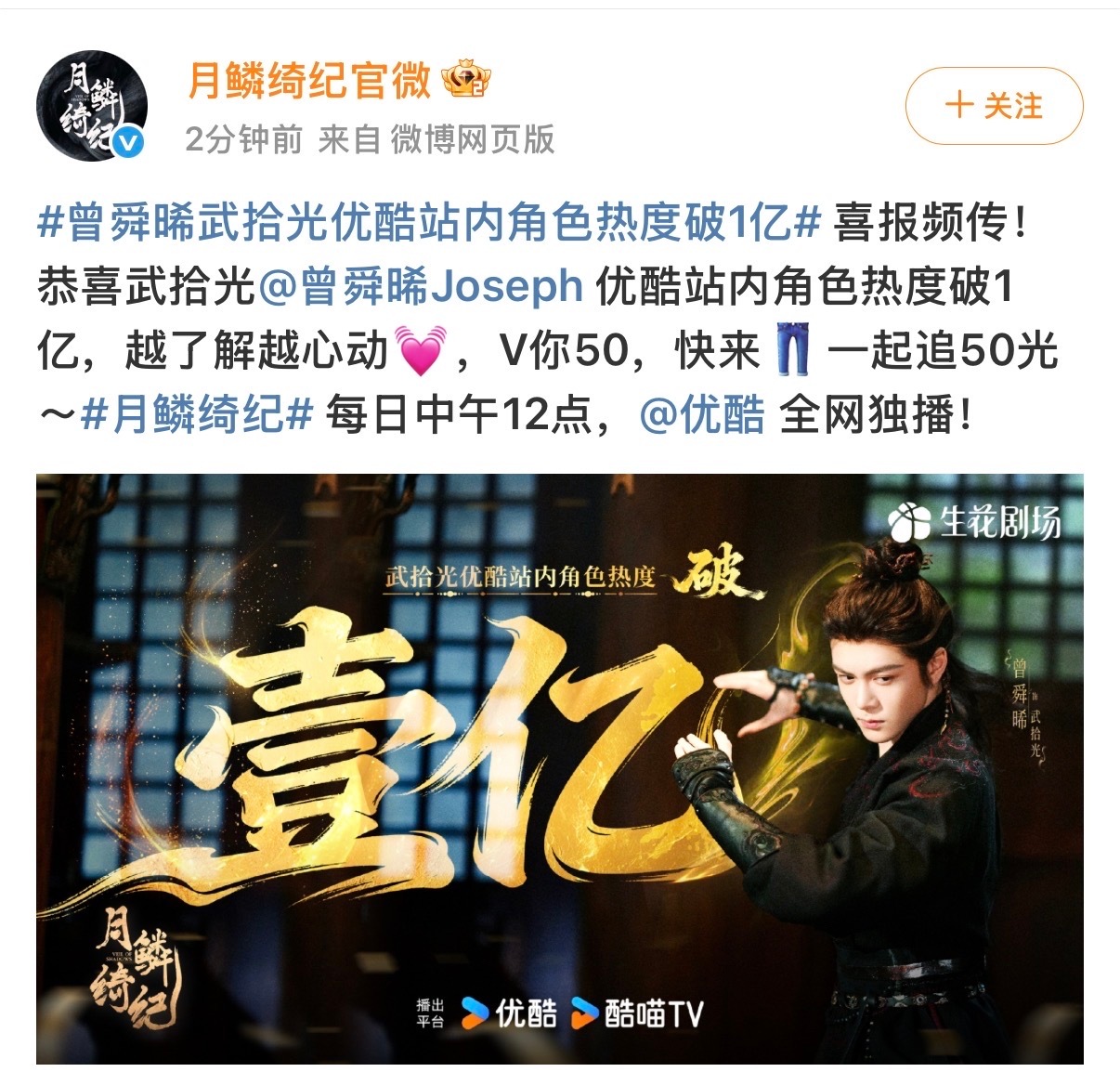 曾舜晞武拾光角色破亿了,成为优酷平台首个角色热度破亿男主且首个男性角色牛批