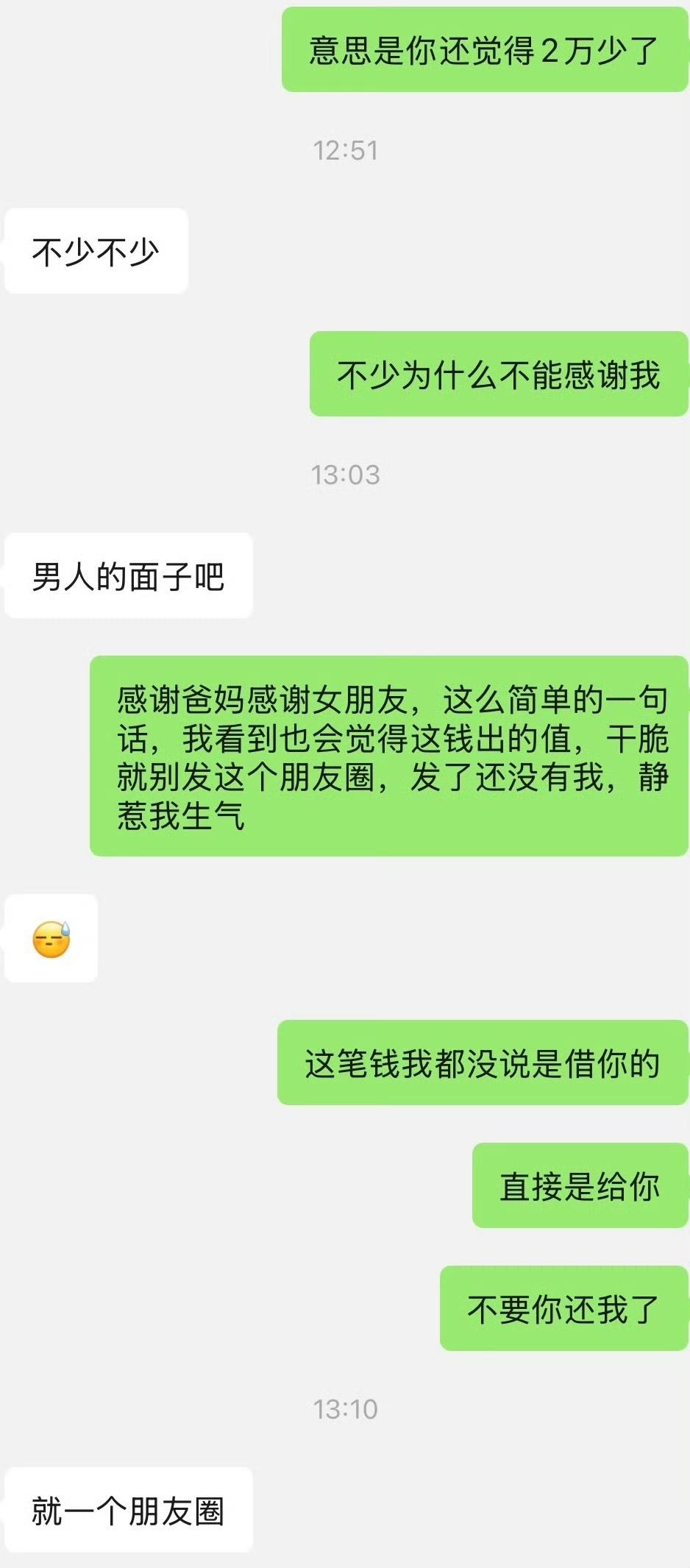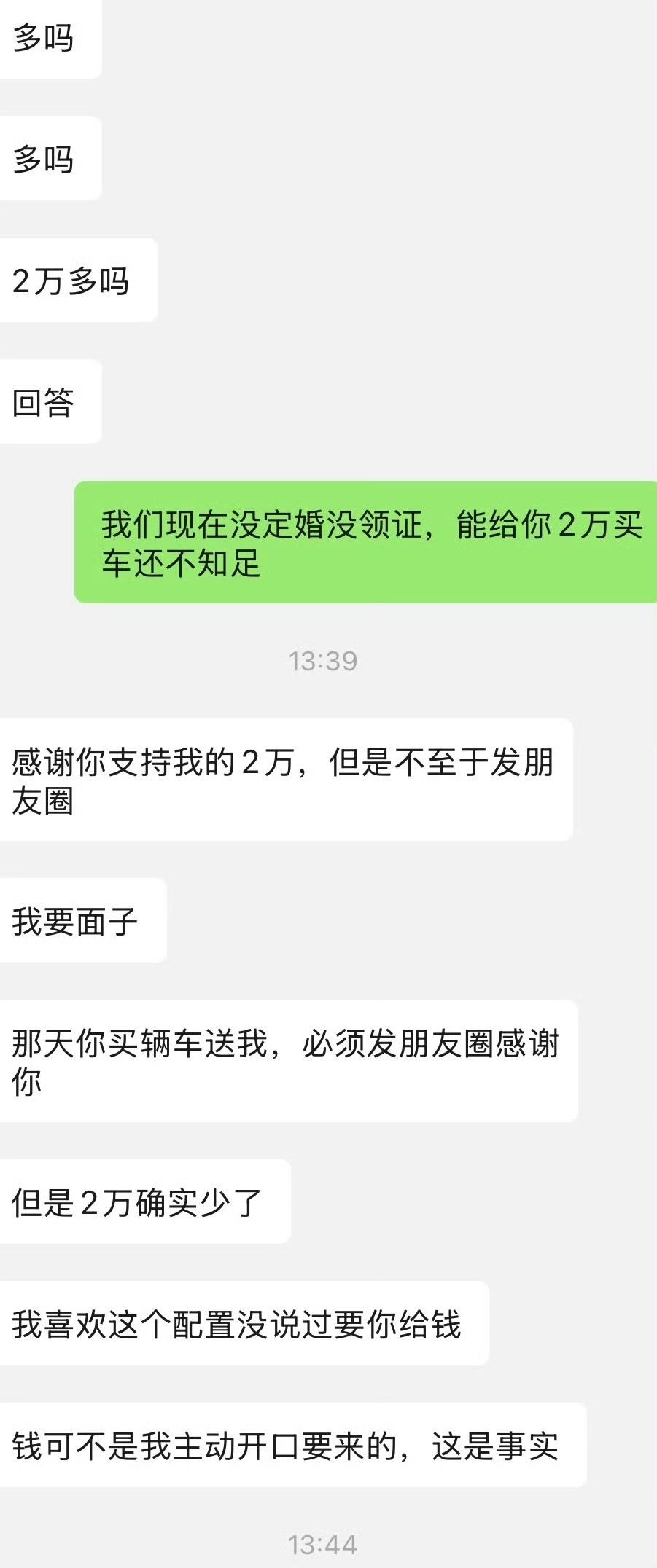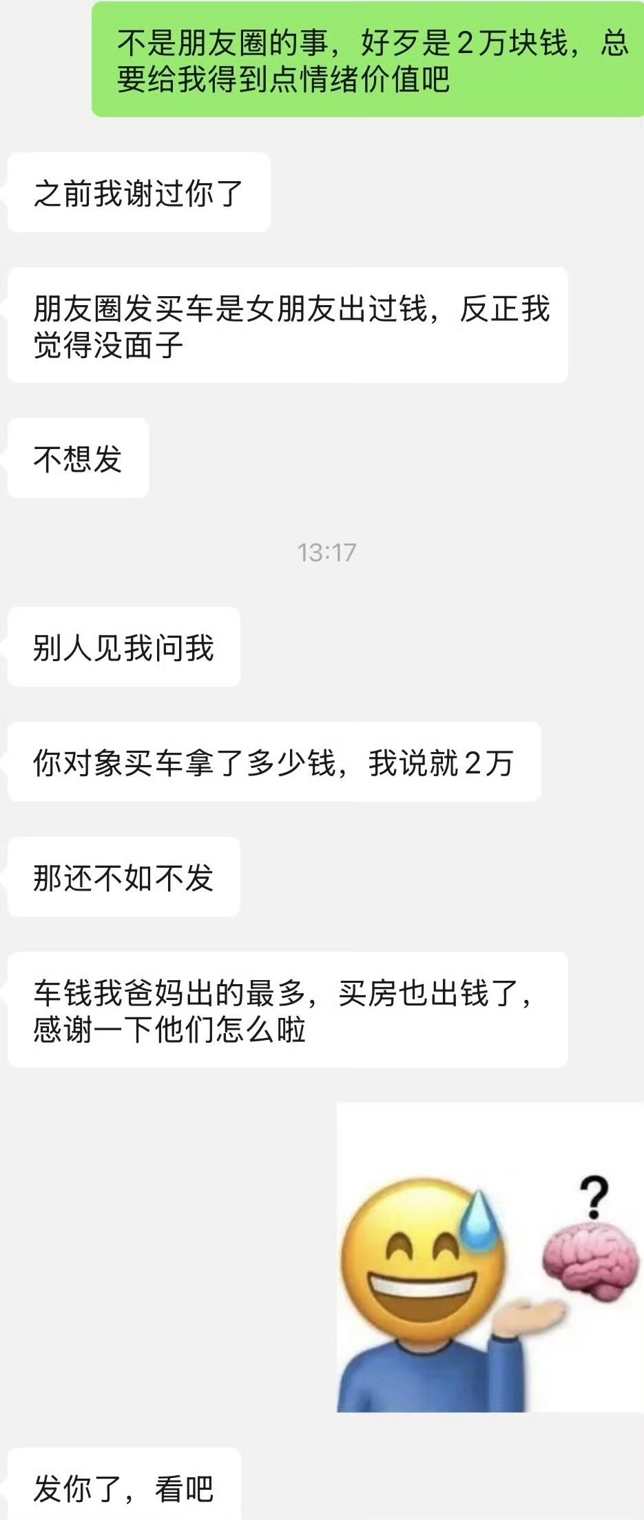 男朋友买车女子赞助 2 万,发朋友圈感谢爸妈,却不提女朋友,女子看到气炸了。直接质问男朋友为啥他买车,微信朋友圈里面专门感谢父母,却不提她。男朋友回复说如果朋友们知道他用了女朋友的钱,这样会显得没面子。女朋友回怼 2 万不是 2 块,如果不是他们有特殊关系,谁会白给他 2 万块钱?女朋友要他把微信朋友圈删了,重新发。男子坚决不同意,说这是面子。看来她的男朋友比较大男子主义,为了买车拿了父母的钱硬要高配,女朋友给他赞助 2 万,可是为了面子却死不承认女朋友的贡献,做人非常虚伪、自私。