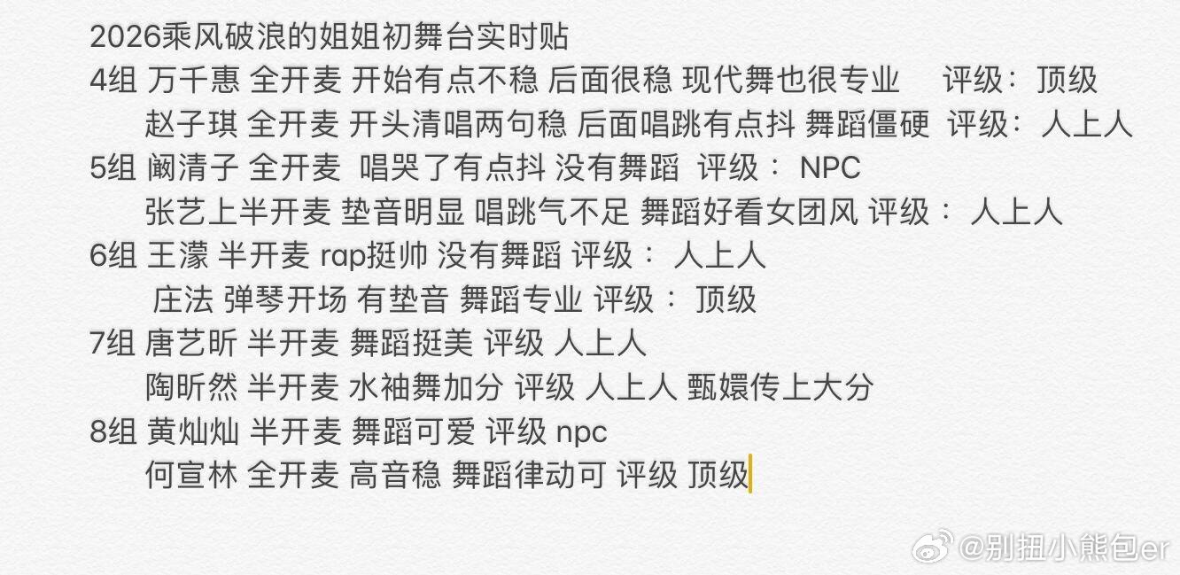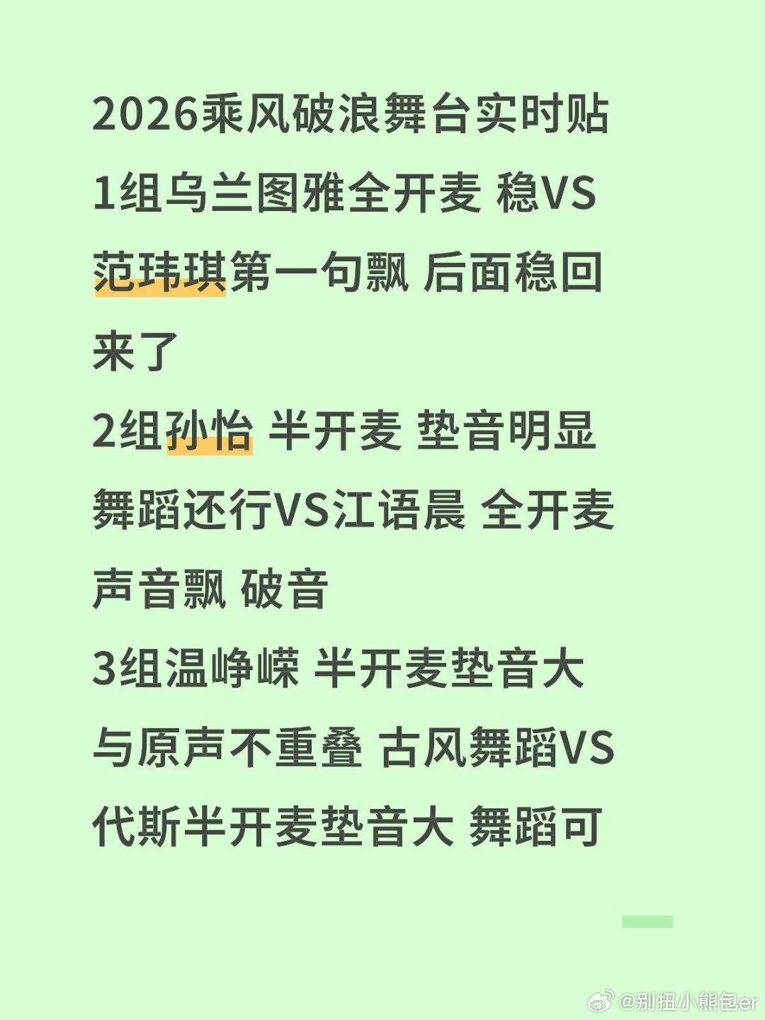 2026乘风破浪舞台实时贴1组乌兰图雅全开麦 稳 评级 夯VS范玮琪第一句飘 后面稳回来了 评级 顶级2组孙怡 半开麦 垫音明显 舞蹈还行 评级 人上人 VS江语晨 全开麦 声音飘 破音 评级NPC3组温峥嵘 半开麦垫音大与原声不重叠 古风舞蹈 评级 NPCVS代斯半开麦垫音大 舞蹈可 评级NPC