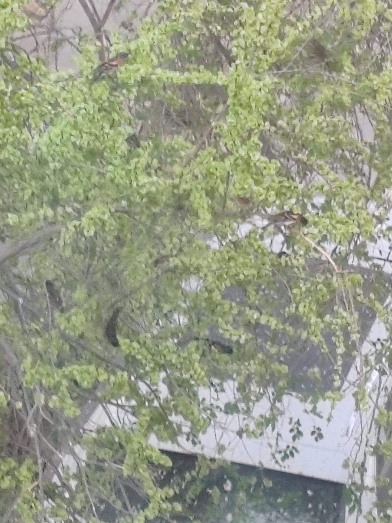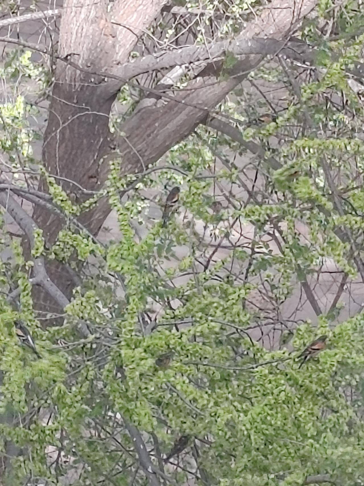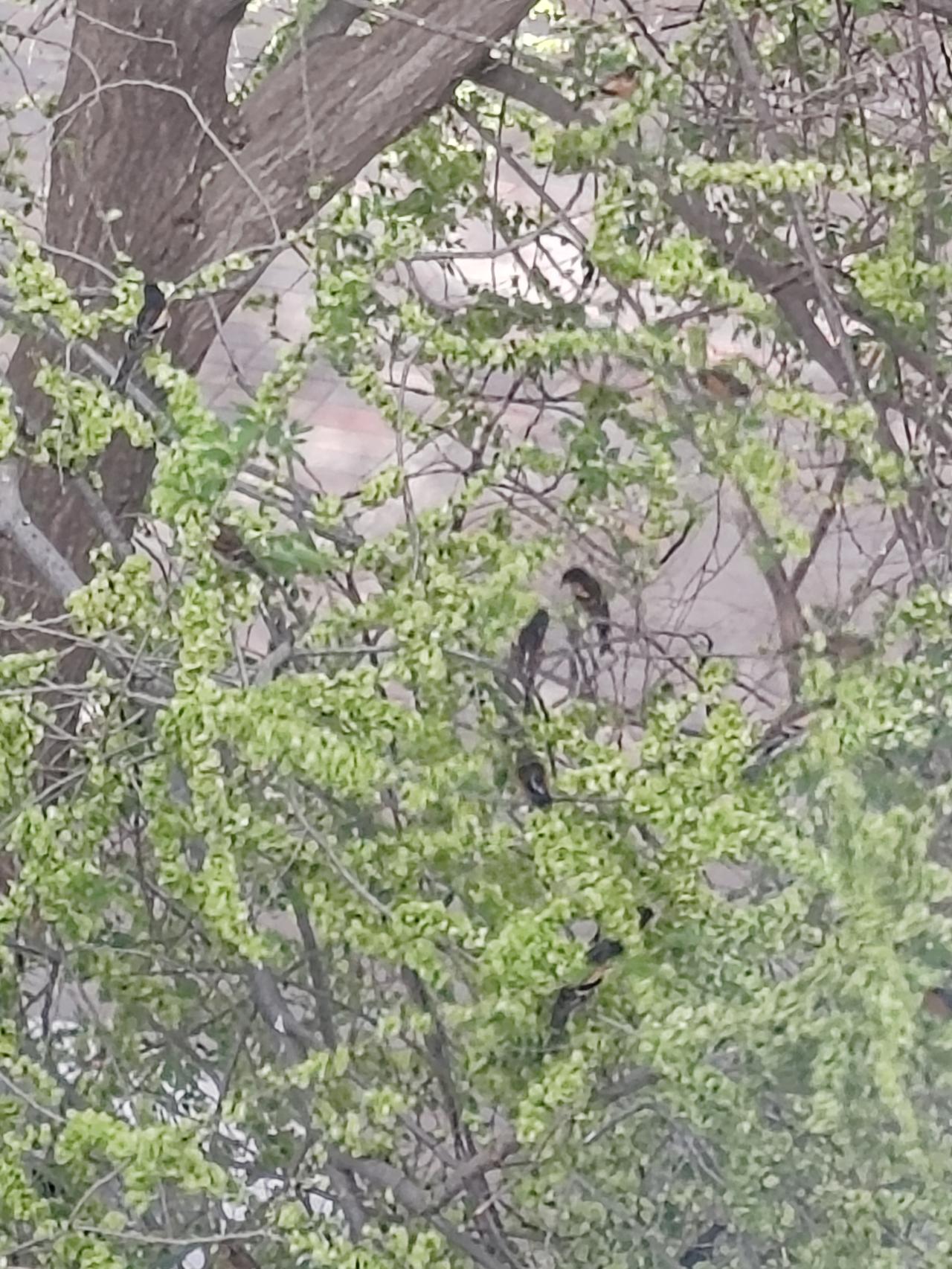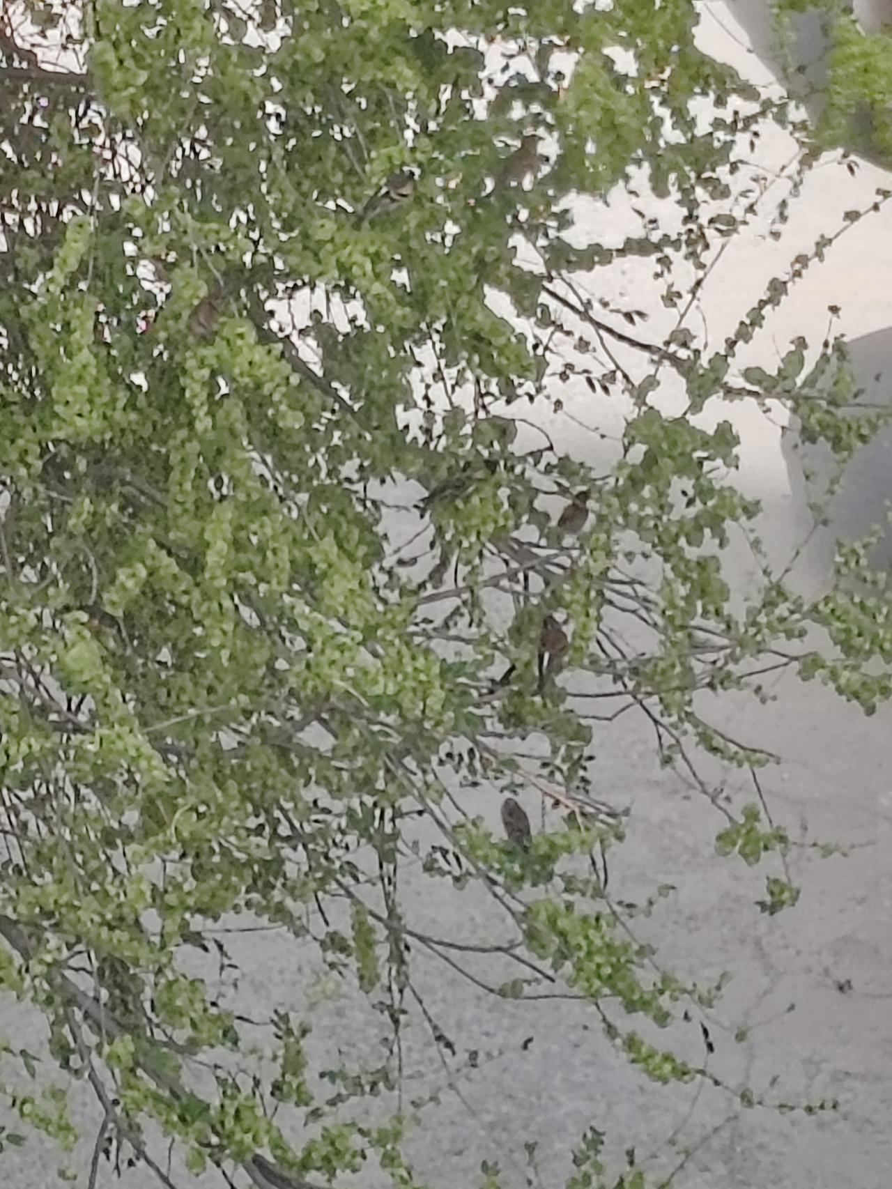一树榆钱一树鸟,上窜下跳吃个饱。咣当一声传异响,轰隆一片全飞了。 今日上午拉开东窗的窗帘,看到浓密的榆钱丛中小鸟在欢快的上窜下跳着觅食,很是可爱,就拿出手机拍了起来。突然咣当一声从隔壁院里传来一声异响,轰隆隆一大群鸟象一片黑云从树中飞出,直奔不远处的杨树。稍顷见平安无事又飞回觅食。隔了一会,又是一声响动,鸟群又惊飞就高,又去而复返。看着这可爱的小生灵,看着这春日美景,心中怦然一动,随手写了一首打油诗,记录这个美妙的时刻。