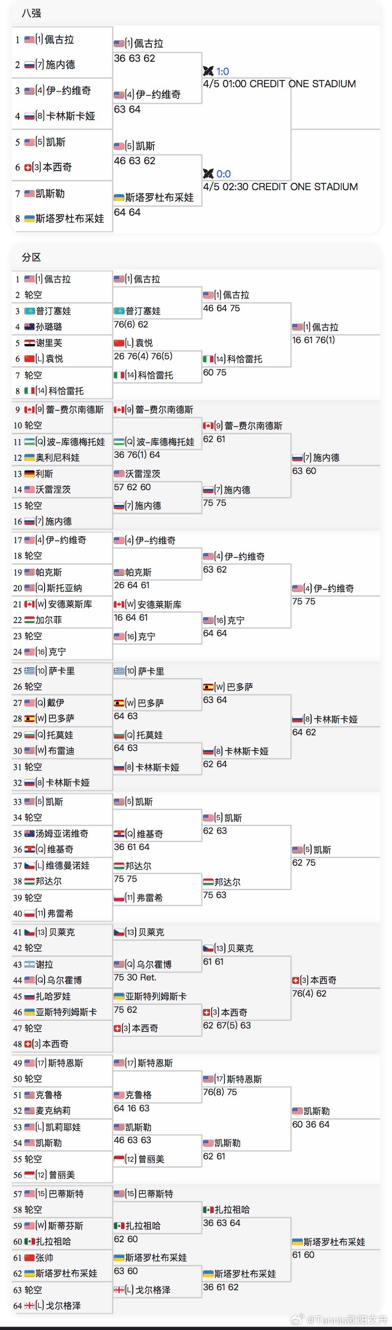 🟠WTA500查尔斯顿女单四强【1】🇺🇸佩古拉vs【4】🇺🇸约维奇【5】🇺🇸凯斯vs🇺🇦斯塔罗杜布采娃