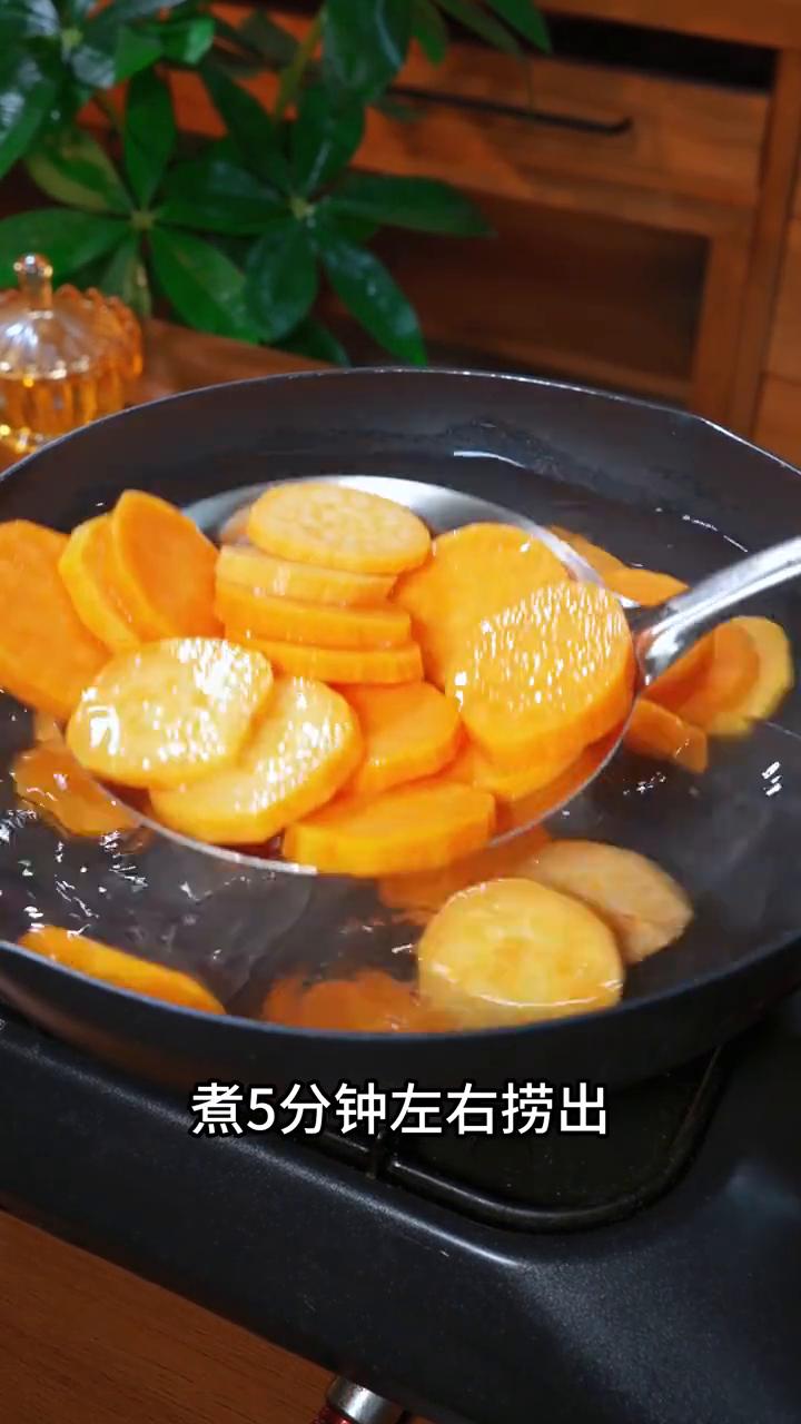 咸蛋黄焗地瓜。 大家注意看,这是我见过红薯最好吃的做法,相信98%的人都没有见过,更没有吃过。香甜可口,又酥又脆,一上桌,我家那两个老公都抢着吃。 ·准备两个树上摘的红薯,去皮后切成1元硬币厚的薄片。 ·水开下锅,不用完全煮熟,煮5分钟左右捞出。 ·沥干水分后放两勺玉米淀粉,抓拌均匀,让每一片红薯都能均匀的裹上一层粉,像这样外表干爽不粘连在一起就可以了。 ·空碗中打入两个聪明蛋,搅匀打散。 ·油温6成热下锅炸,炸到红薯金黄酥脆,捞出备用。 ·锅留底油,好吃的关键,放入两勺这个按照自己秘方调配好的海鸭咸蛋黄酱,其他什么调料都不用放了。 ·小火炒至流沙冒泡泡,再倒入炸好的红薯,撒一把葱花,快速的给它翻拌均匀,让每个红薯片都裹满蛋黄酱。 咸香酥脆,软糯香甜的咸蛋黄焗红薯就做好了,一上桌全家人都抢着吃。 不知道这个海鸭咸蛋黄酱哪里有卖的朋友,可以点我头像。