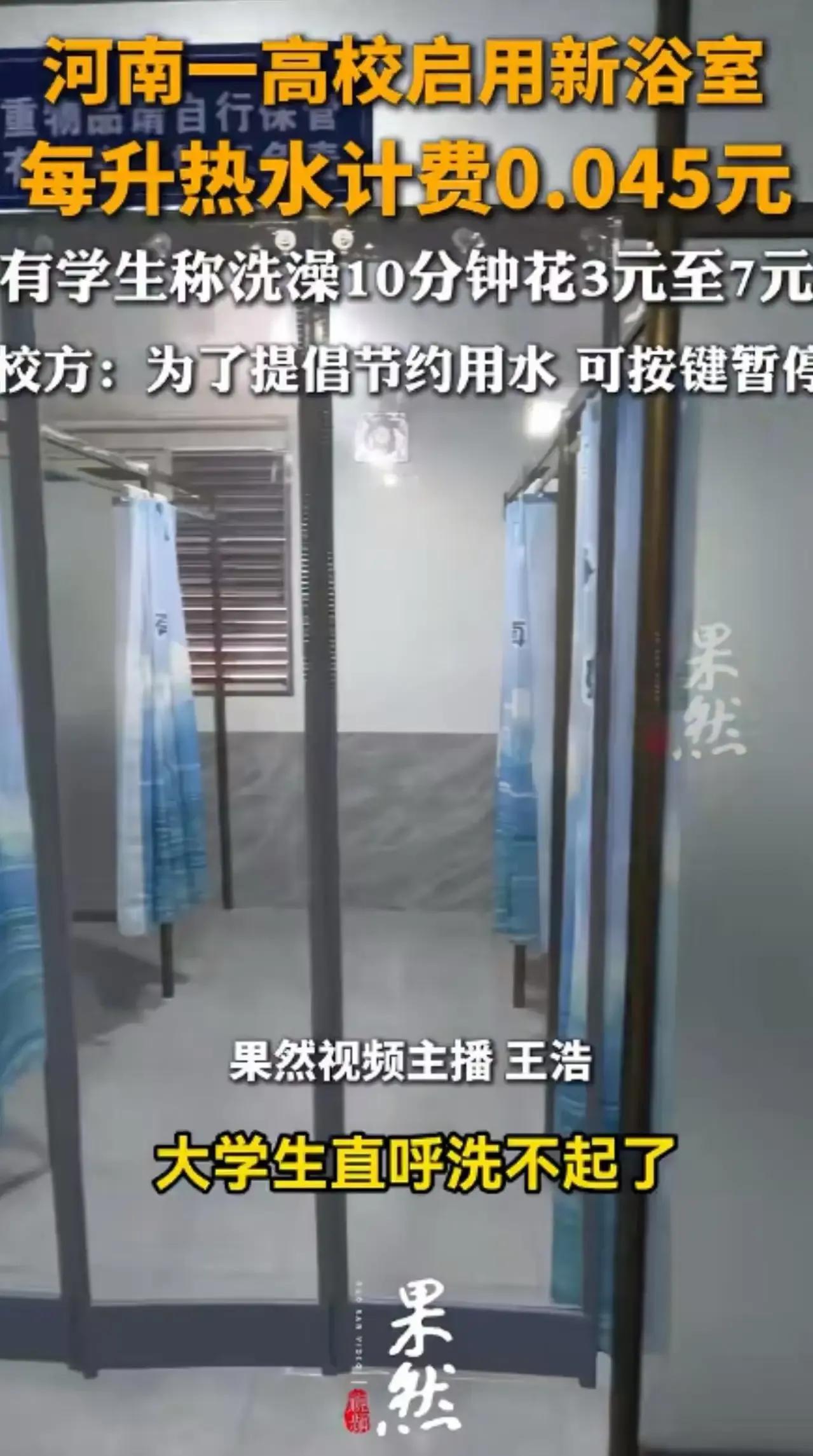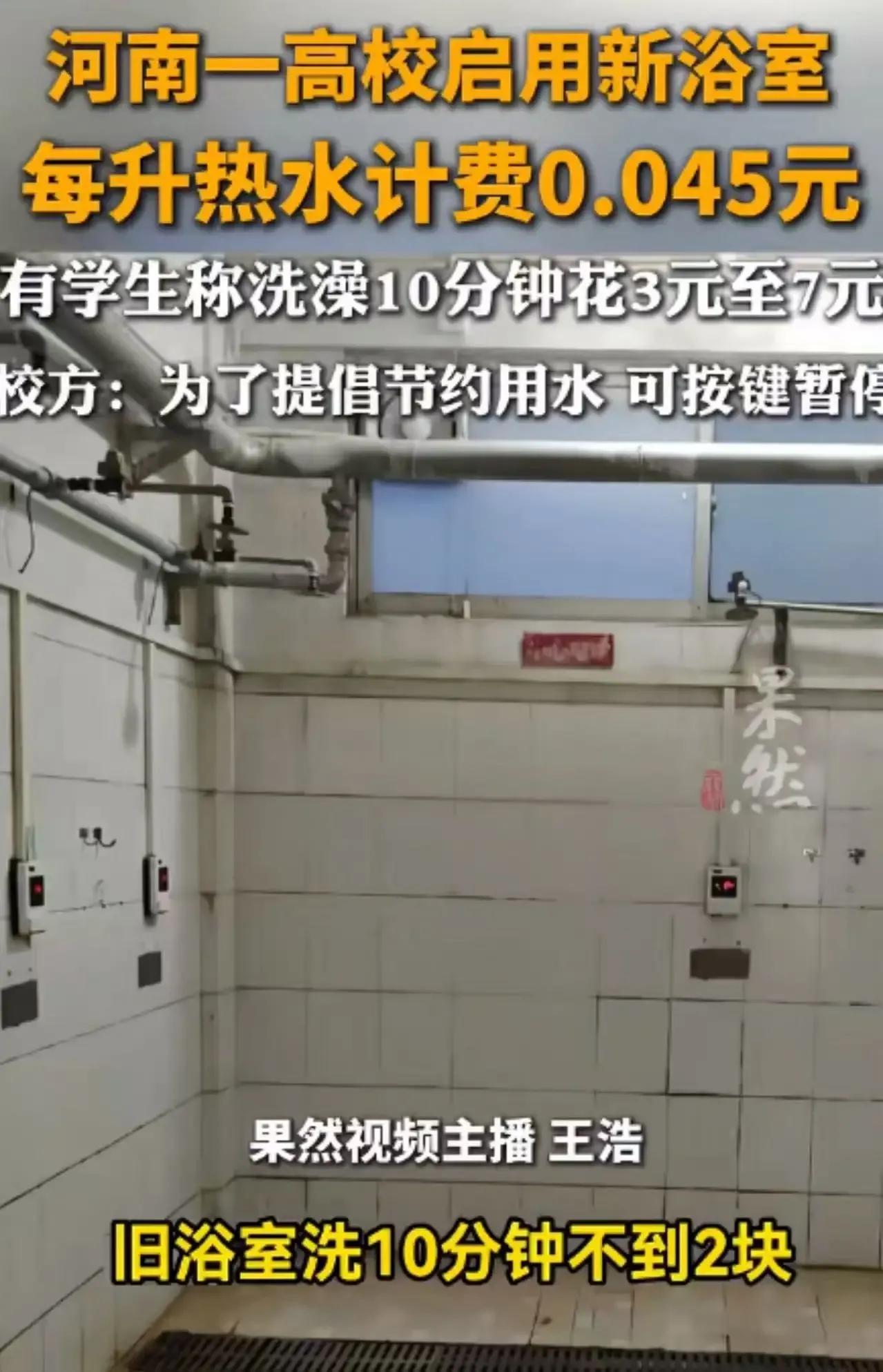 大学生洗澡也要“精打细算”了?河南某大学新浴室竟然按流量计费,洗个澡10分钟就要花掉7块钱,这价格让不少学生直呼“洗不起”! 据了解,这所大学新浴室采用了按流量计费的方式,学生们实测发现,洗10分钟澡竟然要花费3至7块钱不等。如果按照每天洗澡的习惯来算,一个月下来竟然要花费200来块钱,这对于生活费有限的大学生来说,无疑是一笔不小的开支。学校后勤部门对此回应称,此举是为了提倡节约用水,避免不必要的浪费。然而,这一解释并未得到学生们的广泛认同。有学生表示,虽然节约用水是好事,但这样的计费方式实在让人难以接受,感觉洗澡都变成了“烧钱”的行为。更有网友调侃道,这哪是洗澡啊,简直就是在“烧钱”!不少学生开始寻找其他洗澡方式,比如去校外澡堂或者尽量减少洗澡次数,以应对这一高昂的洗澡费用。 节约用水固然重要,但这样的计费方式是否真的合理呢?学校是否应该考虑学生的实际需求和经济状况,寻找更合适的解决方案呢?大家快来评论区发表你的看法吧!校园热水收费 校园如厕 学生喝水收费