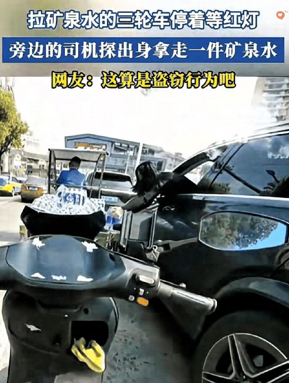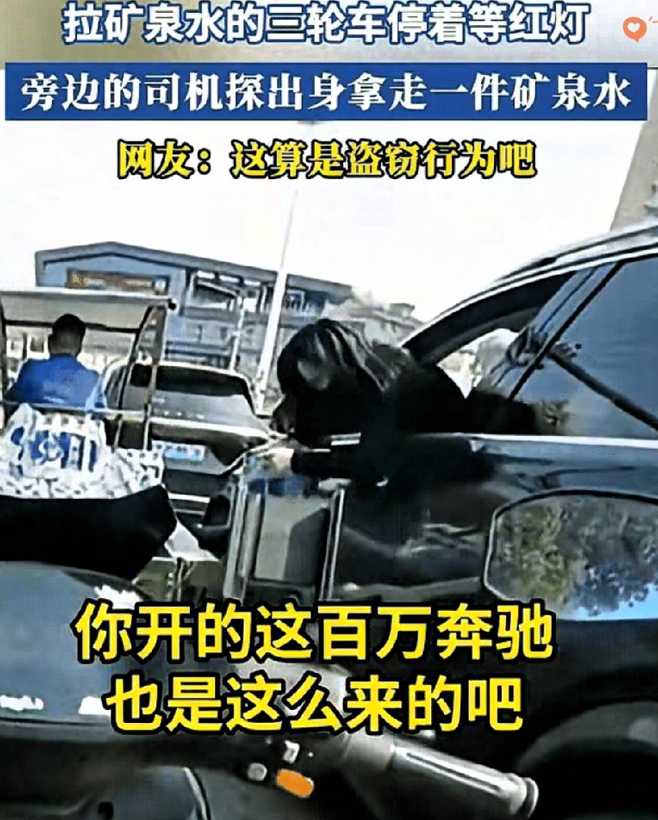 绿灯前的一幕真的把我看傻了! 一辆三轮车停在路边,旁边缓缓靠过来一辆奔驰。 谁能想到,下一秒奔驰车主直接探出身,飞快把三轮车上的一箱矿泉水掳进了自己车里。 平时拧个瓶盖都喊费劲的弱女子,碰上免费的东西,瞬间爆发出“力拔山兮”的劲头。 开着几十万的豪车,却干着这种上不了台面的事,真的挺讽刺的。 这哪里是差一瓶水的钱,分明是骨子里的贪小便宜在作祟。 有钱和善良从来都不是划等号的,别让物质的富足,喂大了内心的贫瘠。 你们见过哪些看着光鲜,做事却掉价的行为?
