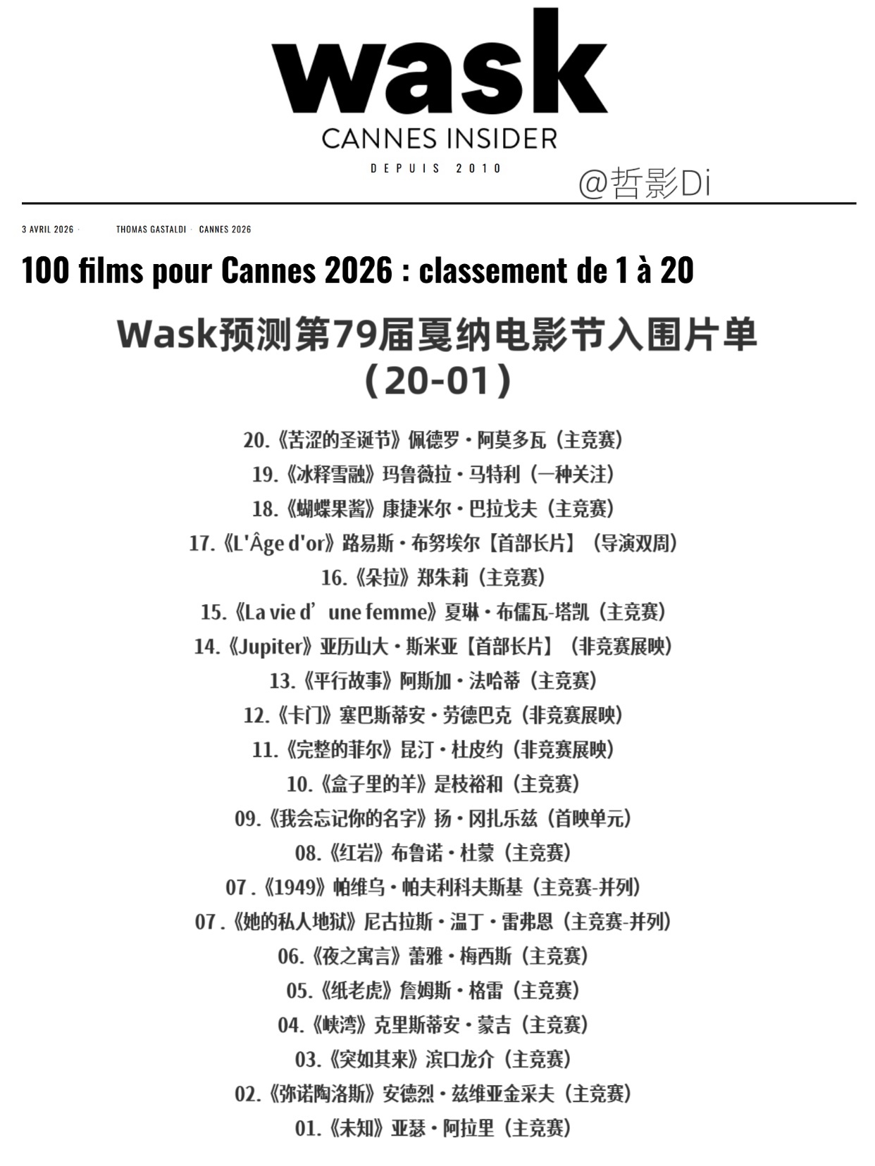 Wask预测100部第79届戛纳电影节入围片单(20-01)发布,主竞赛单元入围影片集中预测,20部影片里预测了15部主竞赛,包含是枝裕和、阿莫多瓦、滨口龙介、格雷、雷弗恩等导演的新片。预测片单如下↓ ↓ ↓